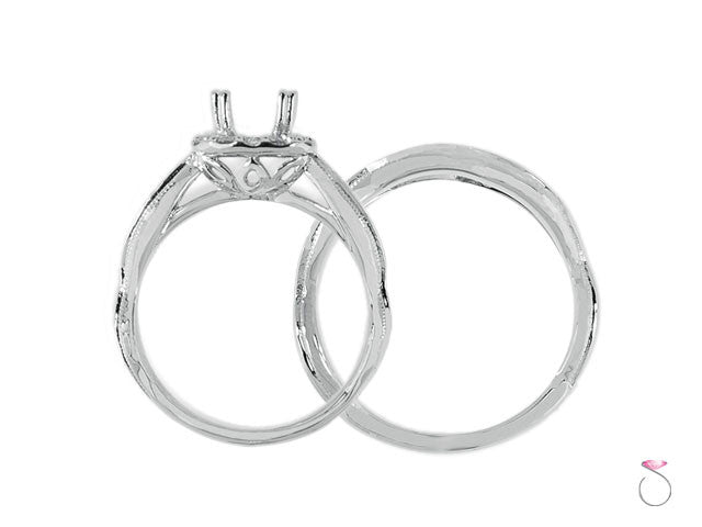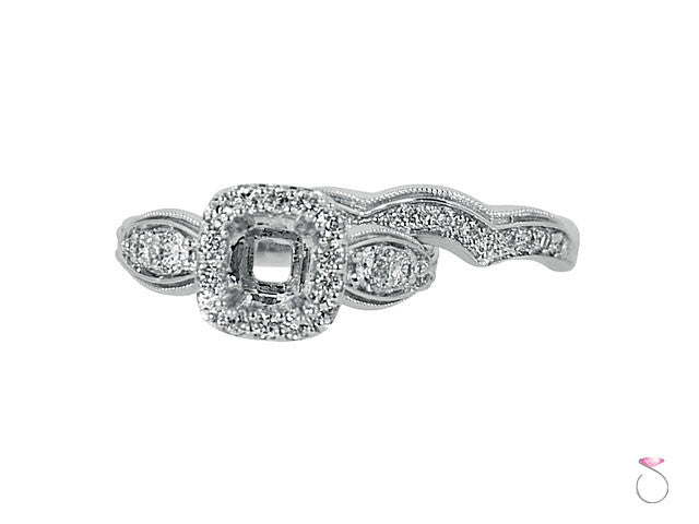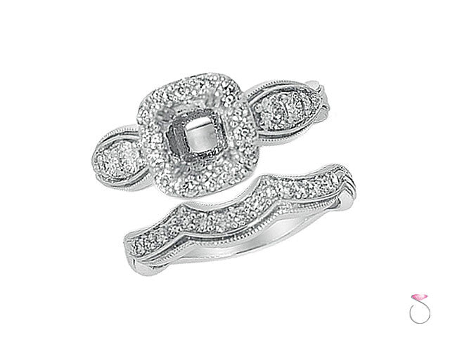 Elegant and refined Diamond halo engagement ring set in 14K white gold, with dazzling 0.79 ct tw. diamonds surrounded with mil-grain work. The engagement ring setting and the wedding band make a perfect match.