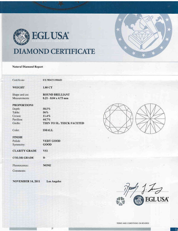 Round Cut Loose Diamond EGL USA Certified 1.80ct D-VS1 – SOLITAIRE JEWELERS