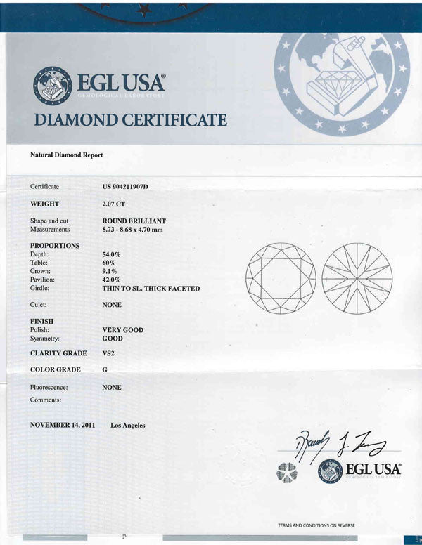 Round Brilliant Cut Diamond EGL USA Certified 2.07ct G-VS2 – SOLITAIRE JEWELERS
