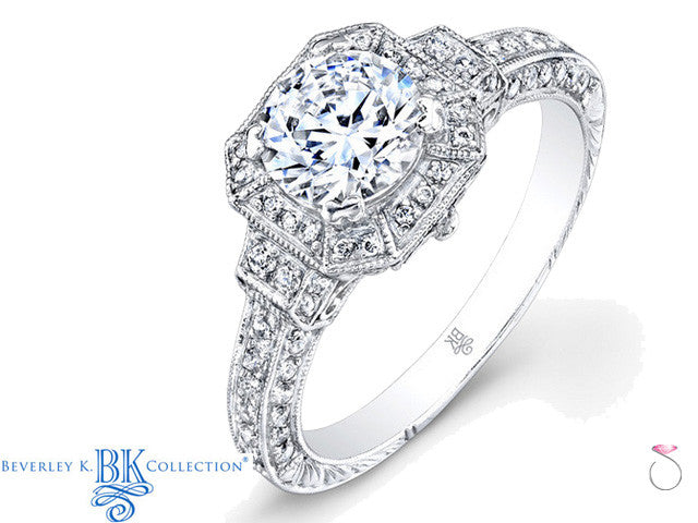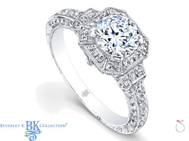 Intricately Crafted Halo style Beverley K engagement ring with a tone of details, the Halo is scalloped and set with G, VS diamonds surrounded with mil-grain work, the ring's shank is tapered and set with G, VS round brilliant diamonds, then mil-grained and the profile of the shank is hand engraved with a scroll design. Total diamonds on the ring is 0.41 carat set on 18K white gold.