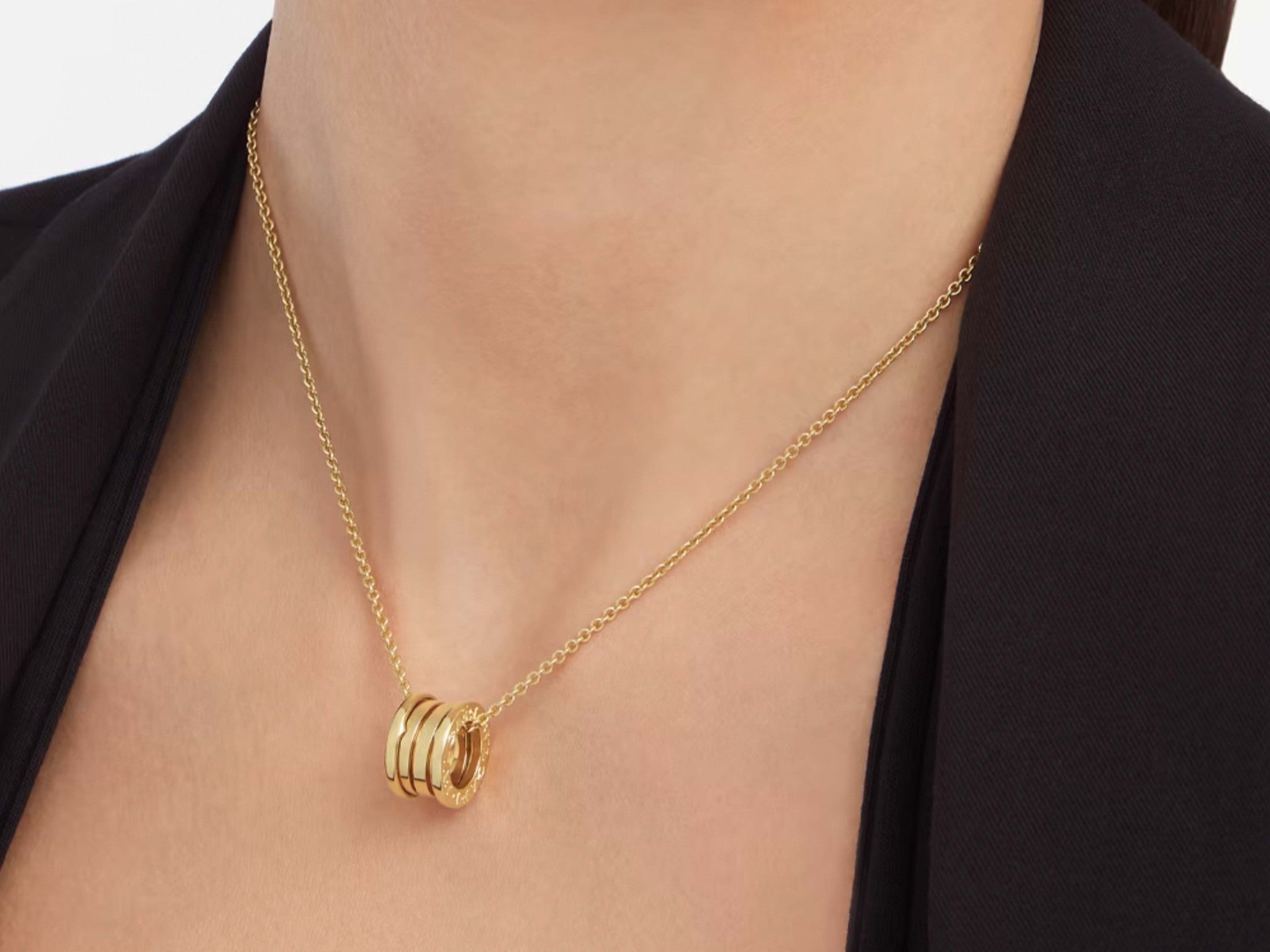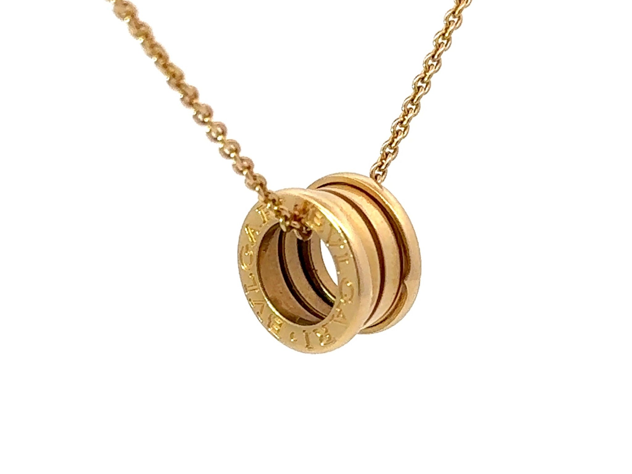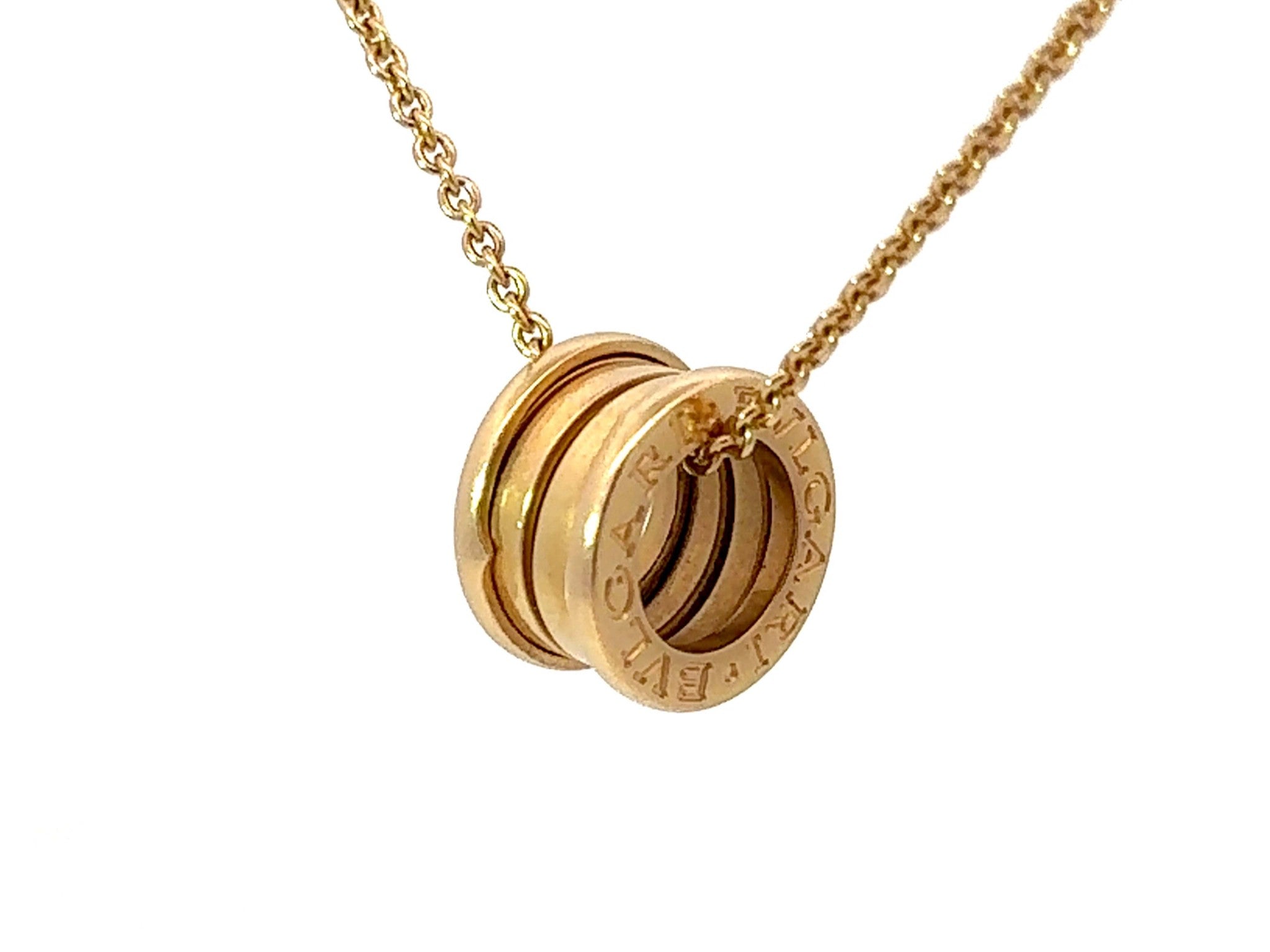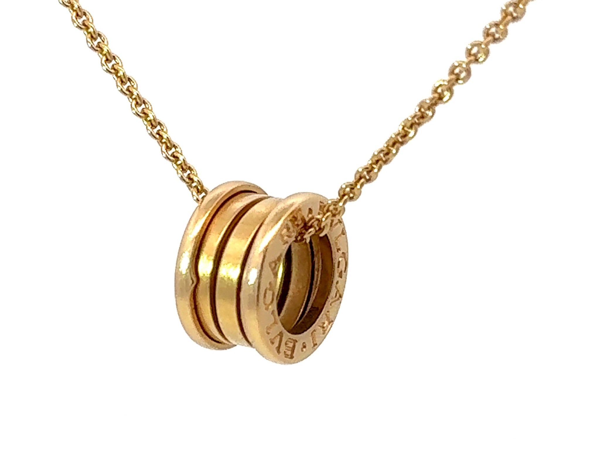 Drawing its inspiration from the most renowned amphitheater of the world, the Colosseum, the B.zero1 necklace is a true statement of Bulgari’s creative vision, challenging the very essence of jewelry design. The purity of its distinctive spiral is a metaphor for the harmony of past, present and future - reflected in the magnificence of the eternal city - and the emblem of the pioneering spirit of the collection. B.zero1 18kt yellow gold necklace with a small round 18kt yellow gold pendant. 14.60-17.70 in (38-45 cm) long."