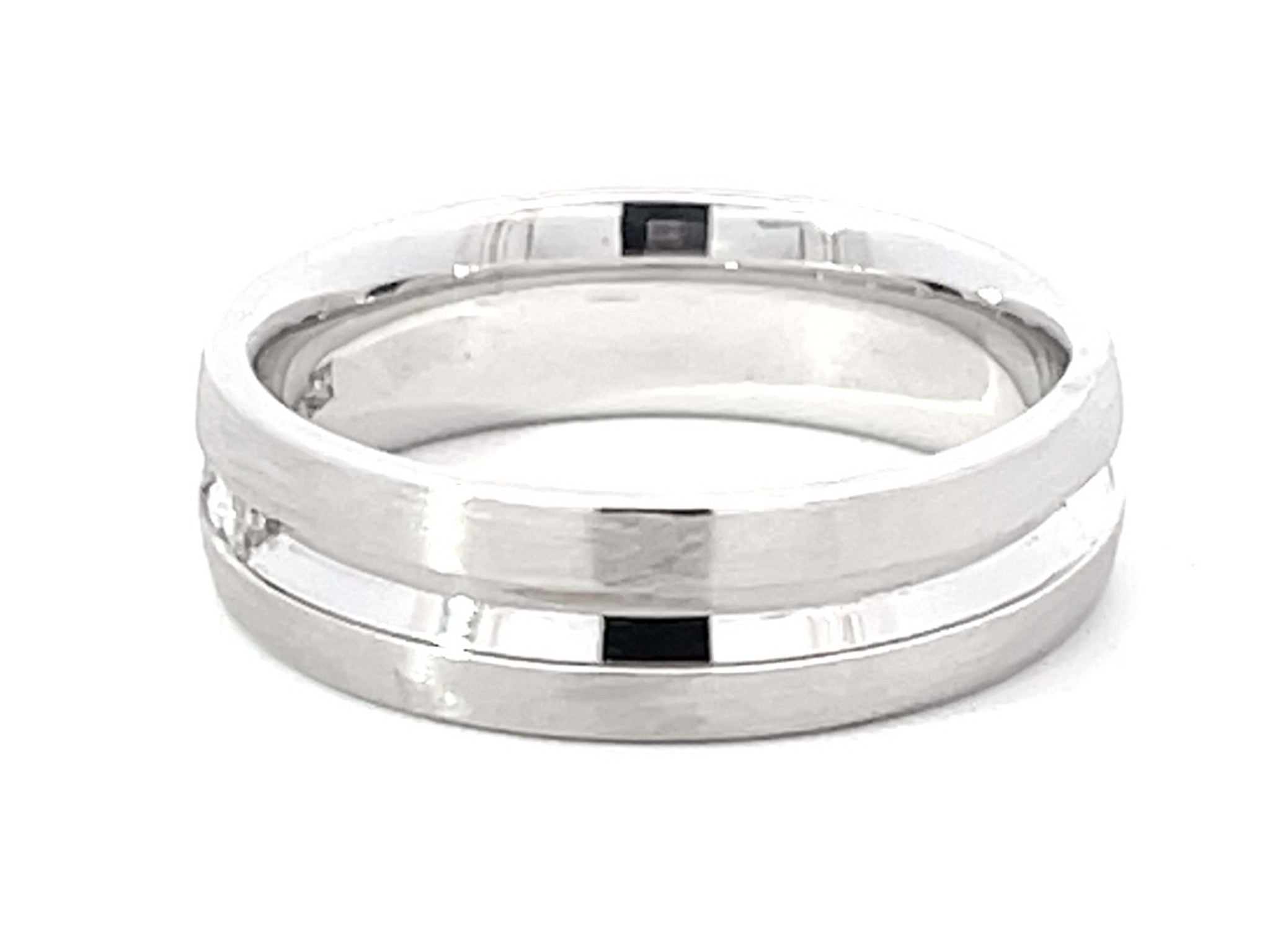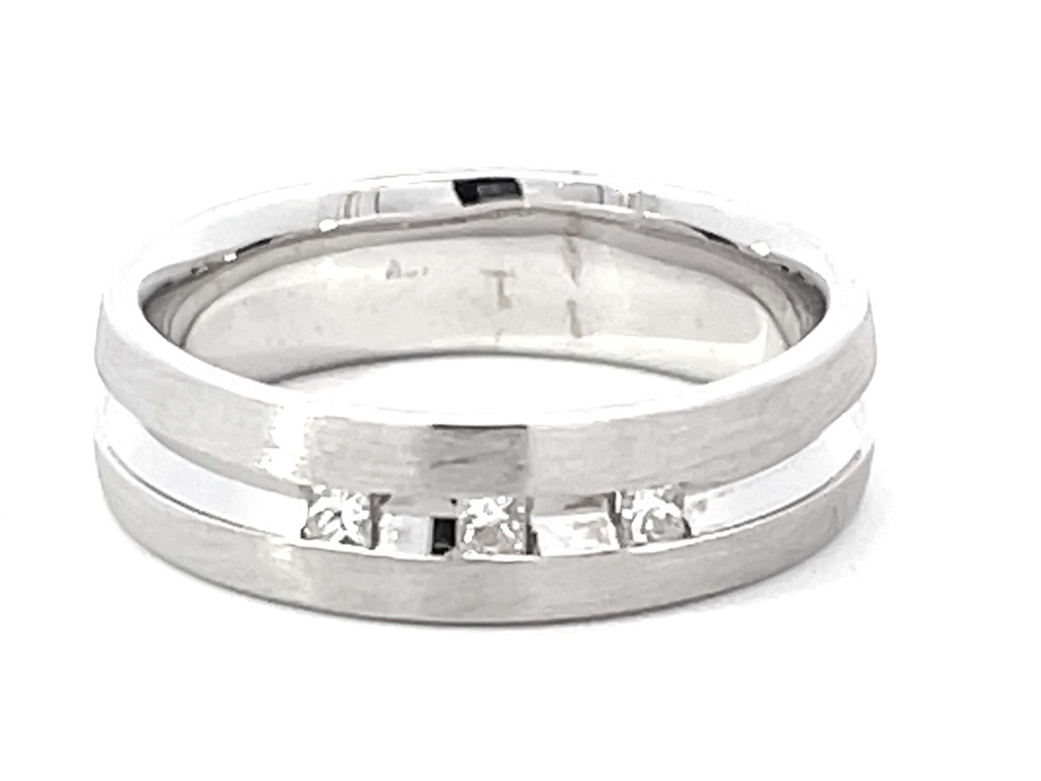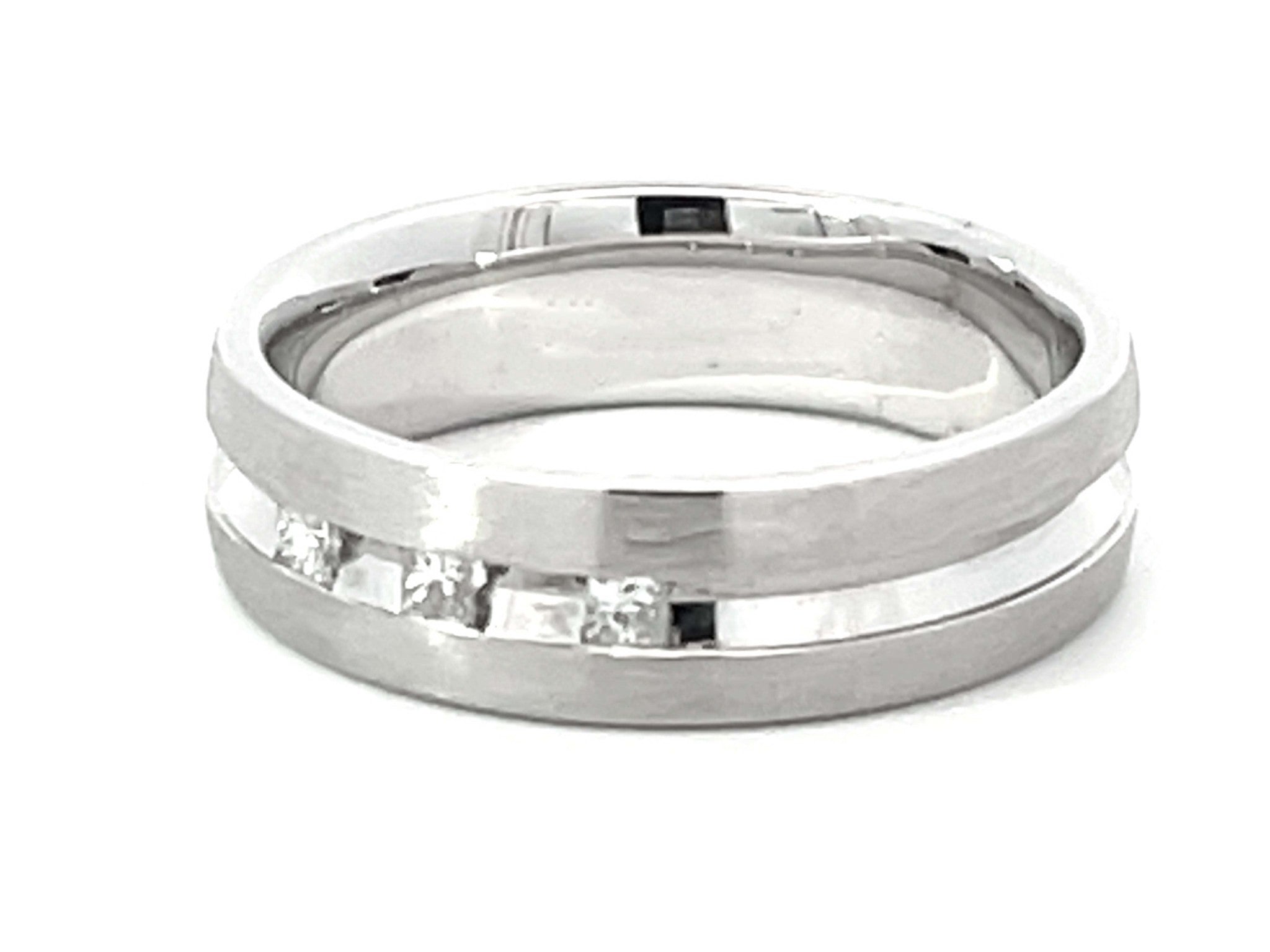 Item Specifications: Metal: 18k White Gold Diamond Count: 3 brilliant cut Diamond Carat Weight: ~0.10 caratsDiamond Color: G-HDiamond Clarity: VSRing Size: 11.5 (resizable) Total Weight: 12.5 GramsStamped: "18k" Condition: Preowned, Excellent