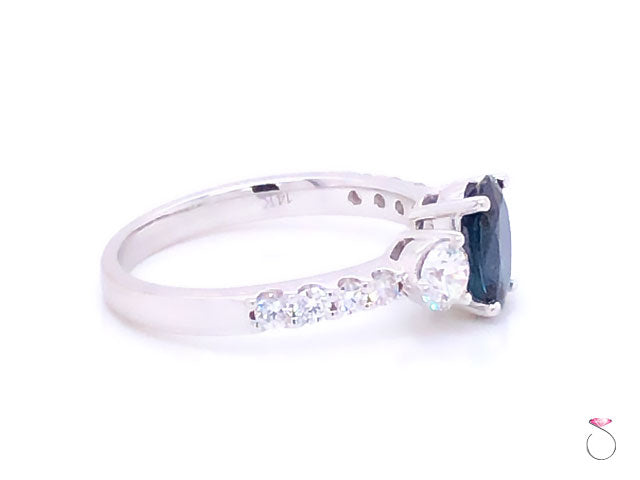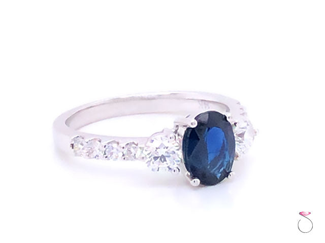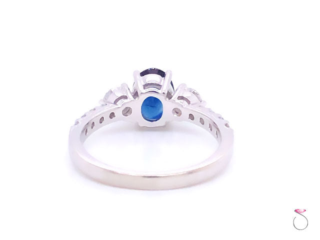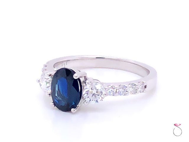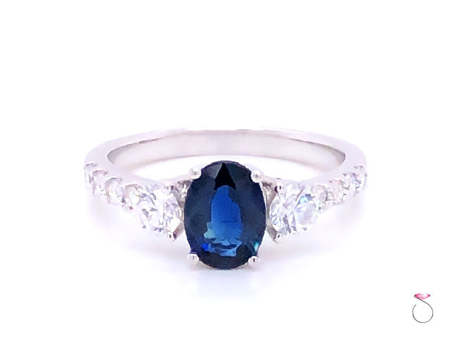 Beautiful Blue Sapphire & diamond engagement ring in 14K white gold. This gorgeous ring features a stunning oval shape blue Sapphire in the center set in four prongs and flanked by two round brilliant cut diamonds, one on each side. The Sapphire measures 7.90 x 5.85 x 2.92 mm with an approximate weight of 1.00 carat. The Sapphire has a beautiful blue color and a lot of sparkle. The two side diamonds measure 3.85 mm in diameter and are 0.40 carat total weight. The ring shoulders are set with 4 round diamonds on each side totaling approximately 0.20 carat. This ring is beautifully made in 14K white gold with a high polish finish. The ring is hallmarked "JLJ" and dtamped "14K". This ring is size 7 and can be resized for a fee uppon request. Please allow 3 to 4 business days before shipping for re-sizing. Total gram weight 3.40 grams.