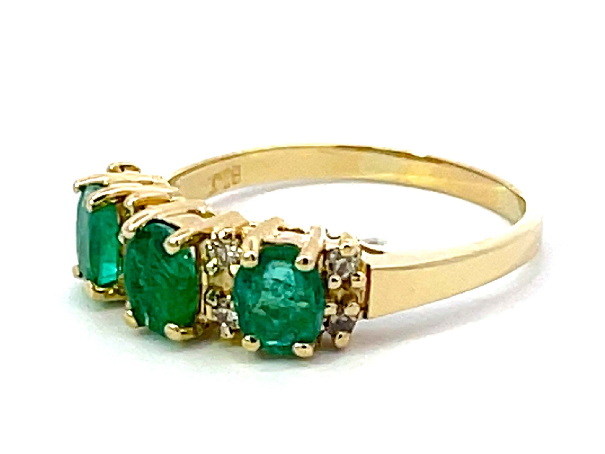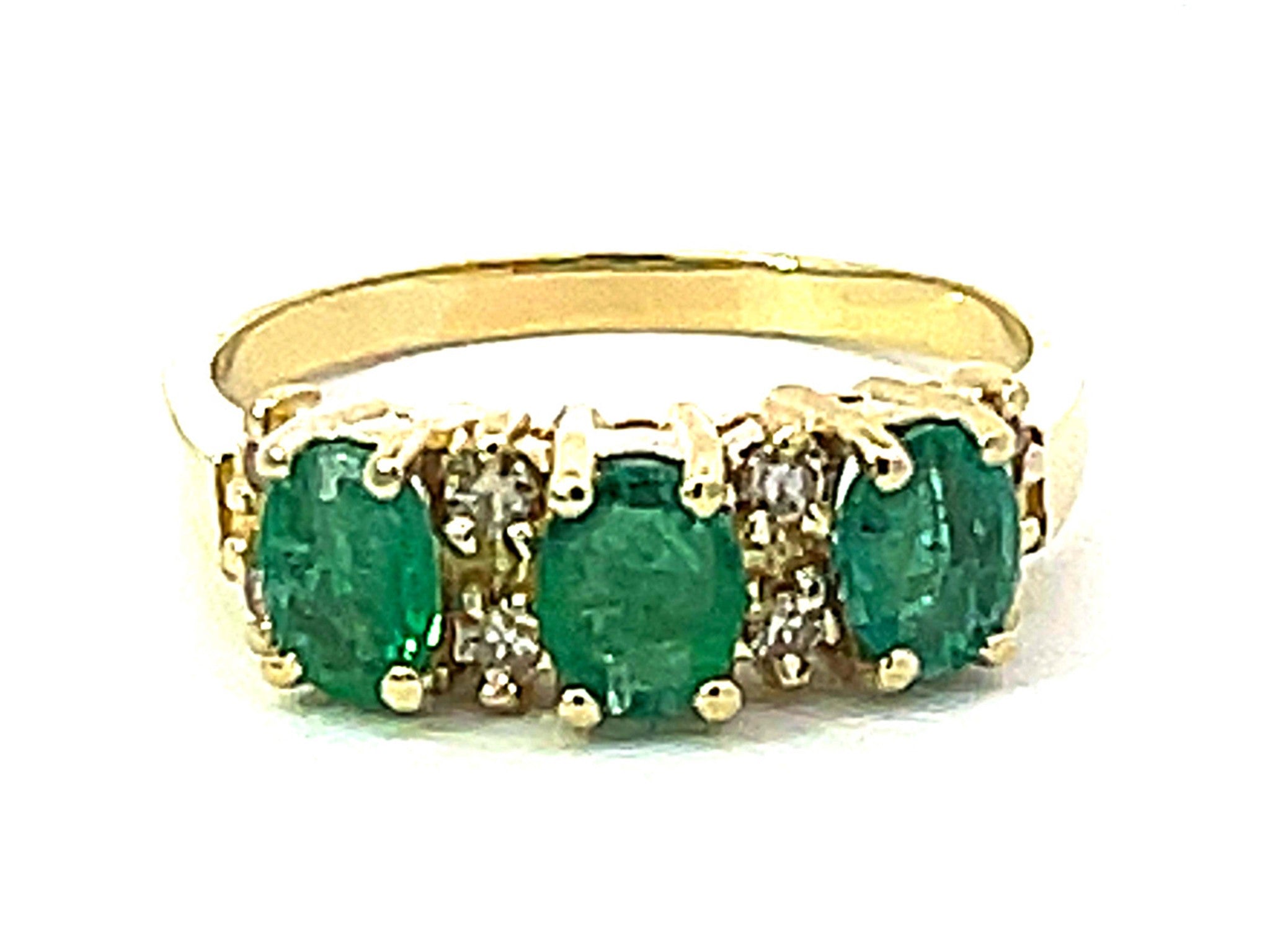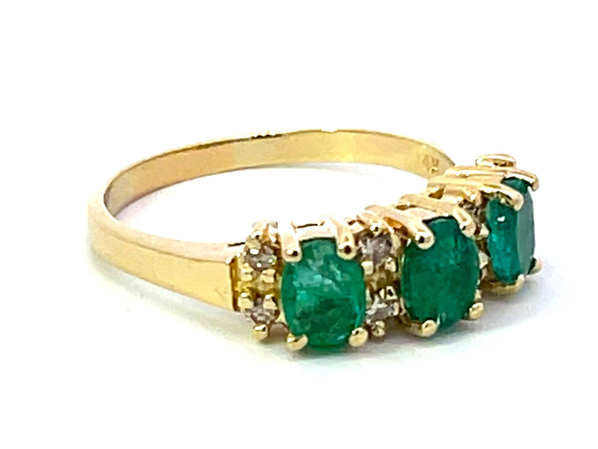 Item Specifications:Metal: 14k Yellow GoldRing Size: 10 (resizing available for a fee)Total Weight: 4.7 GramsDiamond Count: 8 diamondsDiamond Carat Weight: ~0.08Diamond Color: L-MDiamond Clarity: SI1Gemstone Specifications:Gemstones: 3 oval green emeraldsTotal Emerald Carat Weight: ~1.00 caratsCondition: Preowned, ExcellentStamped: "14K"