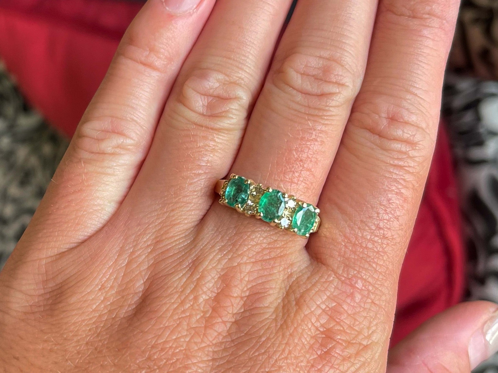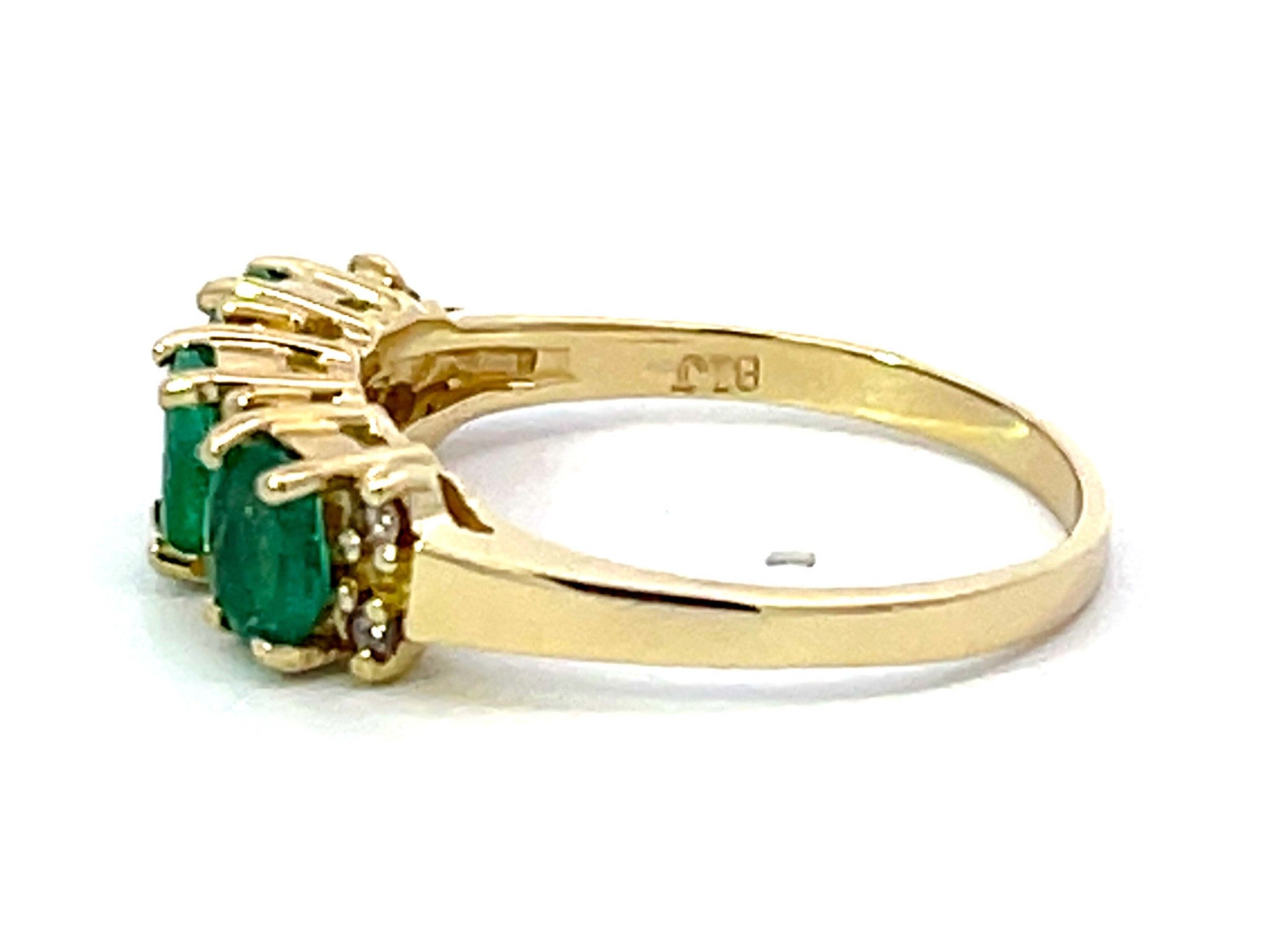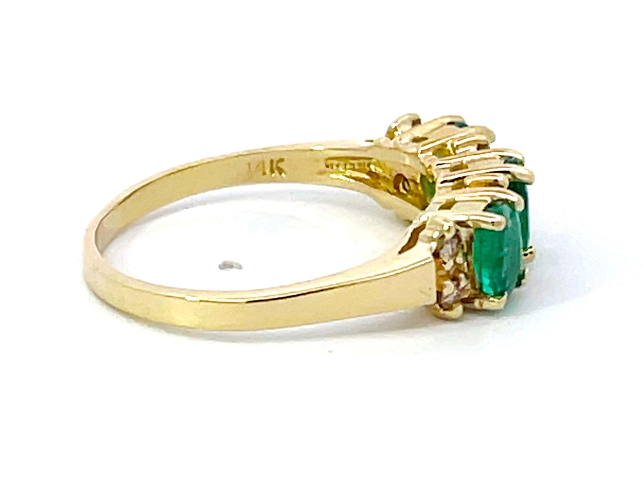 Item Specifications:Metal: 14k Yellow GoldRing Size: 10 (resizing available for a fee)Total Weight: 4.7 GramsDiamond Count: 8 diamondsDiamond Carat Weight: ~0.08Diamond Color: L-MDiamond Clarity: SI1Gemstone Specifications:Gemstones: 3 oval green emeraldsTotal Emerald Carat Weight: ~1.00 caratsCondition: Preowned, ExcellentStamped: "14K"