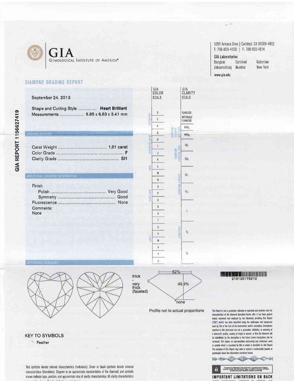 Heart Shaped Diamond GIA Certified 1.01ct F-SI1 Beautiful heart shaped Diamond. Diamond Details Stock number: 30-10131 Shape: Heart Carat Weight: 1.01 Color: F Clarity: SI1 Diamond Certified By: GIA Shipping: FREE...