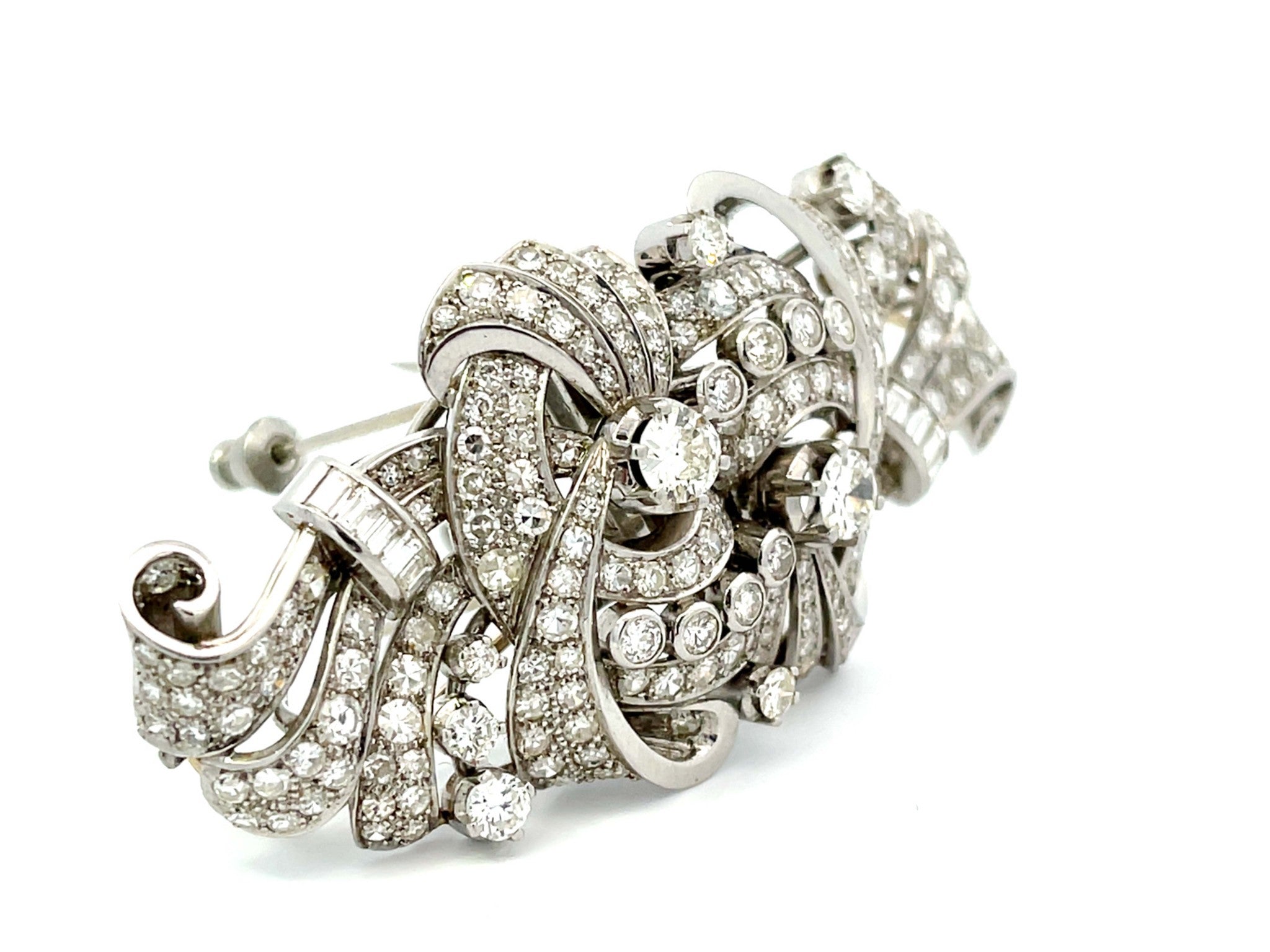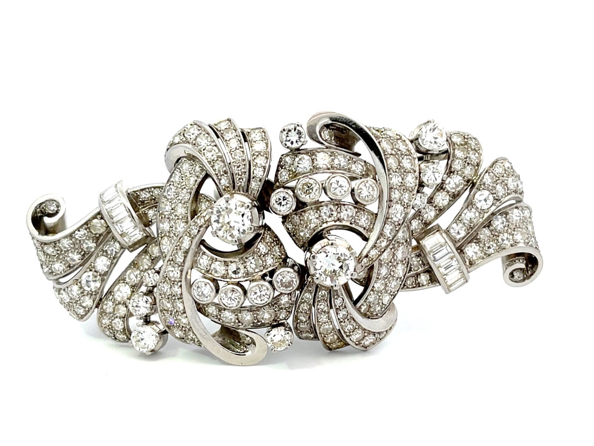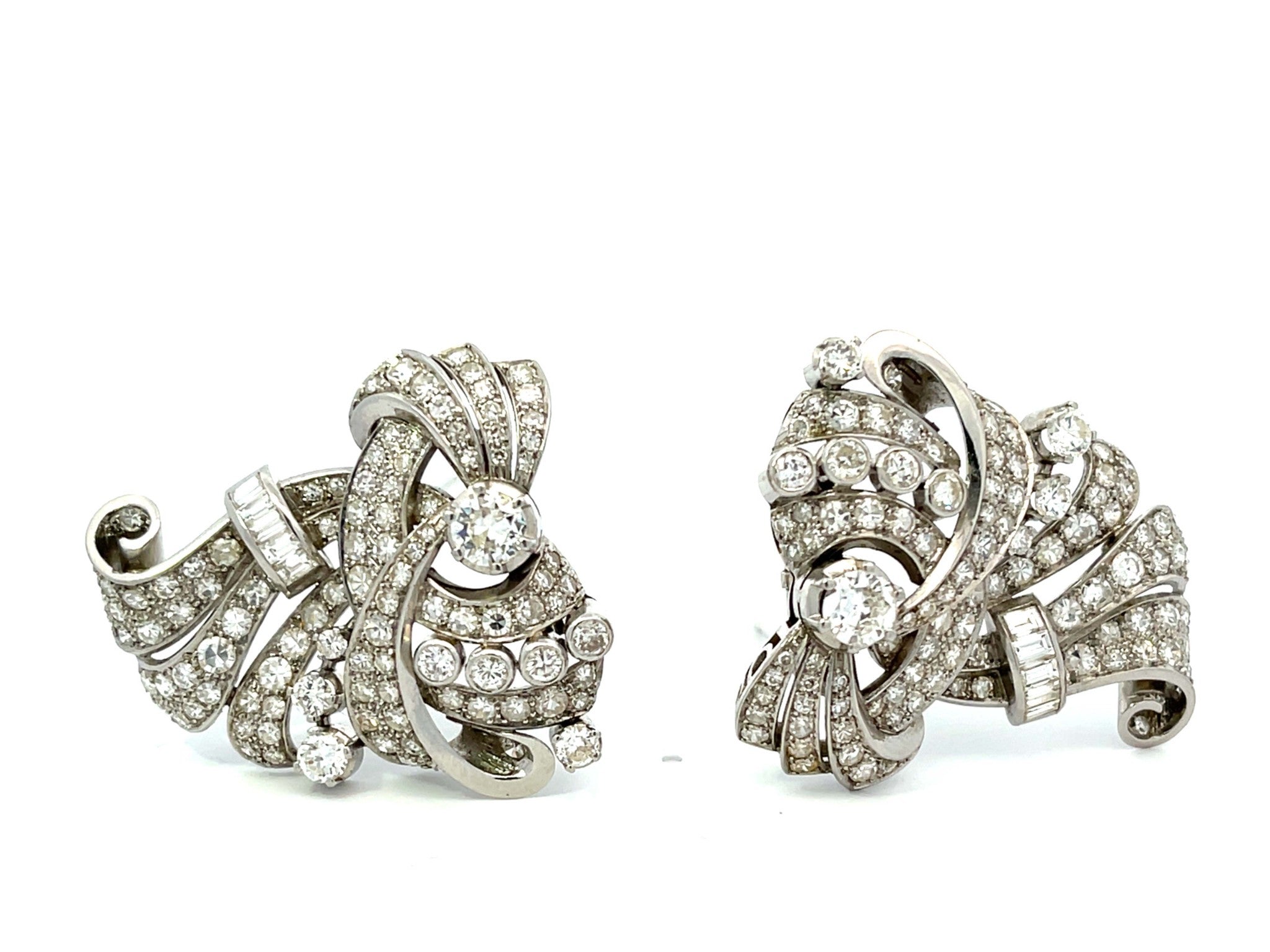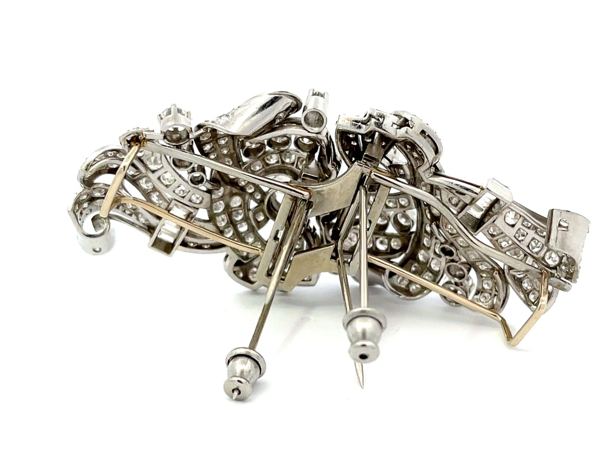 The 2 largest center diamonds are 1.20 carats, old European cut, G-I and SI1. There are 16 round transition cut diamonds totaling 1.34 carats, 168 round single cut diamonds totaling 5.04 carats, 10 baguette cut diamonds totaling 0.10 carats. Total diamond weight is 7.68 carats.