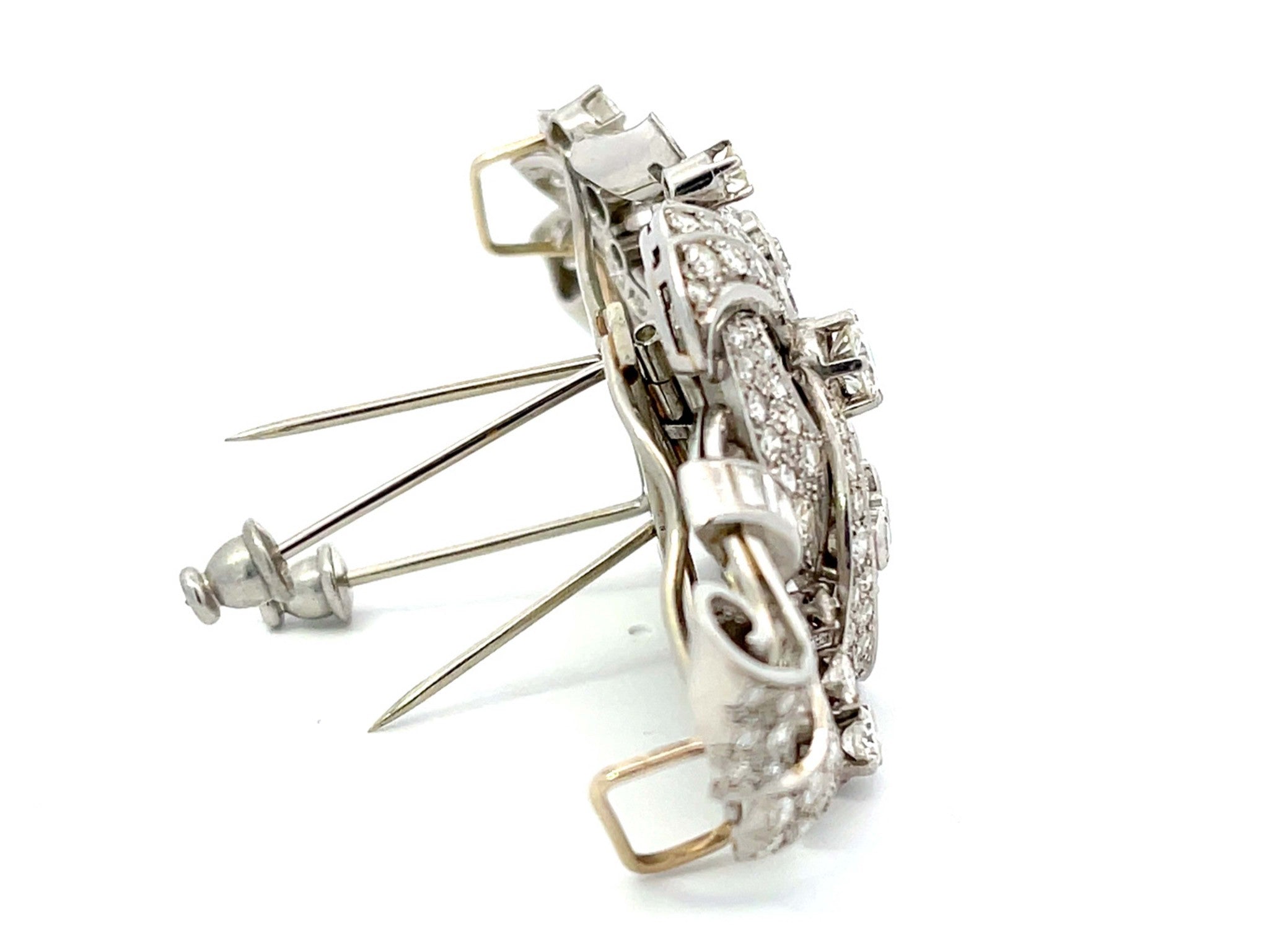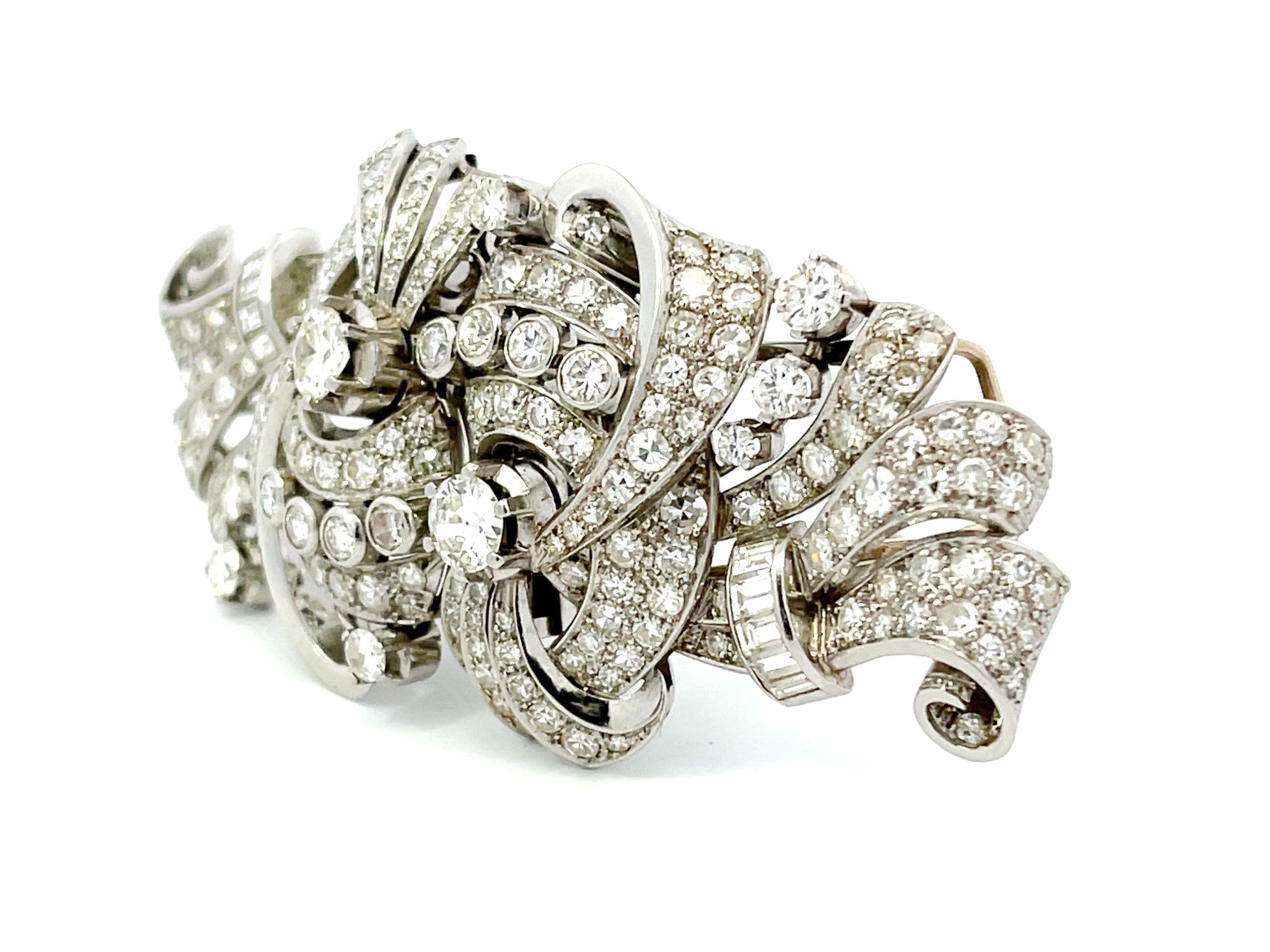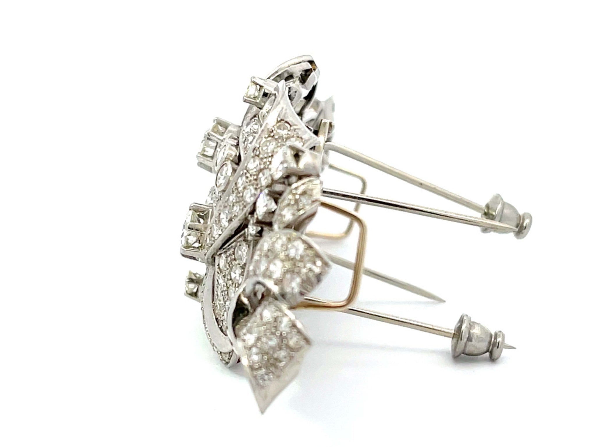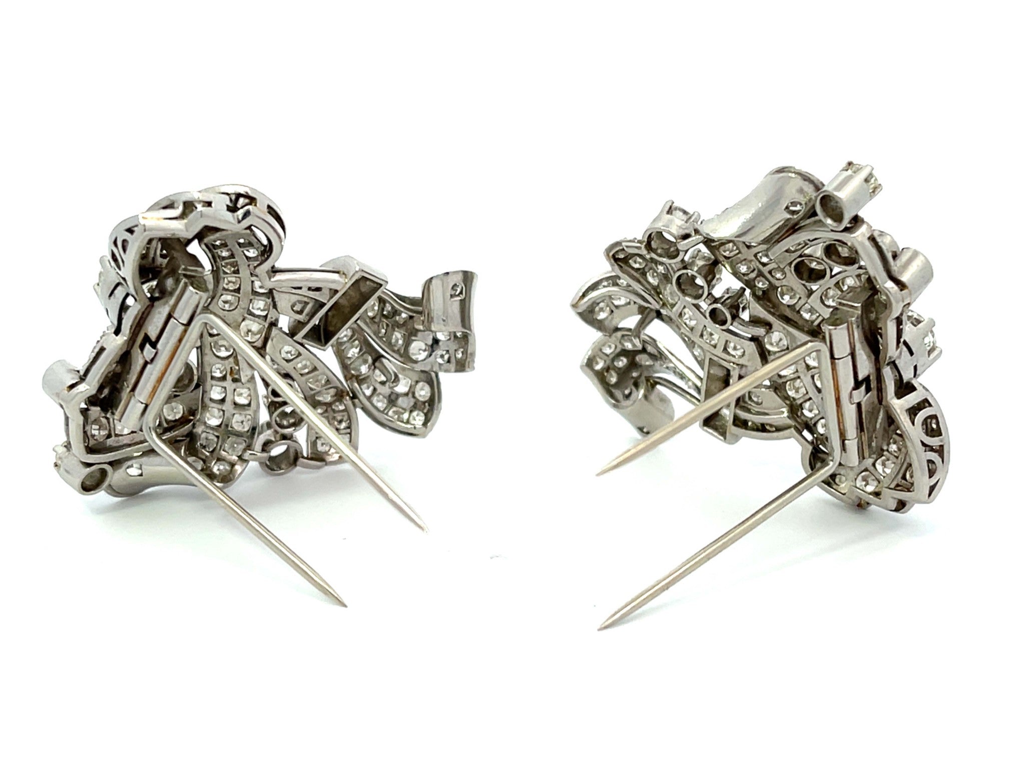 The 2 largest center diamonds are 1.20 carats, old European cut, G-I and SI1. There are 16 round transition cut diamonds totaling 1.34 carats, 168 round single cut diamonds totaling 5.04 carats, 10 baguette cut diamonds totaling 0.10 carats. Total diamond weight is 7.68 carats.