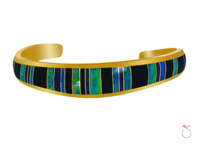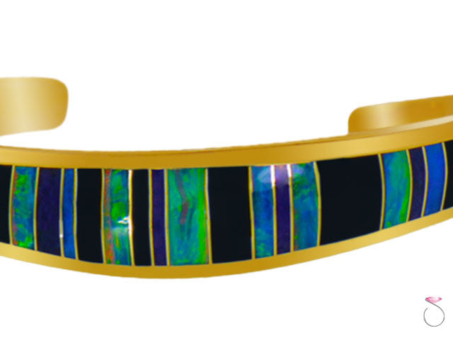 Stunning 14K yellow gold cuff bracelet; inlayed with vibrant Australian opal, black onyx and purple Malachite.| ITEM DETAILS | BRACELET |