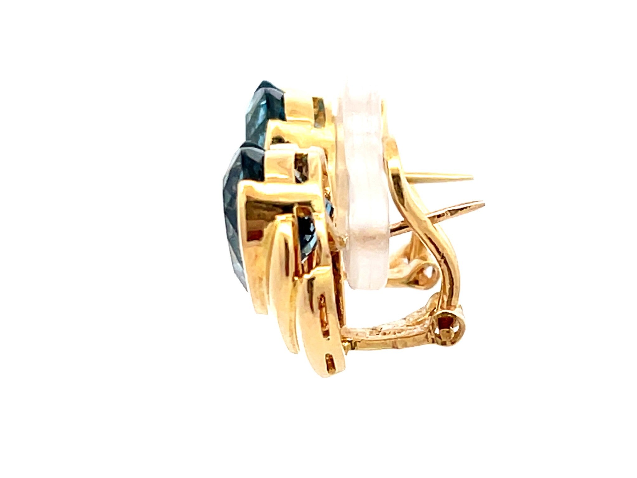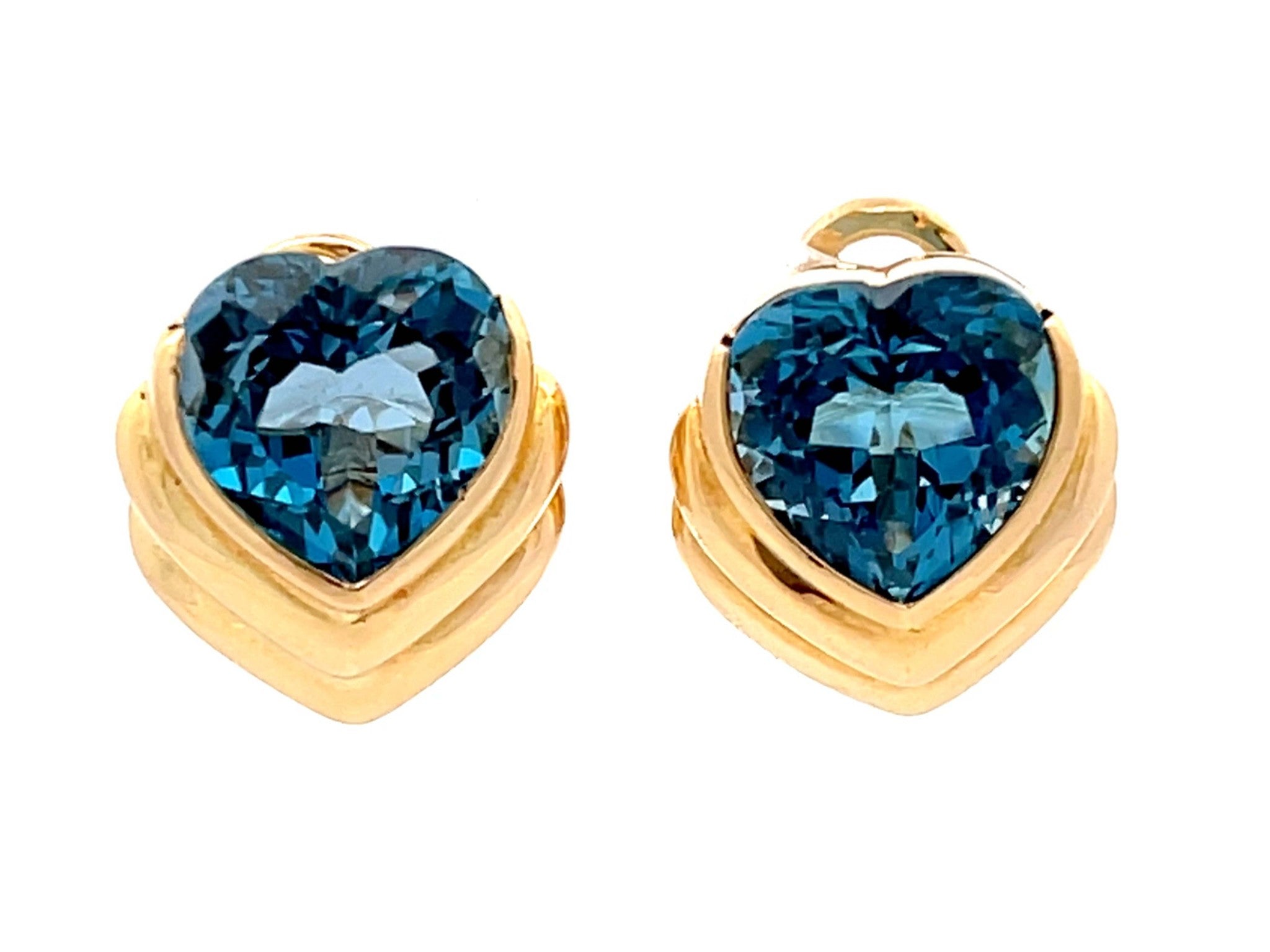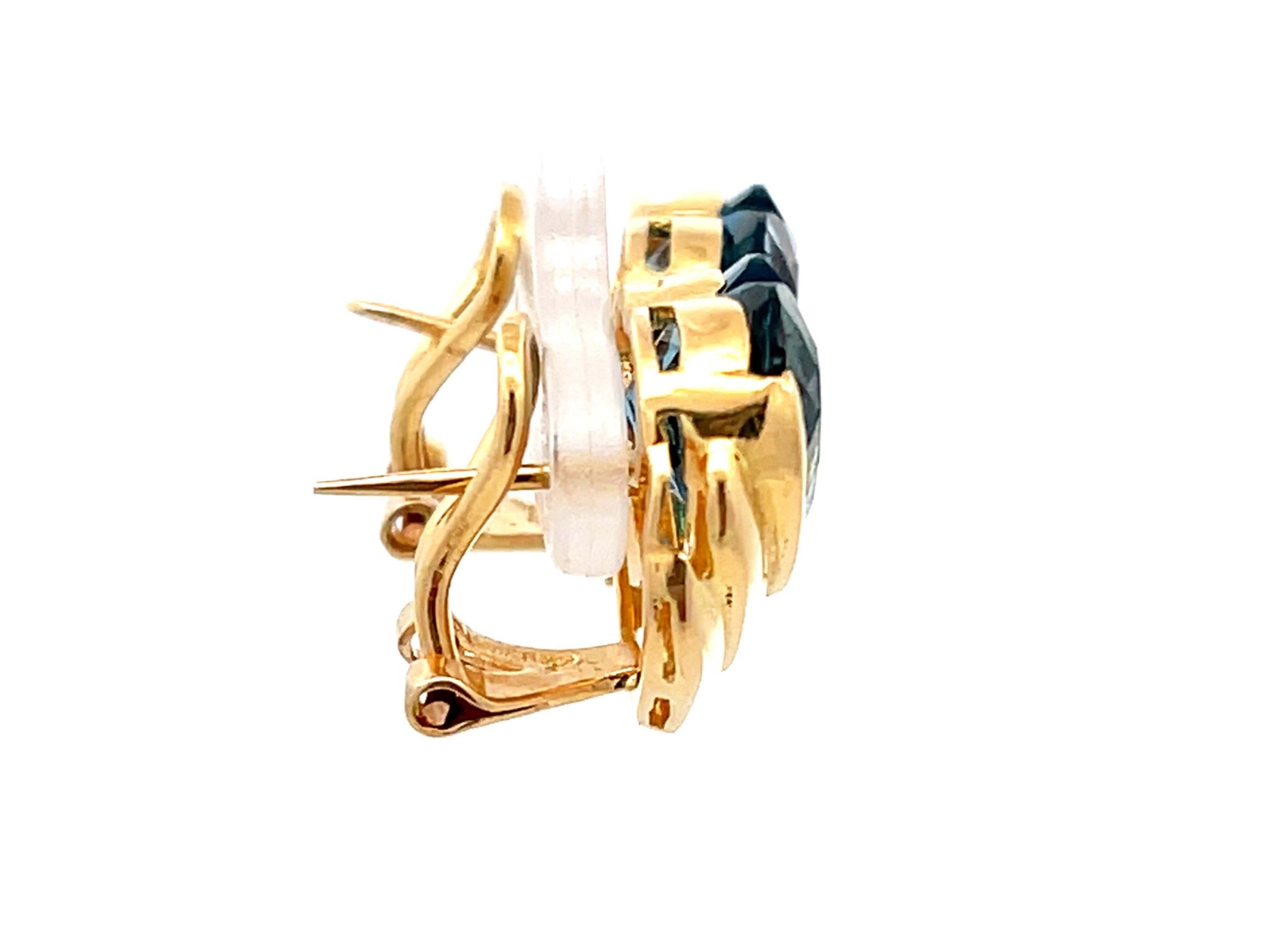 Earrings Specifications:Metal: 18K Yellow GoldTotal Weight: 10.3 GramsGemstone: Blue TopazTopaz Measurements: 10.88 x 10.6 x 6.7 mm Earring Measurements: 16 mm x 14 mmStamped: "750" "Mayors"Condition: Preowned, Excellent