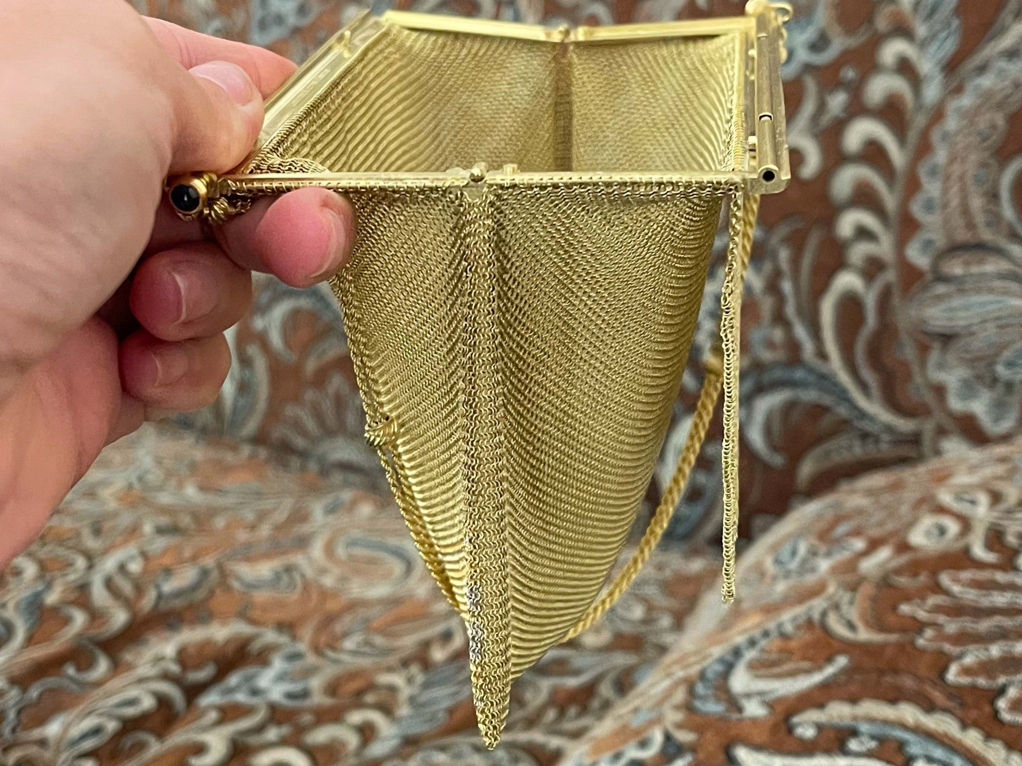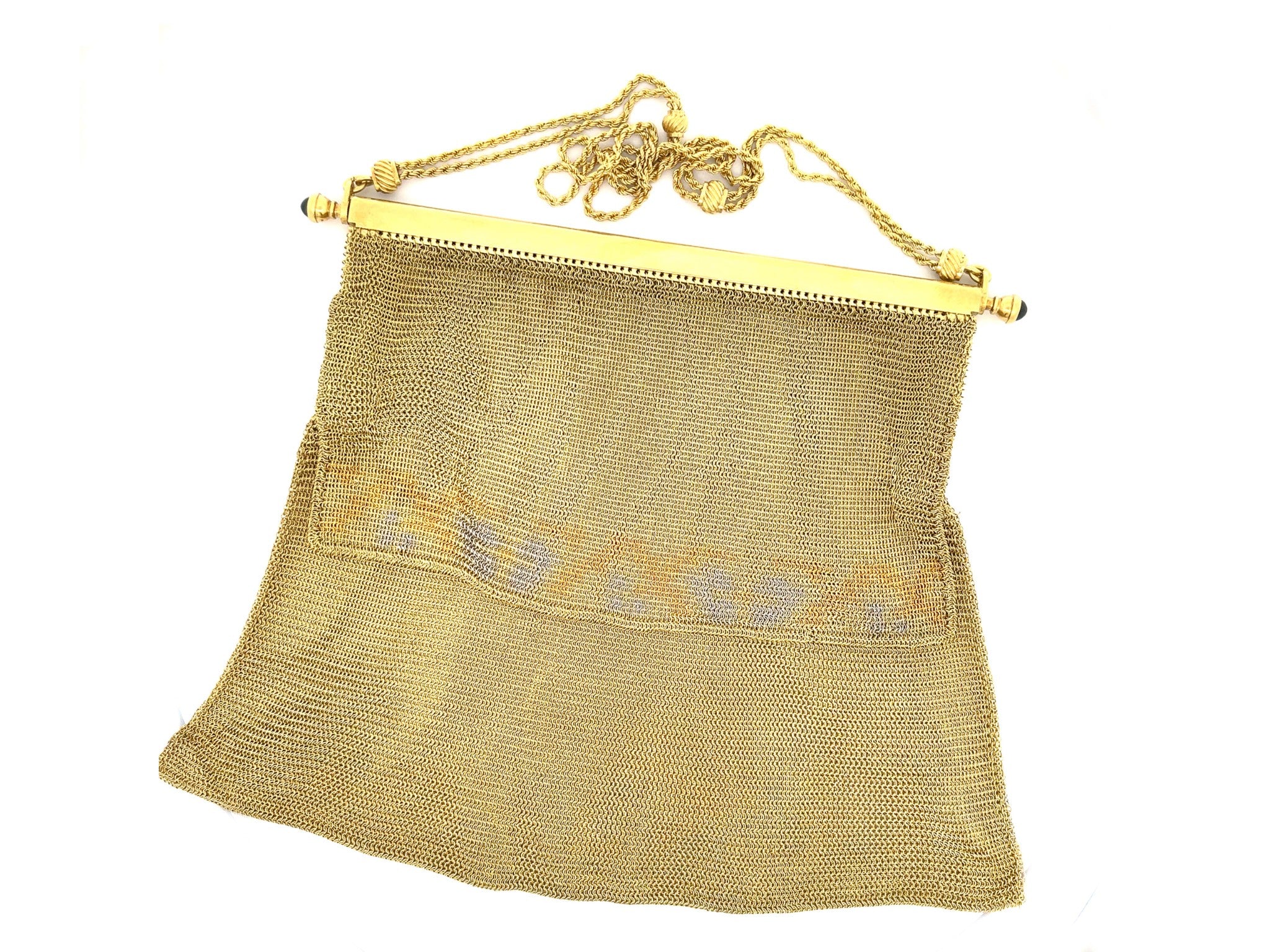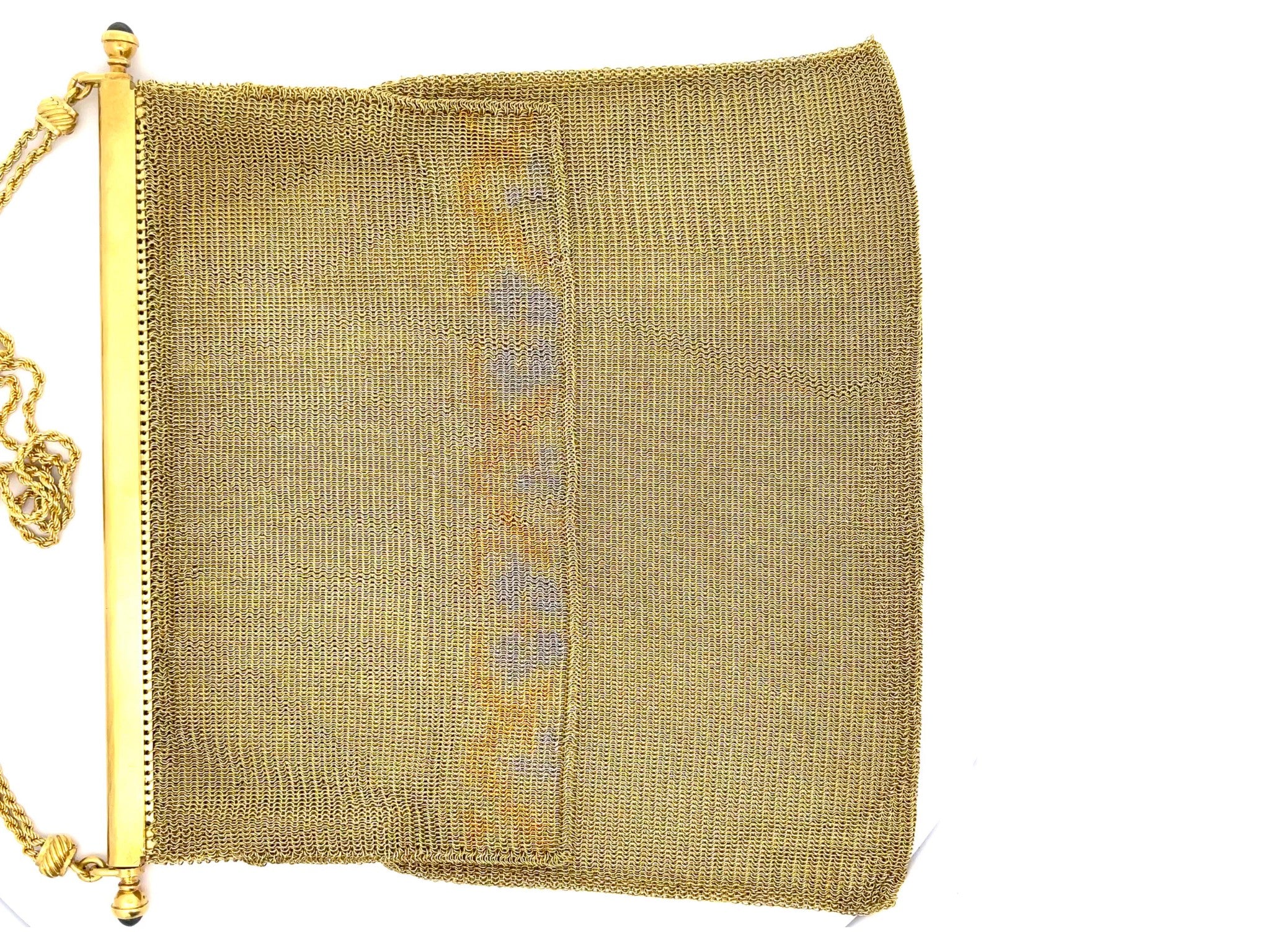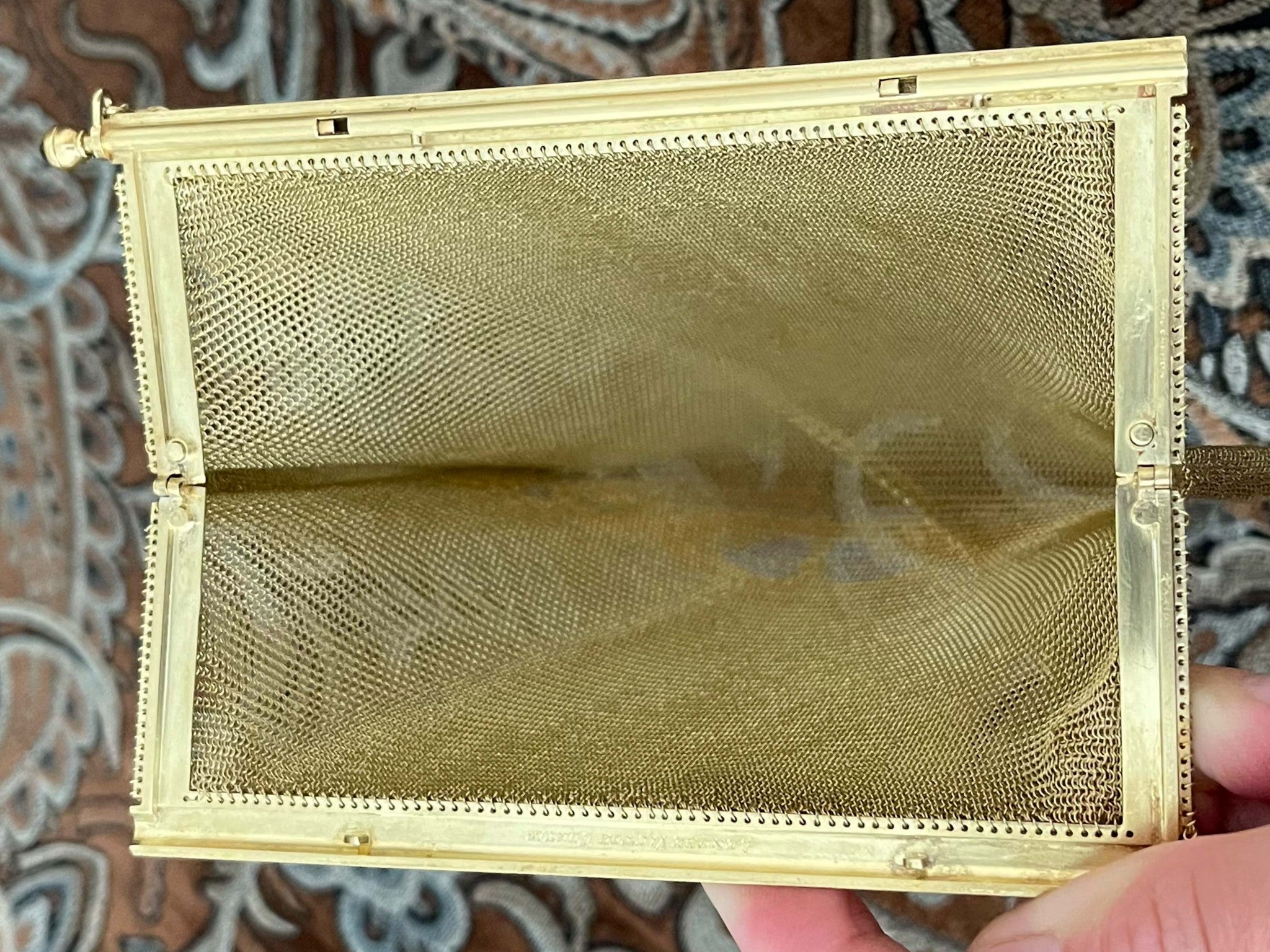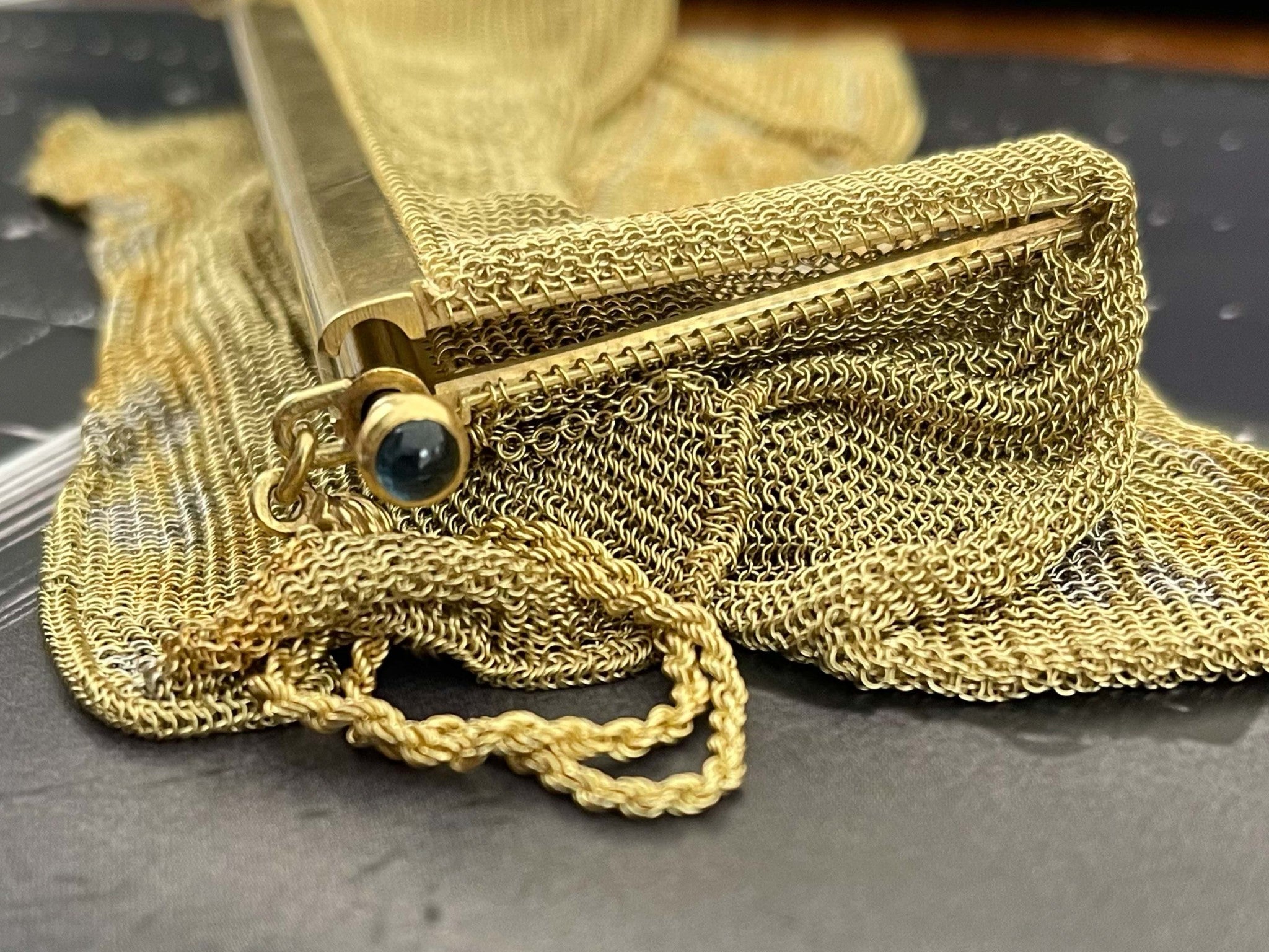 Engraved with original owners name on the inside. Two blue sapphires are set on the sides of the purse, very rare vintage solid 18k gold purse.