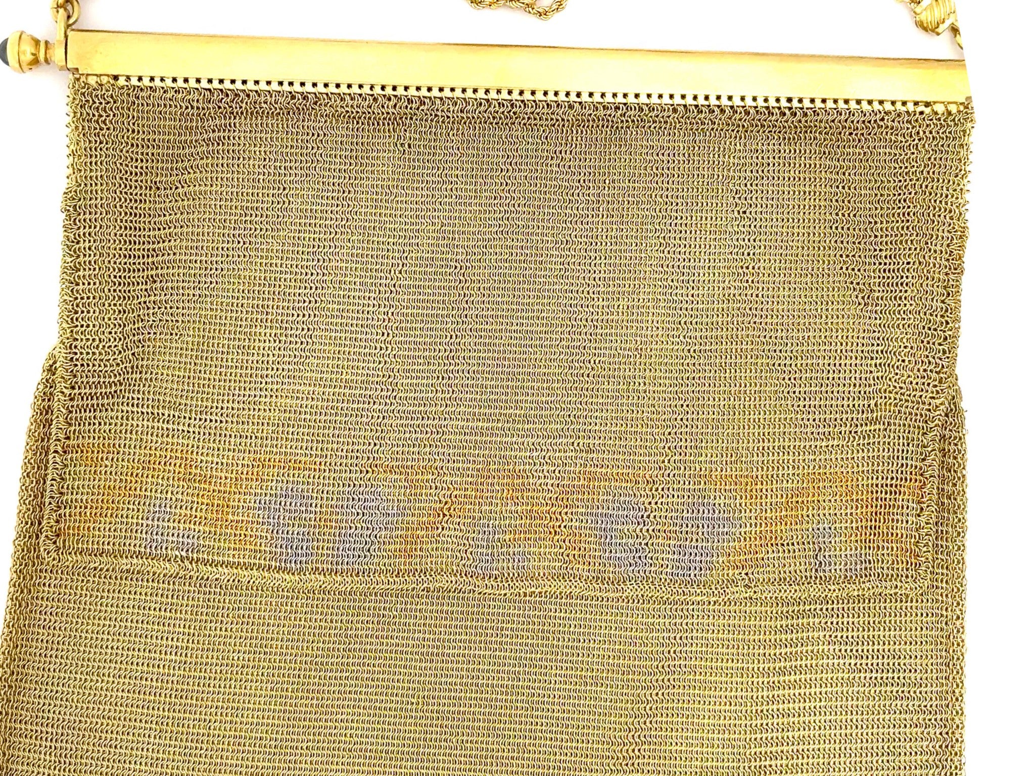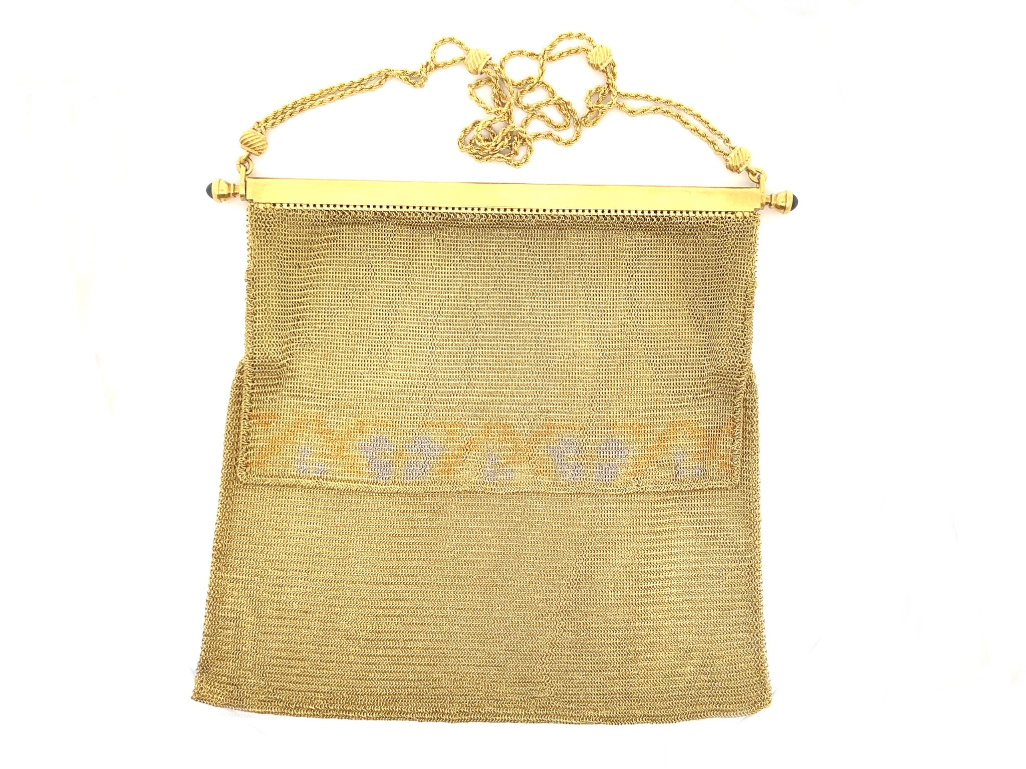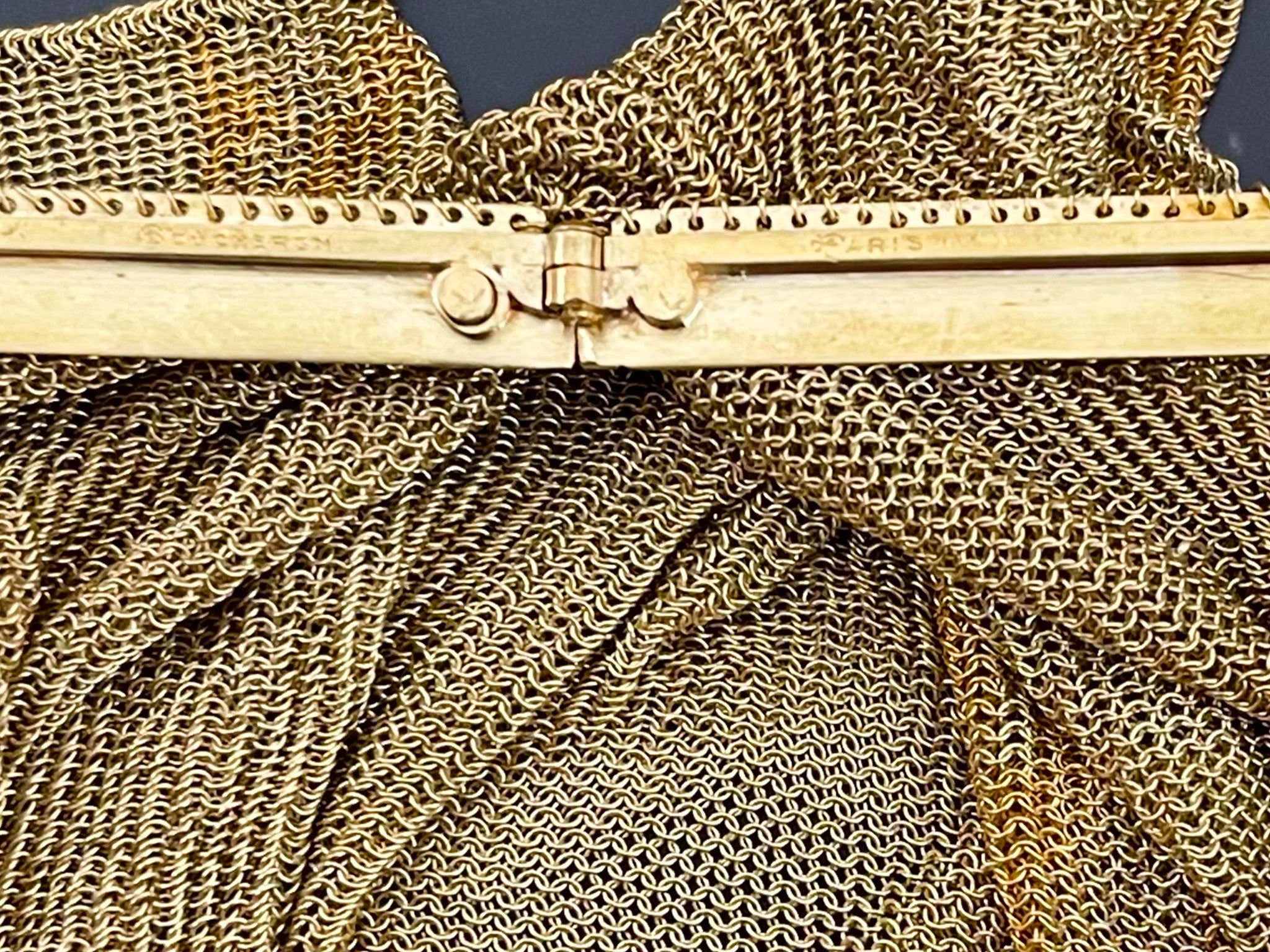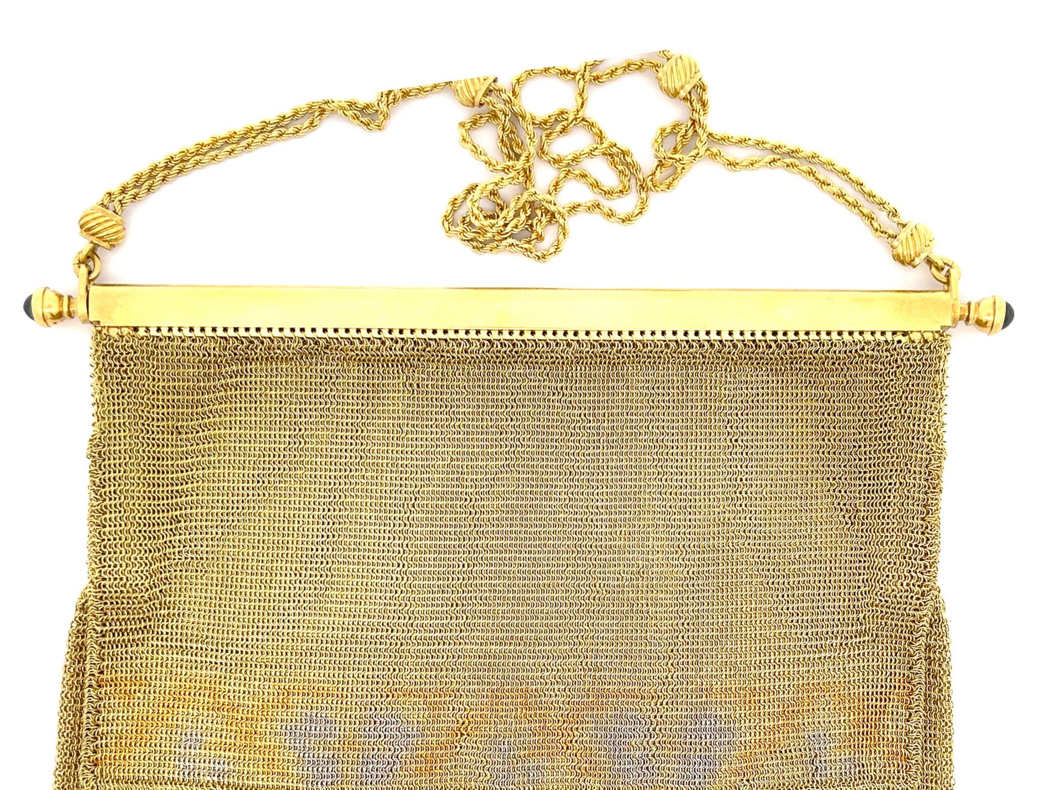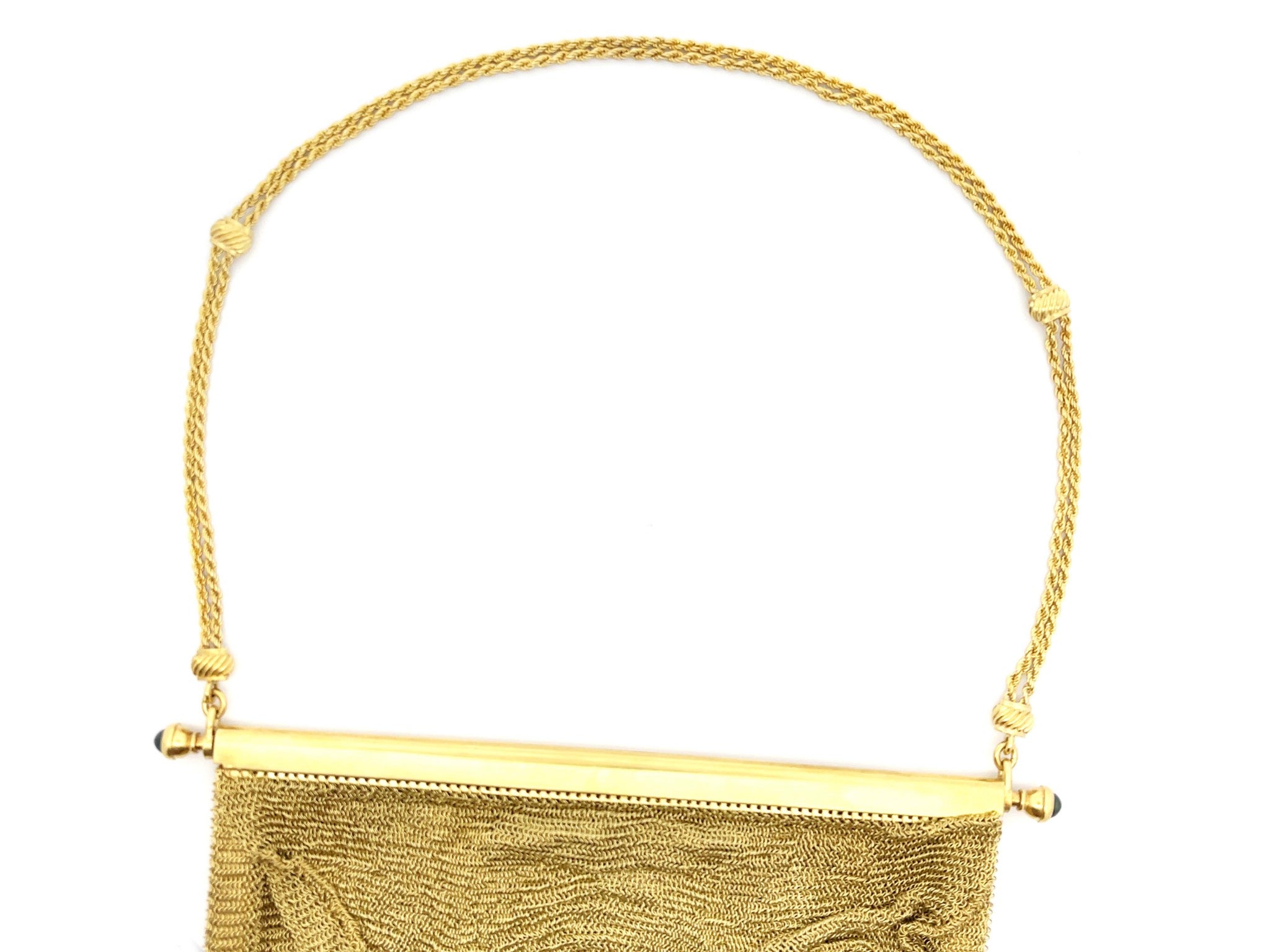 Engraved with original owners name on the inside. Two blue sapphires are set on the sides of the purse, very rare vintage solid 18k gold purse.