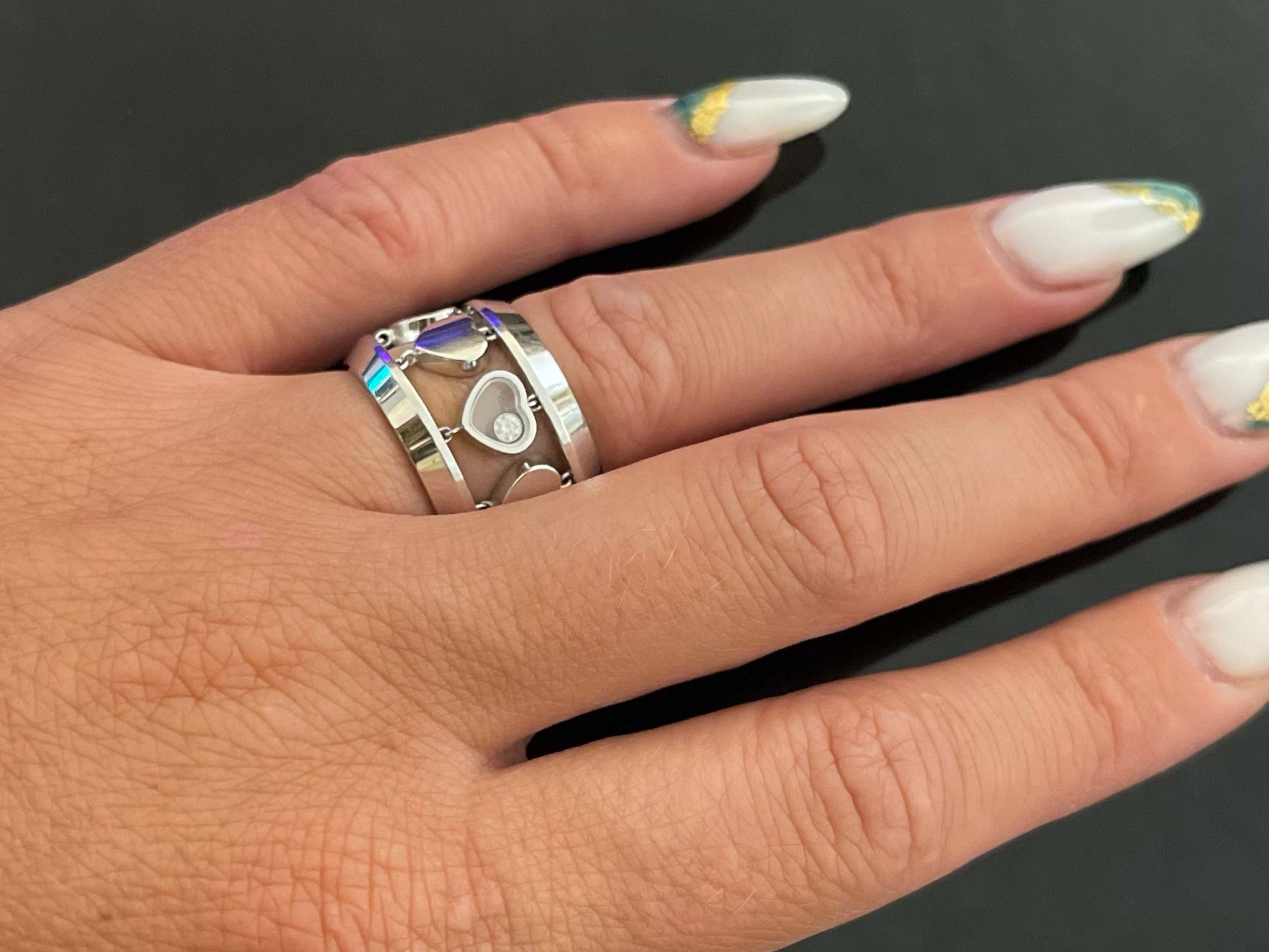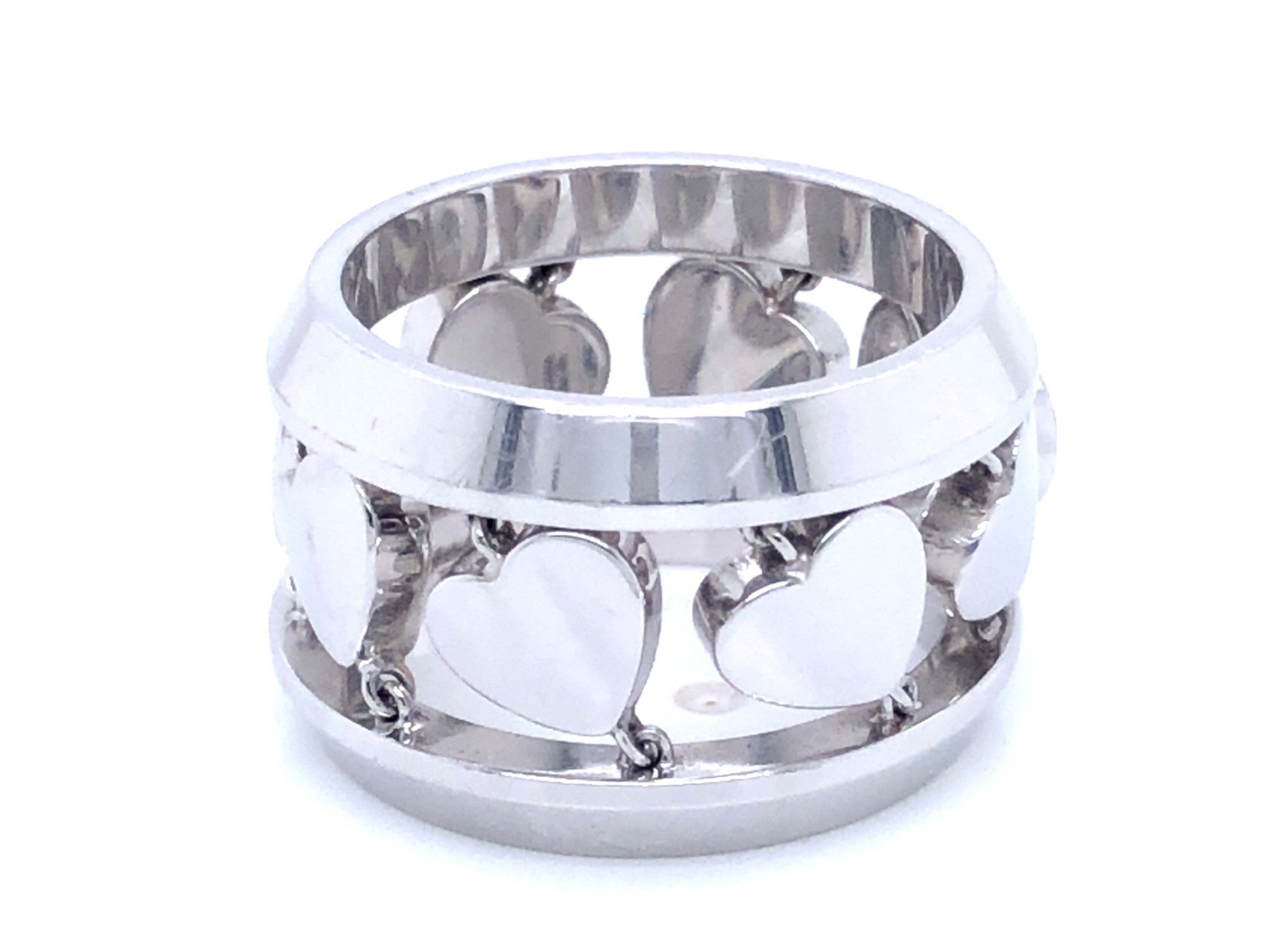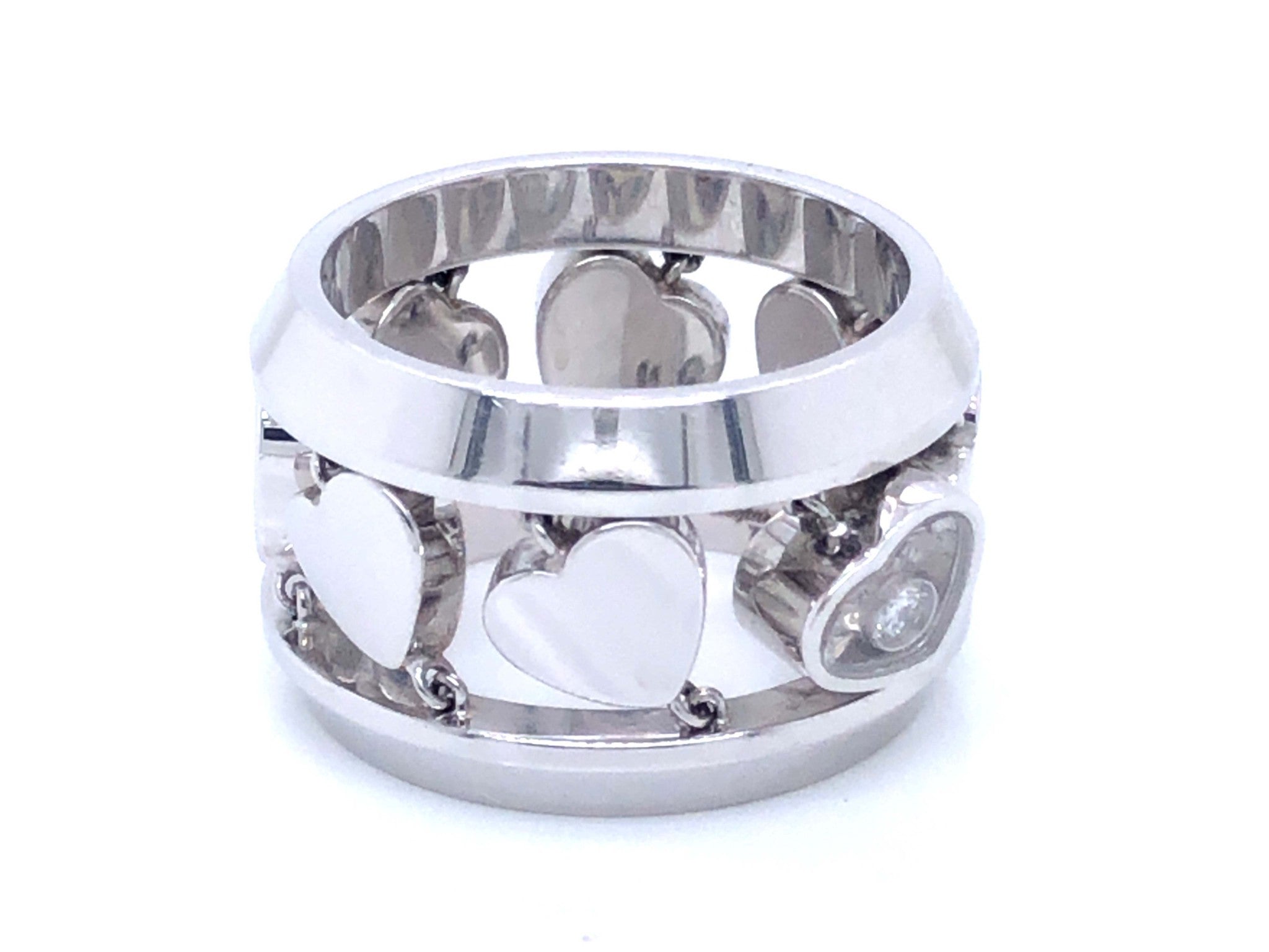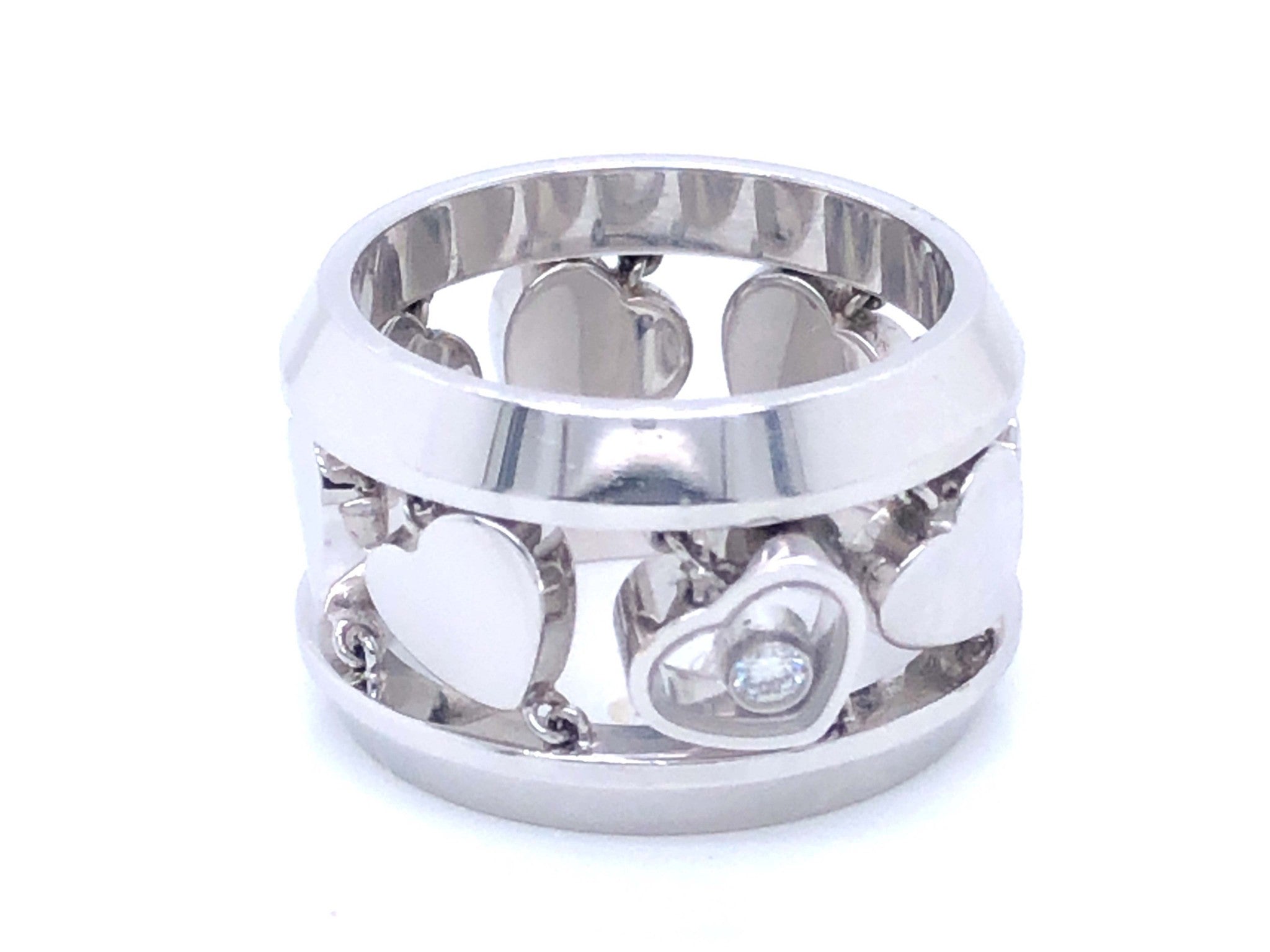 Chopard Happy Diamond Heart Ring in 18k White Gold. The ring features 8 hearts between 2 bands, with one heart containing a diamond that moves around freely. As usual with all Chopard jewelry, the details on this ring are unbelievable and the finish is great. The ring is hallmarked "Chopard" on the inside & stamped "750" with serial & model numbers. The ring is size 6. Total weight is 17.5 grams. This is a pre-owned ring in excellent condition.