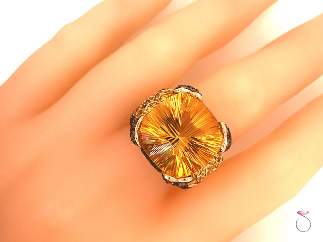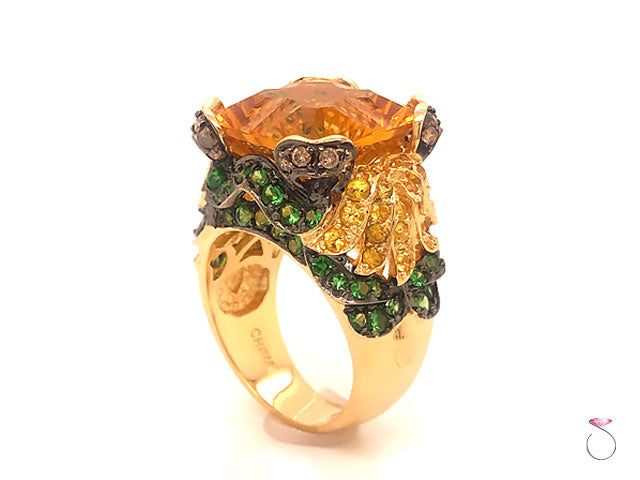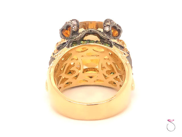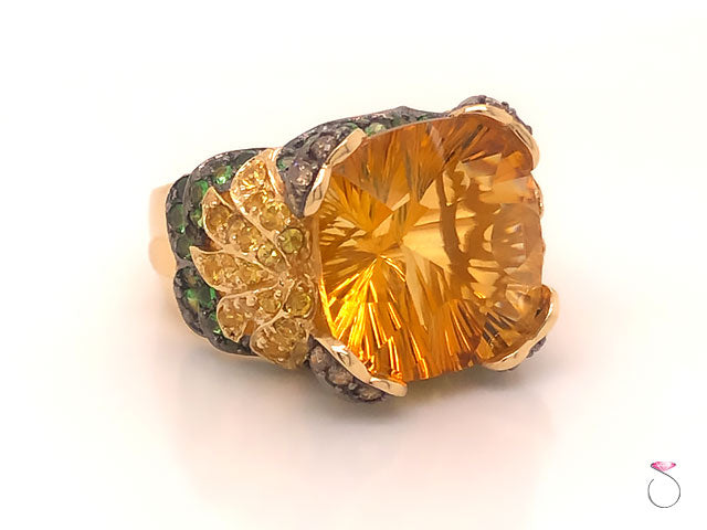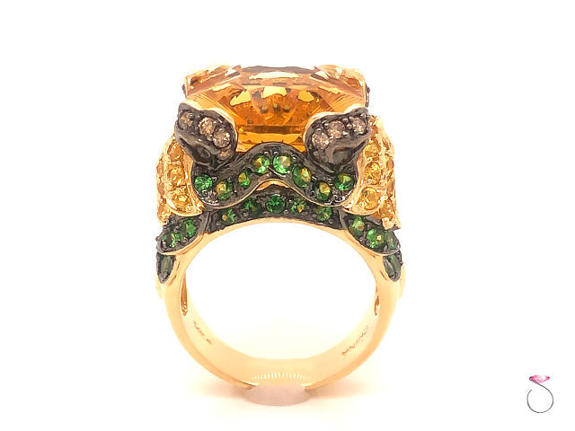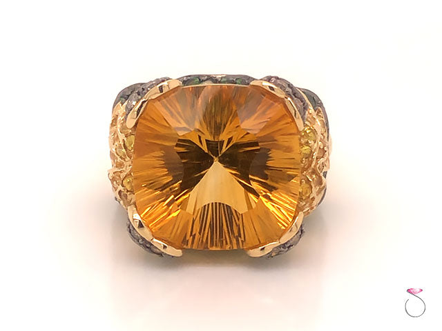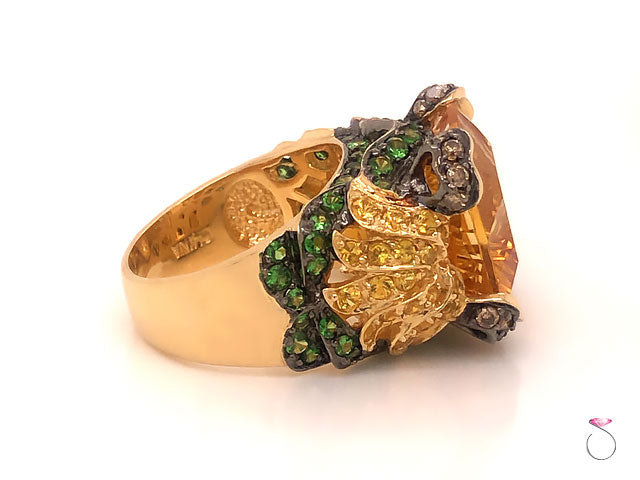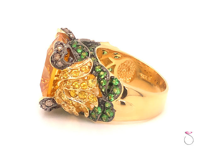 Beautiful designer styled large 14k yellow gold citrine ring. This unique ring features a large yellow citrine stone with sunburst faceting held by 4 heart shaped prongs. The prongs are set with chocolate diamonds, each heart shaped prong has 5 diamonds totaling 20 chocolate diamonds weighing approximately 0.20 carats. The ring is pavé set with 19 yellow sapphires on each side for a total of 38 round sapphires. Green tsavorites are also pavé set for a total of 54 round tsavorite gemstones. The ring is size 8 and can be easily re-sized (resizing available for a fee). Stamped "China" and "14k" on the inside. Total Weight 16.20 grams.
