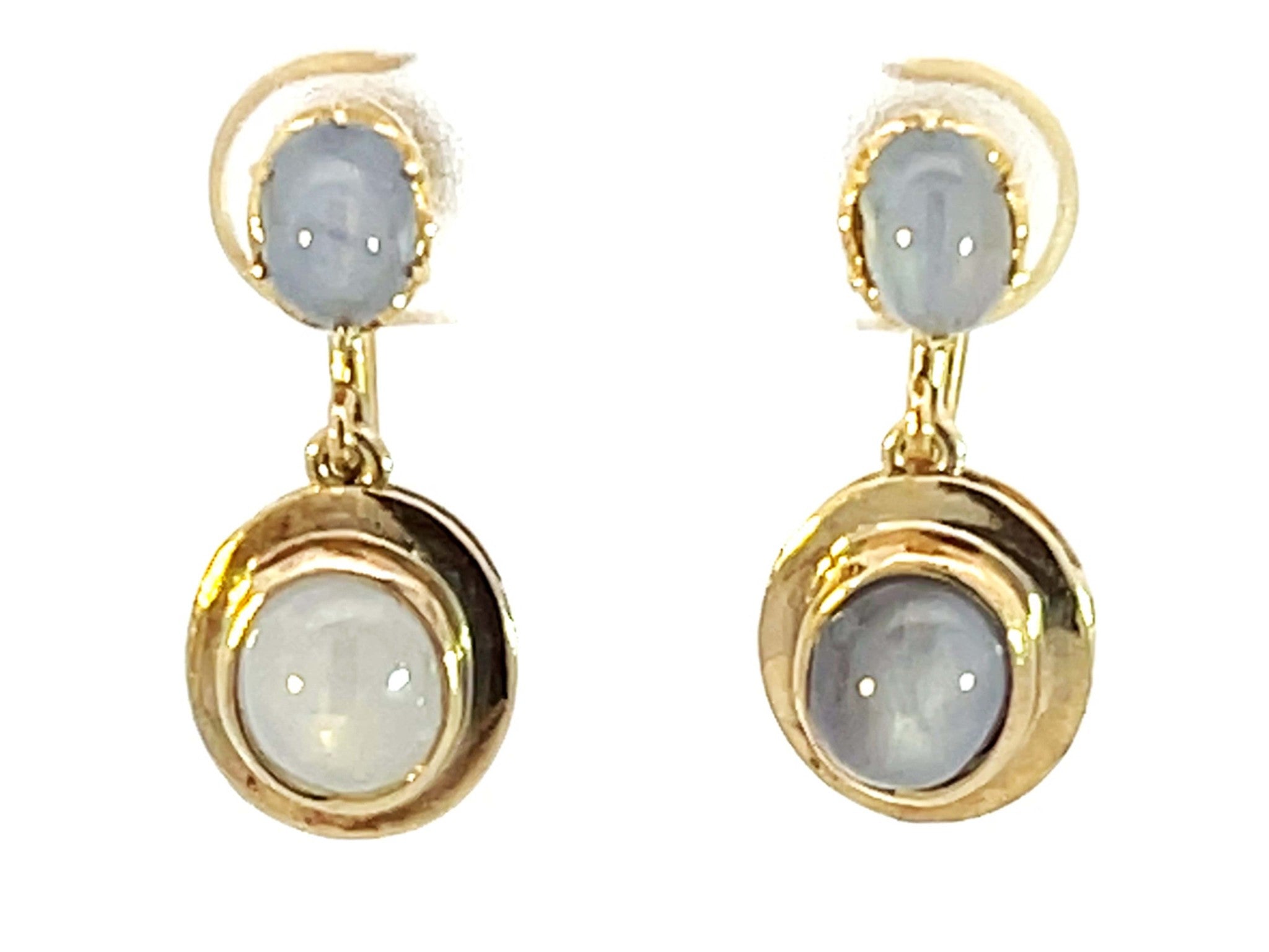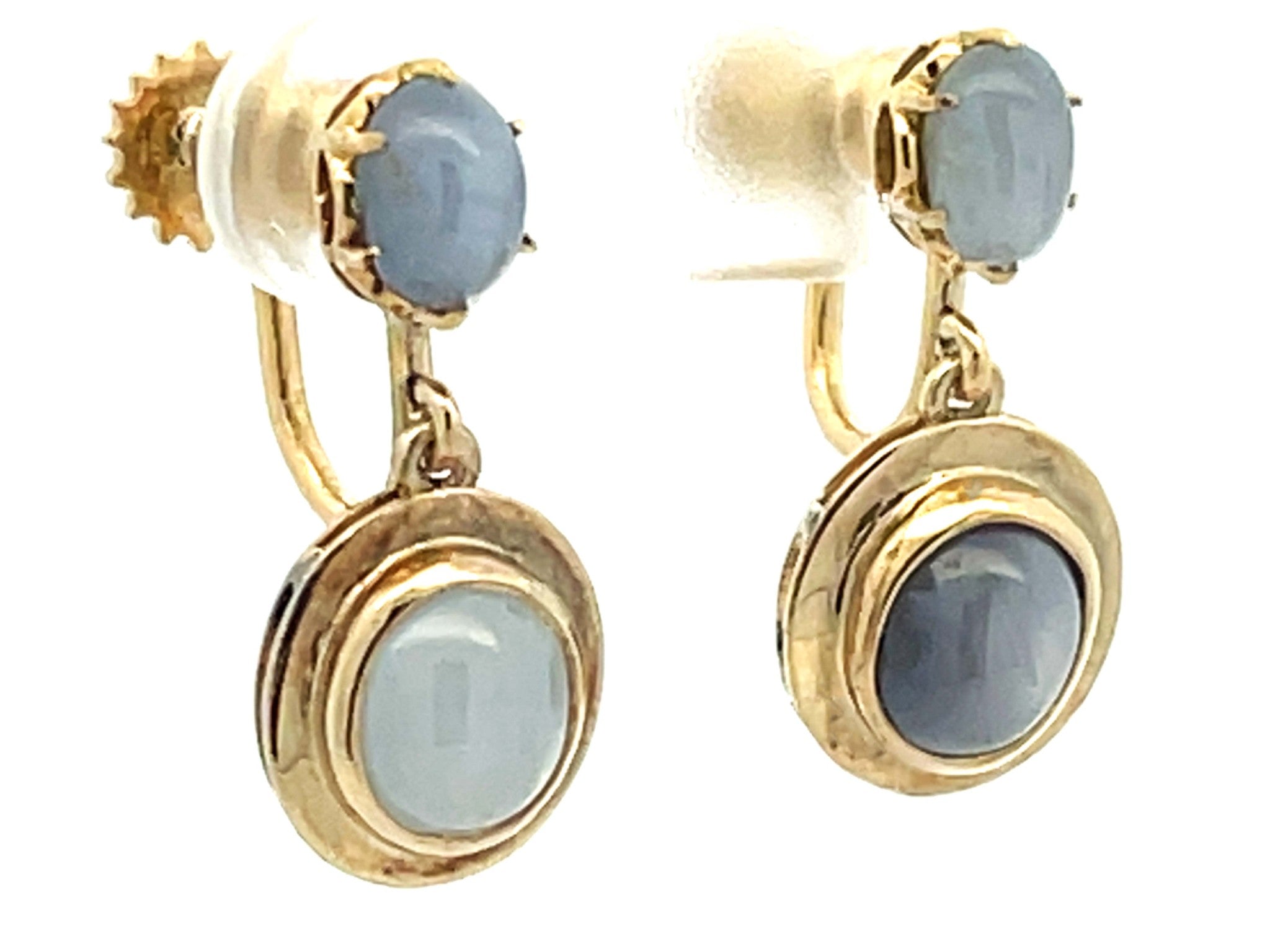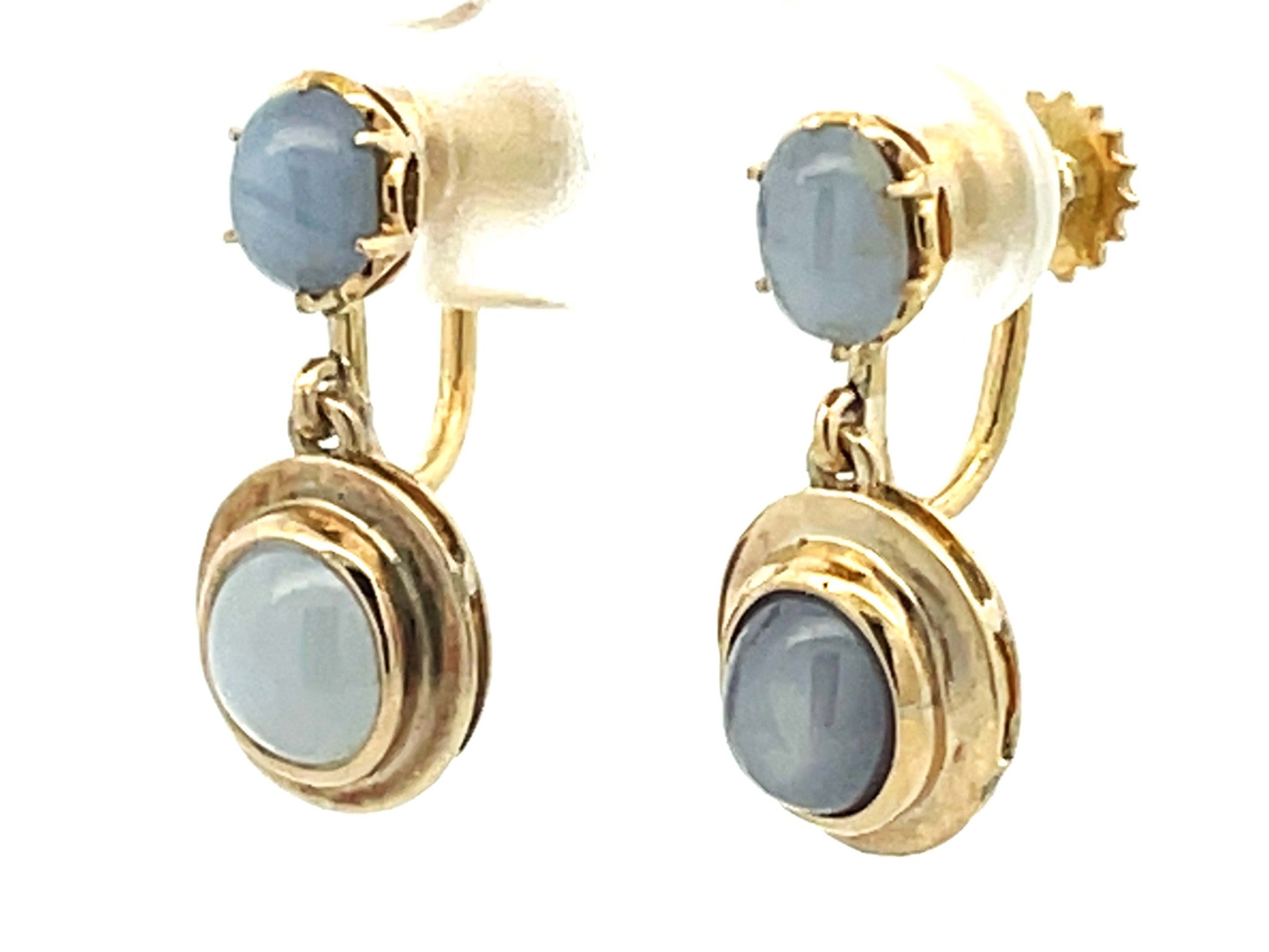 Dangly Star Sapphire Stud Drop Earrings 14k Yellow GoldItem Specifications:Metal: 14K Yellow GoldEarring Length: 20 mm longTotal Weight: 4.9 GramsGemstone Specifications:Gemstone: Star SapphireShape: OvalColor: Grayish BlueCut: Cabochon Condition: Preowned, Excellent