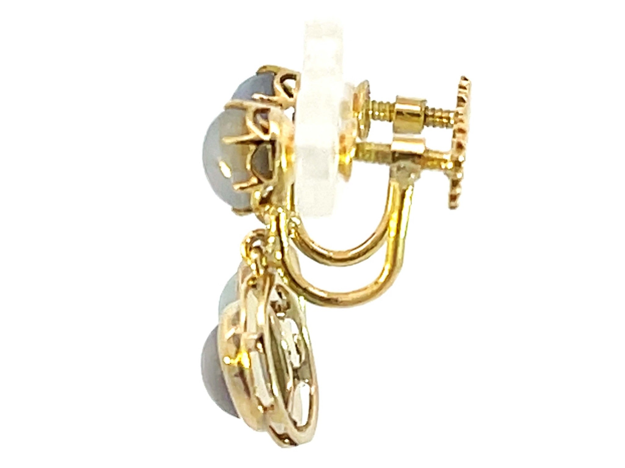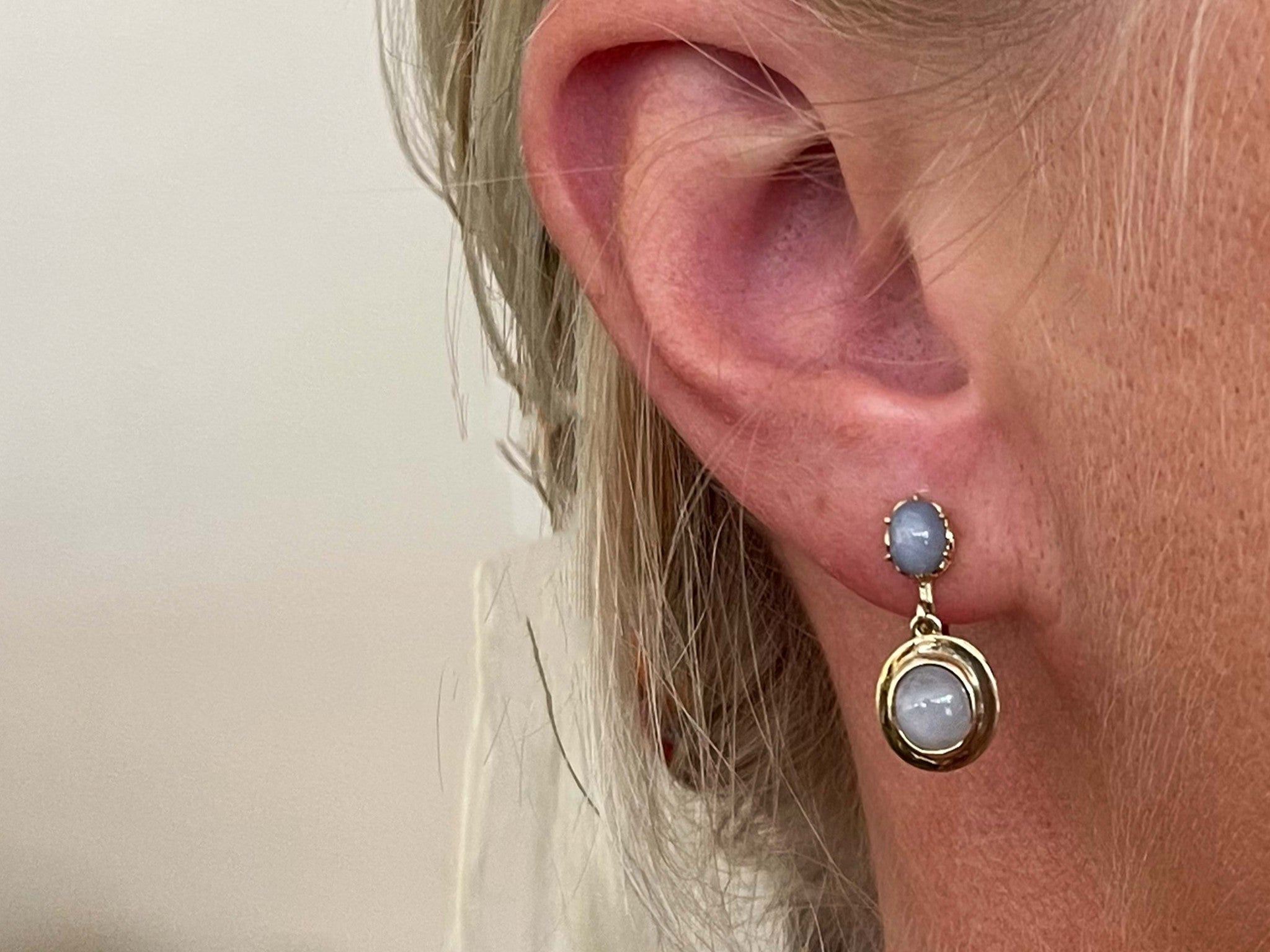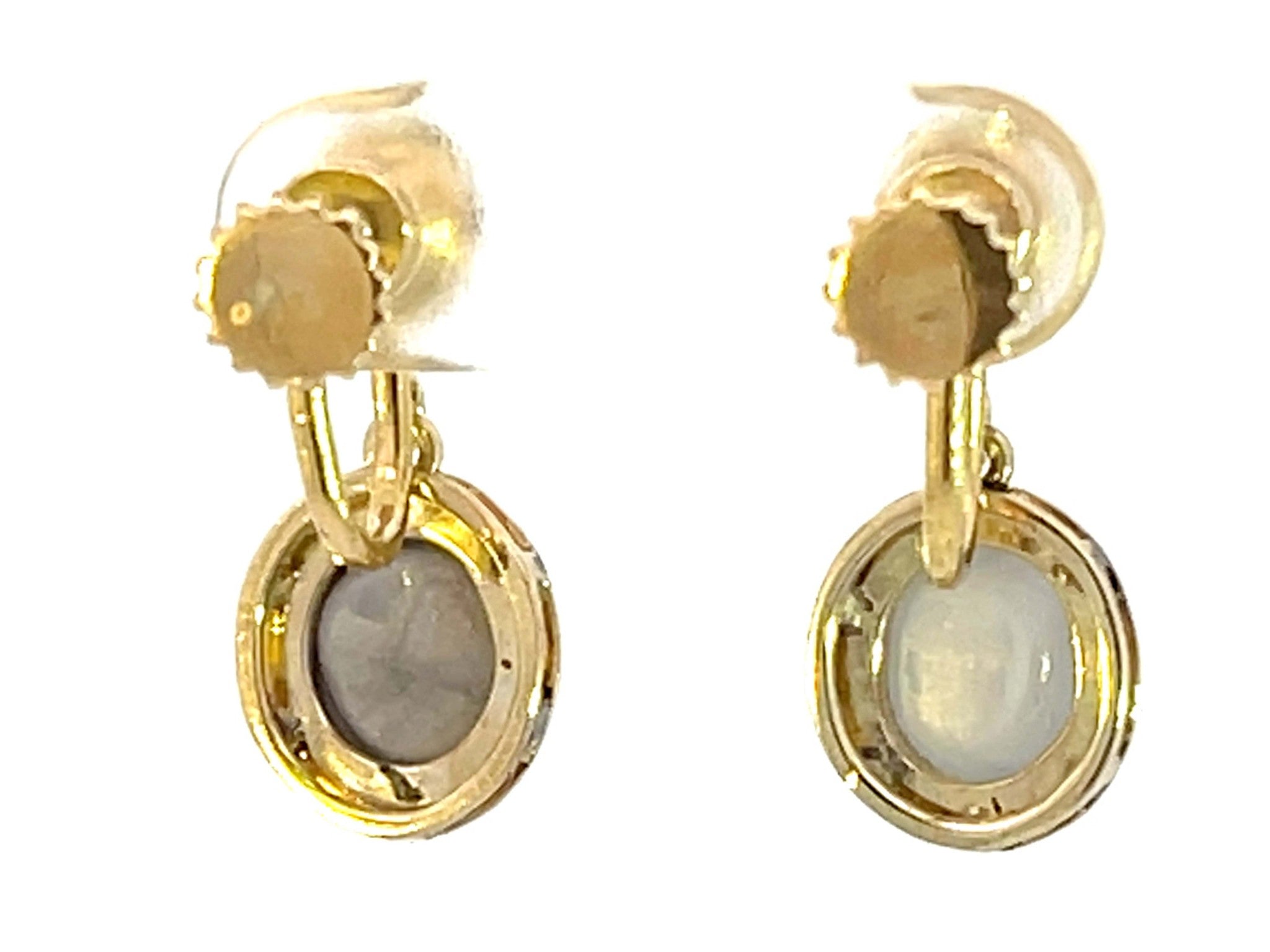 Dangly Star Sapphire Stud Drop Earrings 14k Yellow GoldItem Specifications:Metal: 14K Yellow GoldEarring Length: 20 mm longTotal Weight: 4.9 GramsGemstone Specifications:Gemstone: Star SapphireShape: OvalColor: Grayish BlueCut: Cabochon Condition: Preowned, Excellent