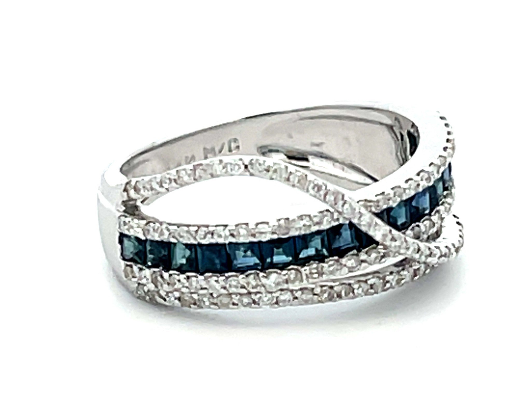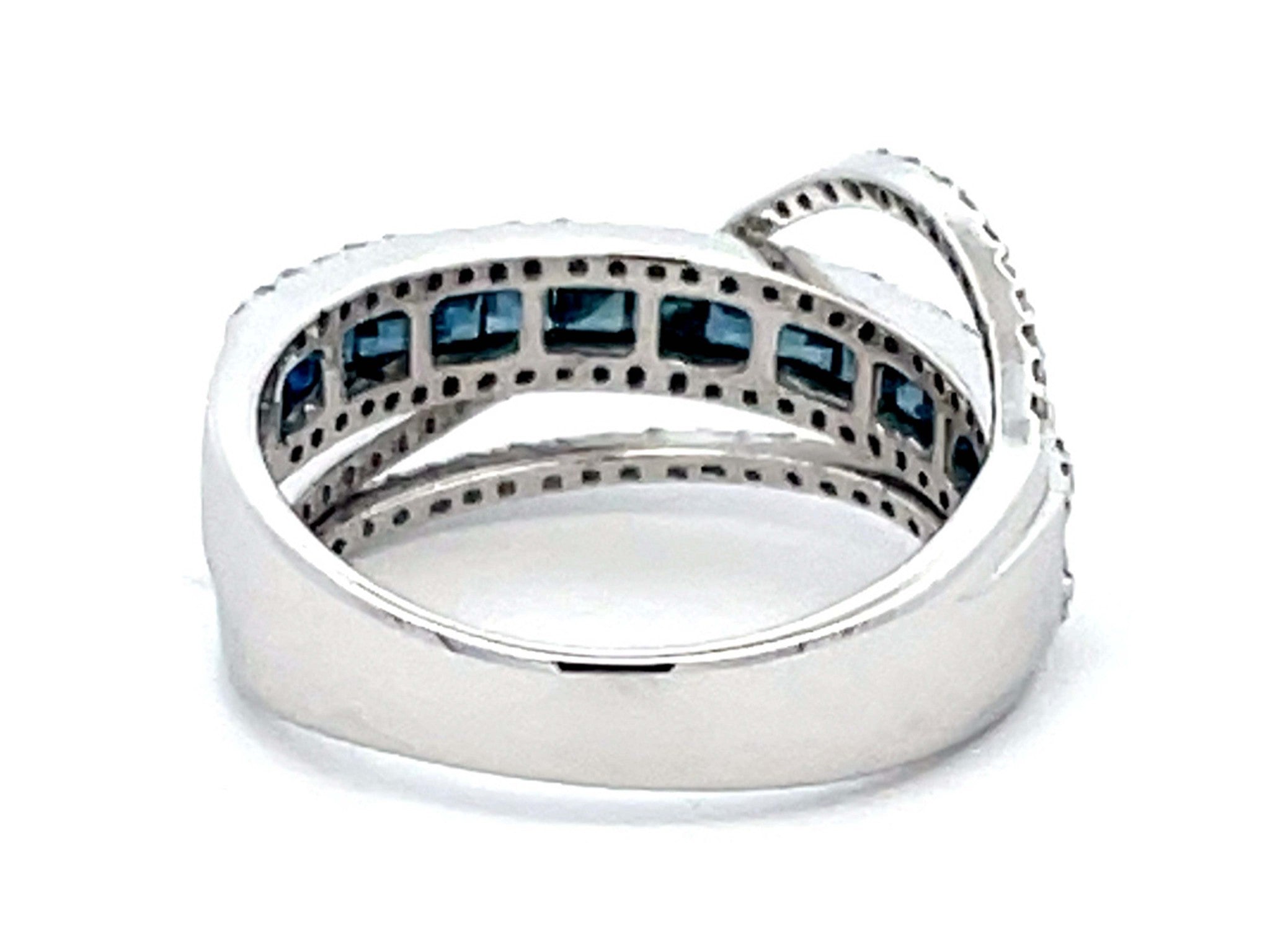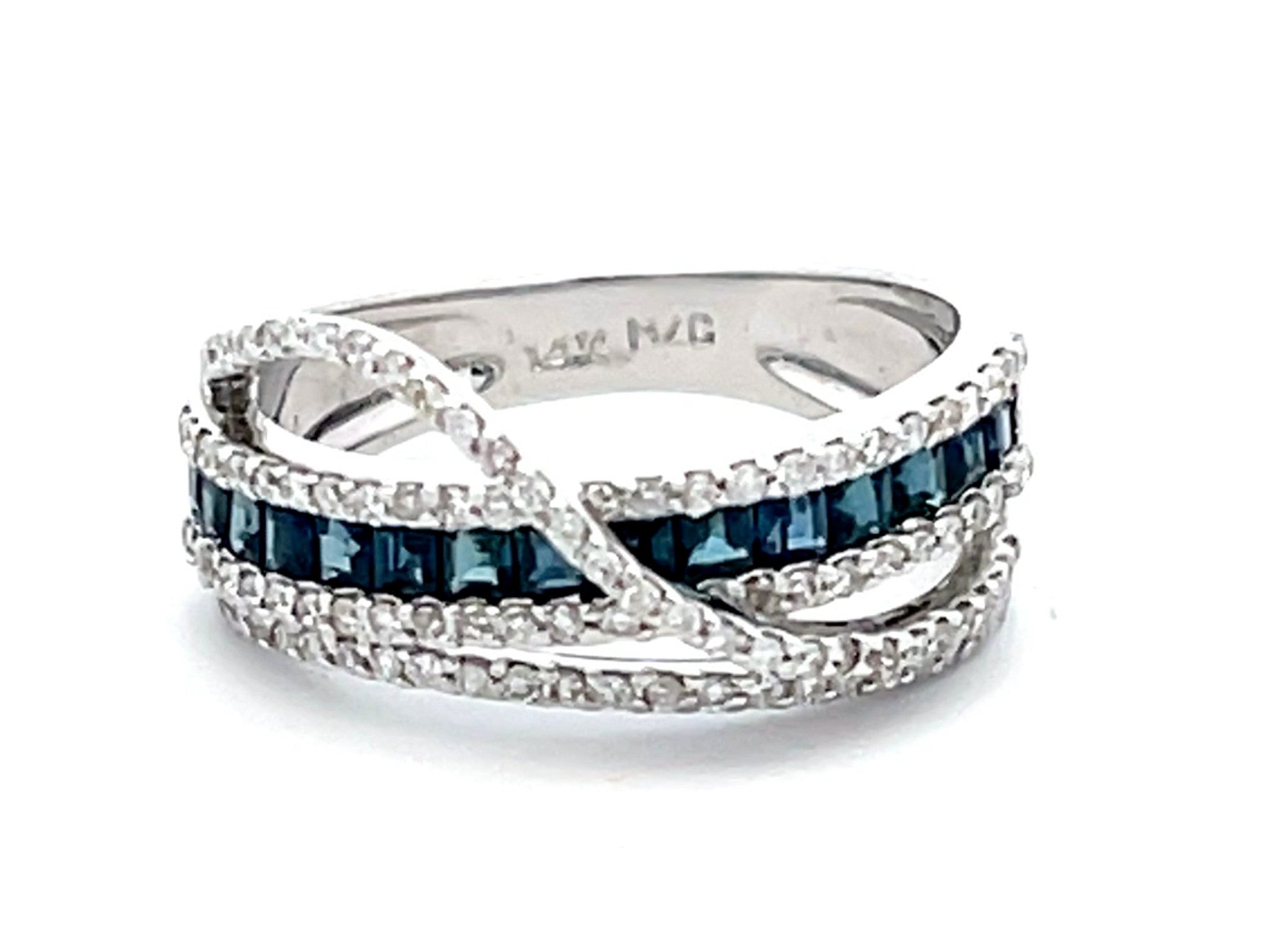 Item Specifications: Metal: 14k White GoldDiamond Count: 106 diamondsDiamond Carat Weight: 0.53 caratsDiamond Color: GDiamond Clarity: VS2-SI2Sapphire Carat Weight: 0.50Sapphire Count: 16 Ring Width: ~8.9 mmRing Size: 7 Total Weight: 4.2 GramsStamped: "14K" Condition: Preowned, Excellent