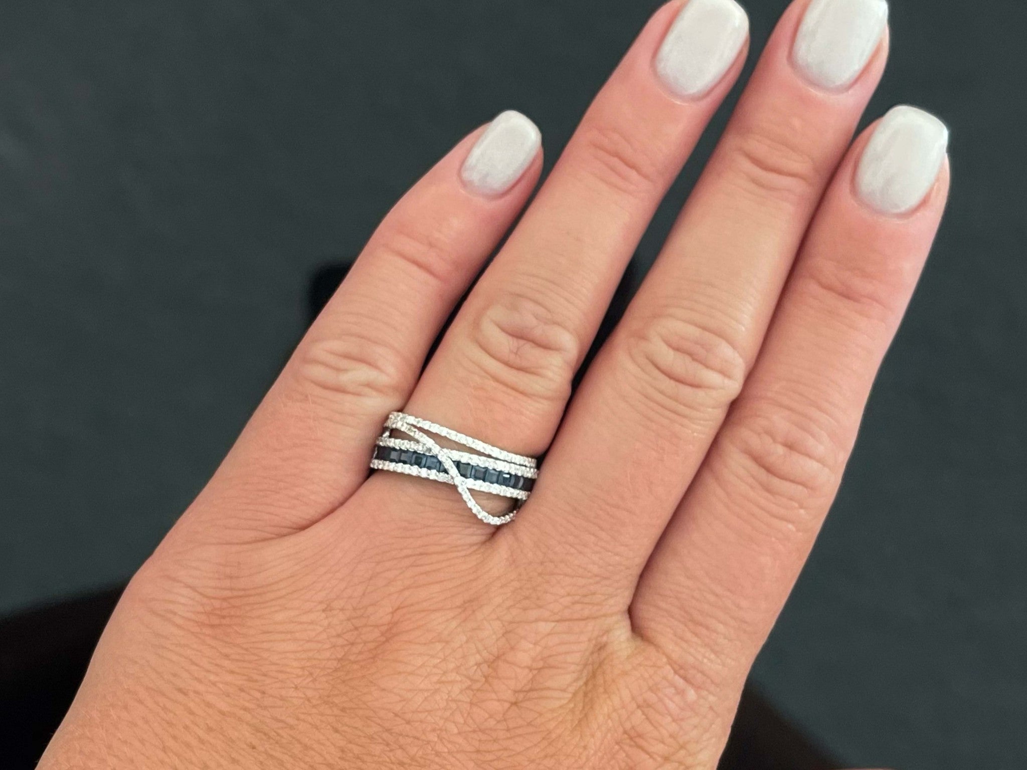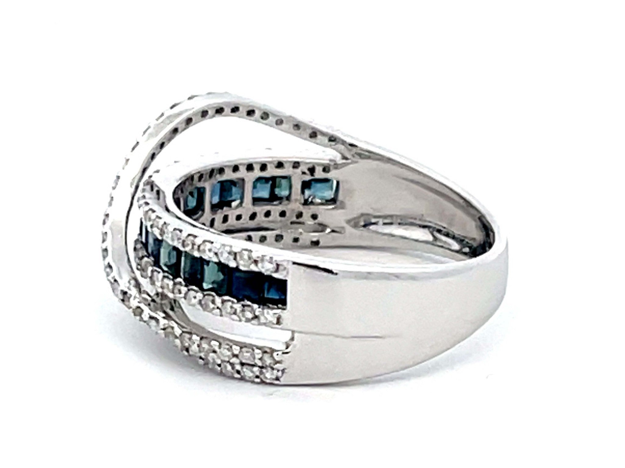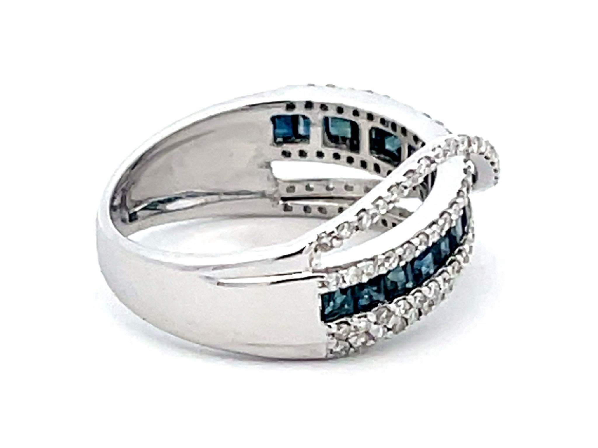 Item Specifications: Metal: 14k White GoldDiamond Count: 106 diamondsDiamond Carat Weight: 0.53 caratsDiamond Color: GDiamond Clarity: VS2-SI2Sapphire Carat Weight: 0.50Sapphire Count: 16 Ring Width: ~8.9 mmRing Size: 7 Total Weight: 4.2 GramsStamped: "14K" Condition: Preowned, Excellent