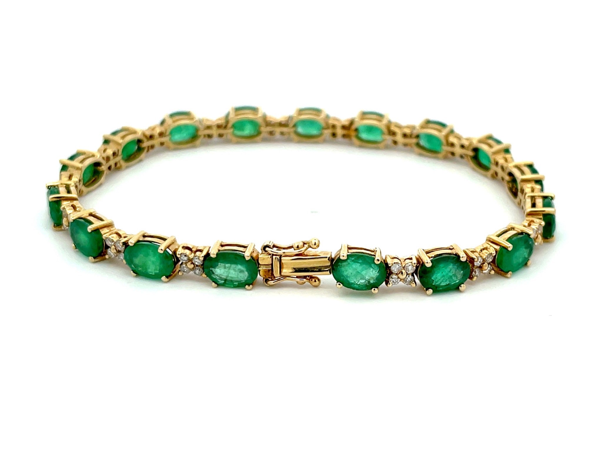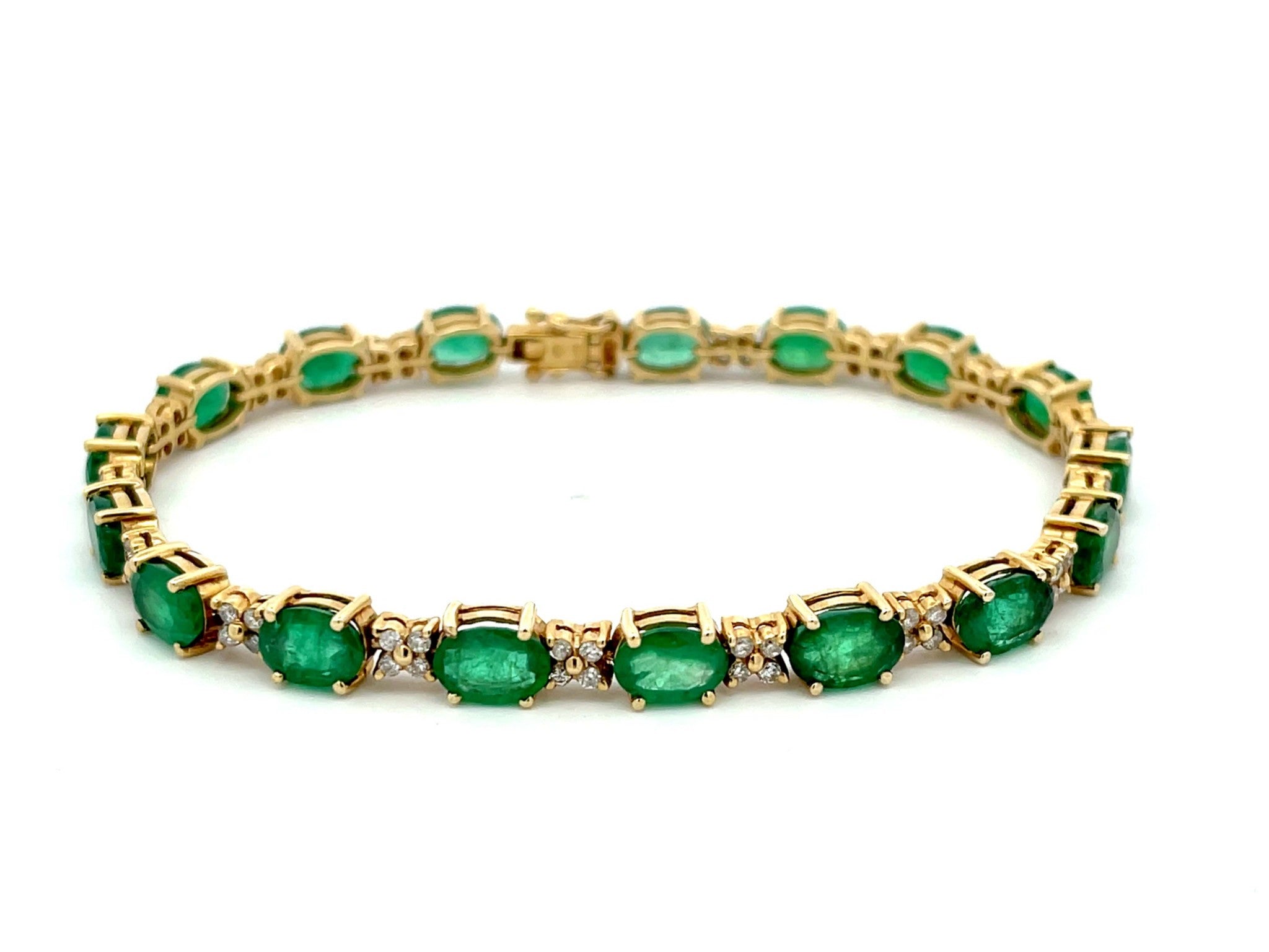 Bracelet Specification: Total Weight: 13.4 Grams Bracelet Width: 5.6 mmBracelet Length: 7 in Diamonds: 64 round brilliant diamondsDiamond Color: GDiamond Clarity: SI1-SI2 Diamond Total Weight: ~0.64 carats Gemstones: 17 green oval emeraldsEmerald...