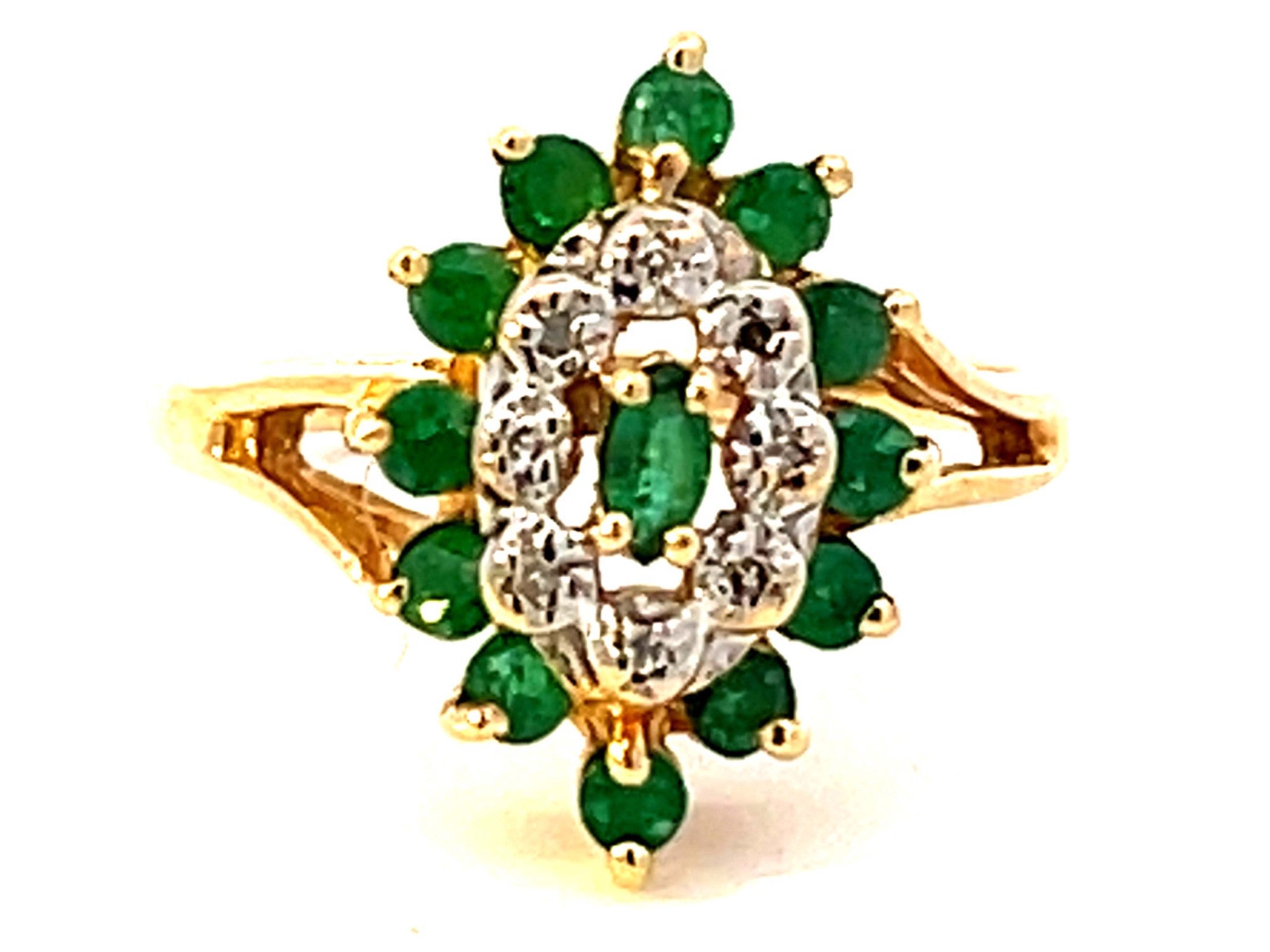 Item Specifications:Metal: 14K Yellow GoldStyle: Statement RingRing Size: 6.25 (resizing available for a fee)Total Weight: 4 GramsGemstone Specifications:Gemstones: 12 green emeraldsShape: roundCondition: NewStamped: "14K" "585"