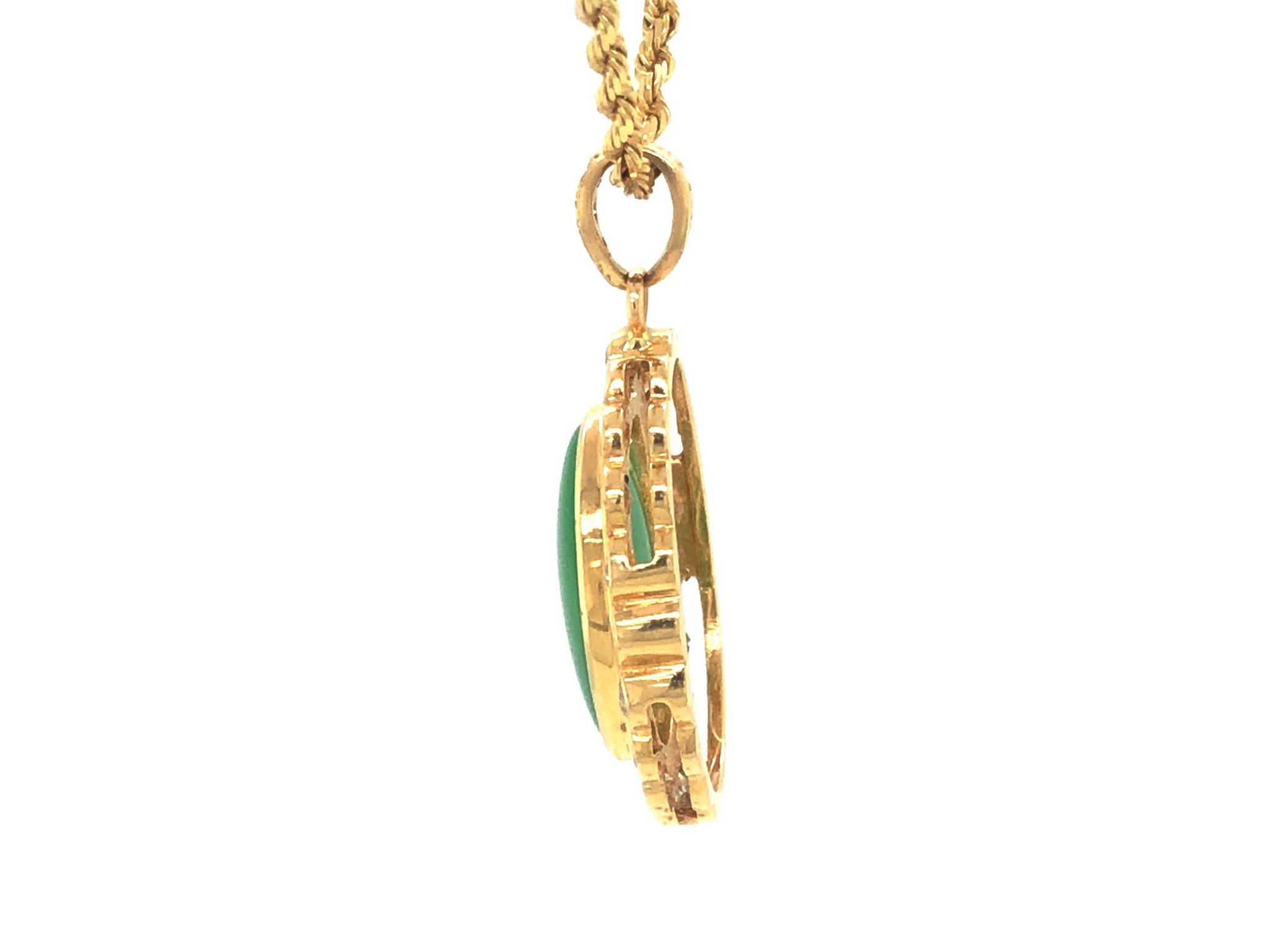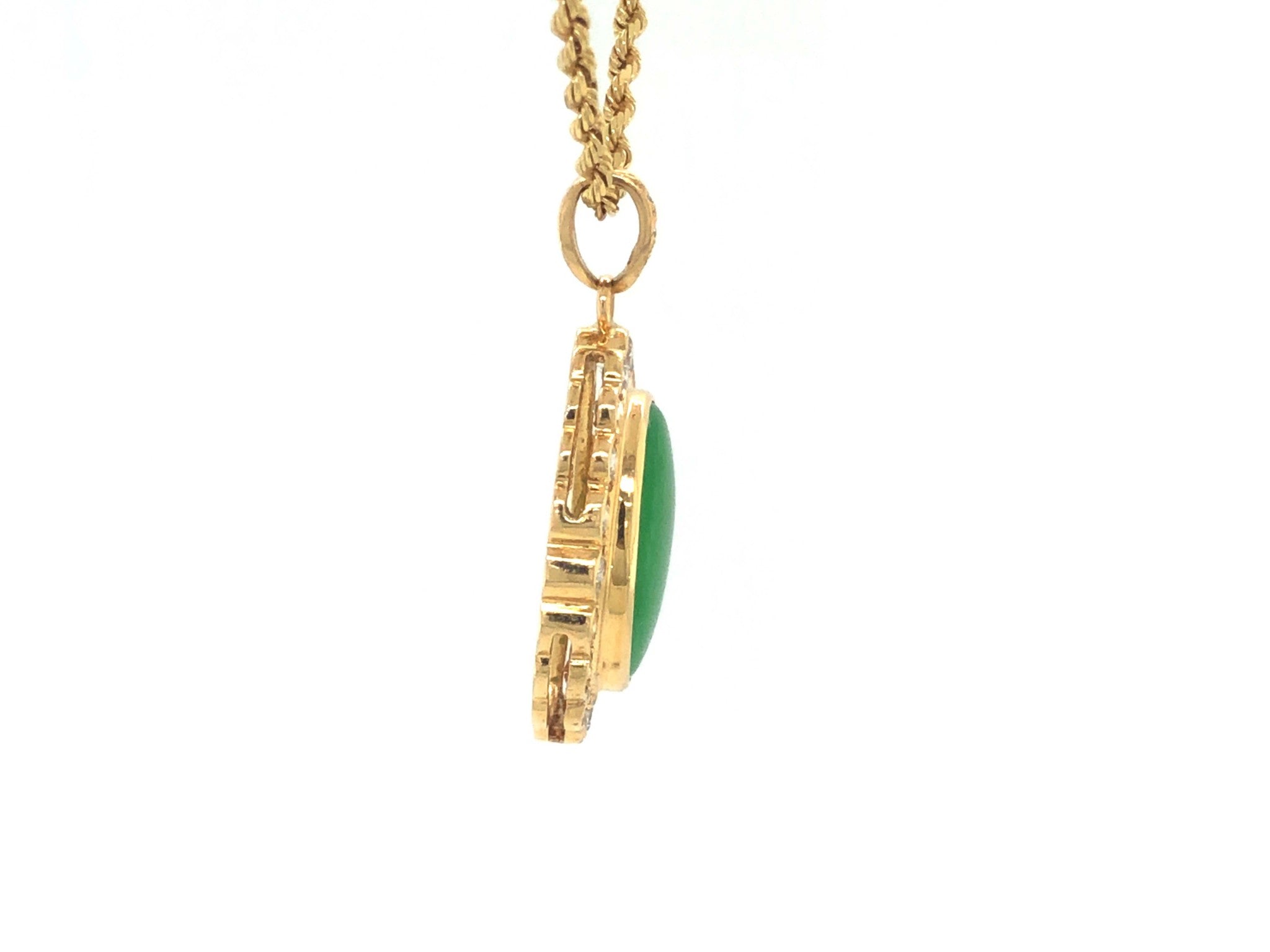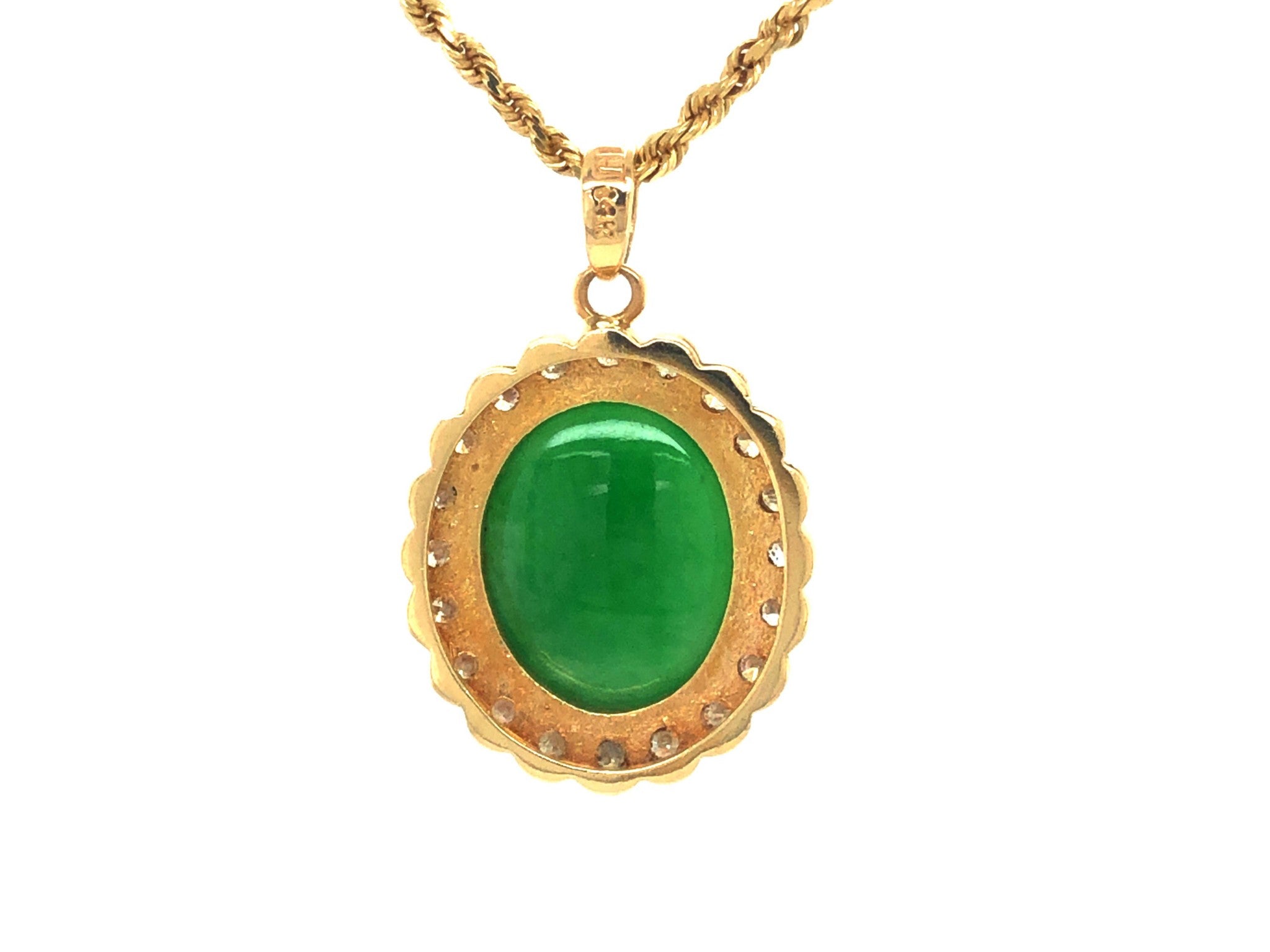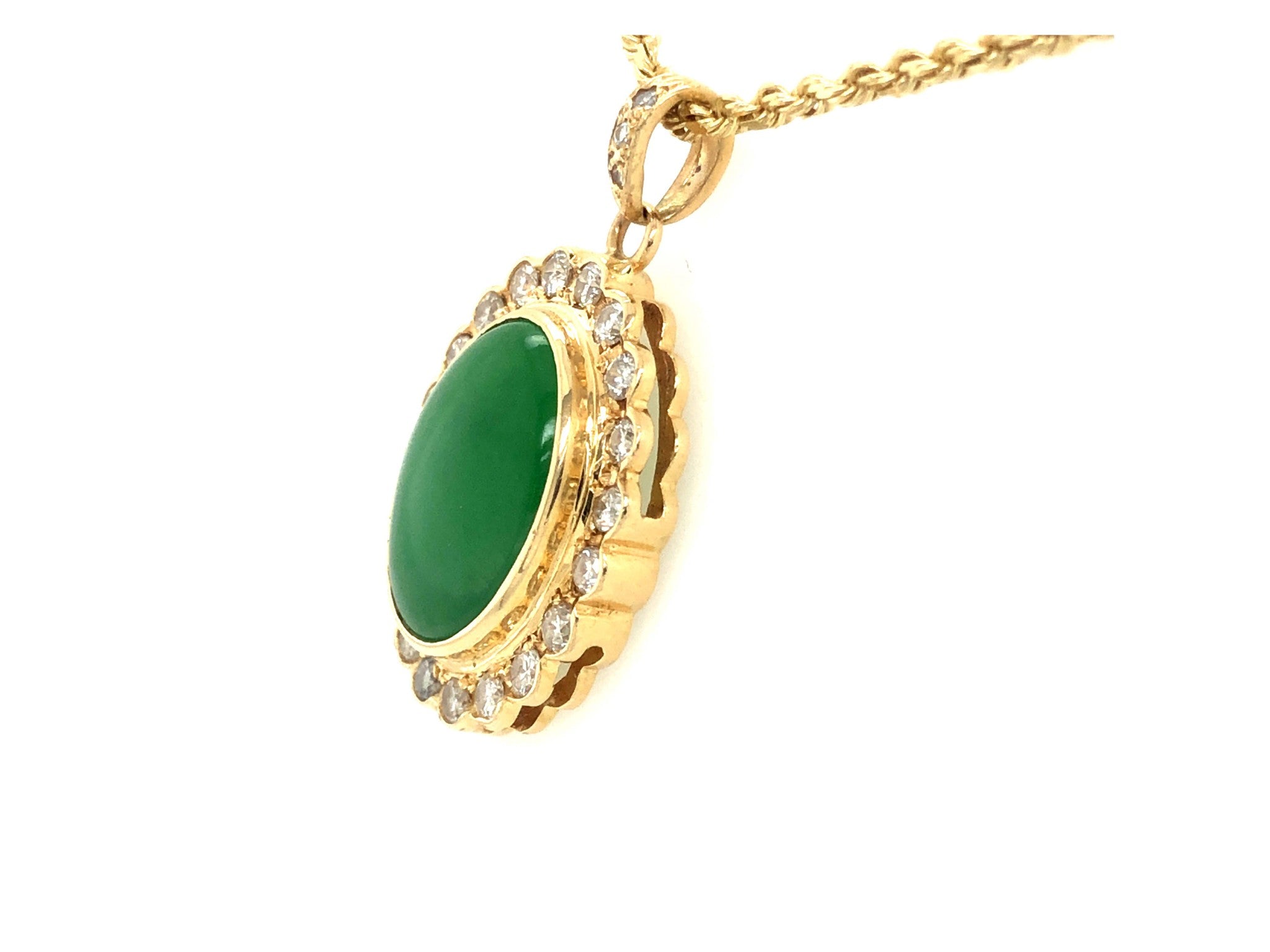 GIA Vintage Oval Cabochon Green Translucent Jadeite Jade and Diamond Pendant in 14k Yellow Gold. This stunning pendant is set with a gorgeous oval shape double cabochon green jadeite jade with a round brilliant diamond halo. The center Jadeite Jade is grade B with stunning translucent natural apple green color and amazing luster. The Jade is bezel set and measures approximately 16.50 mm x 13.30 mm x 4.64 mm. The halo has 20 round brilliant cut diamonds totaling ~1.00 carats. The diamonds are G in color and VS-SI2 in clarity There are 3 additional diamonds on the bail weighing a total of ~0.02 carats. The pendant is ~27.00 mm x 21.72 mm. The bail is stamped "14k." Total weight is 6.27 grams. Vintage in excellent condition. GIA Report#: 5222406202