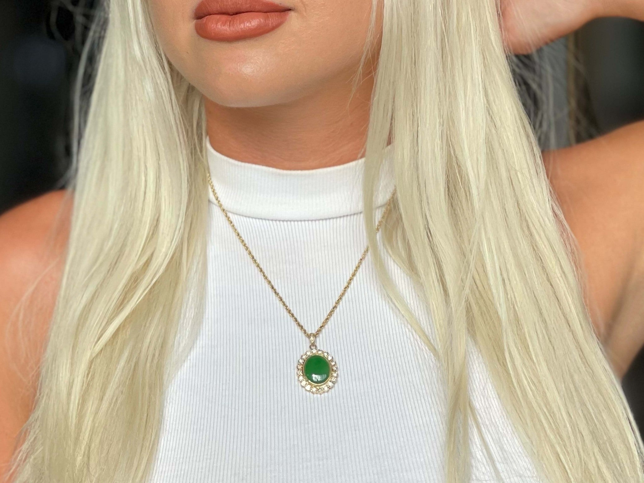 (Actual color of jade may slightly vary depending on screen calibration, lighting or camera settings. Please see image of pendant on model for more accurate color.)