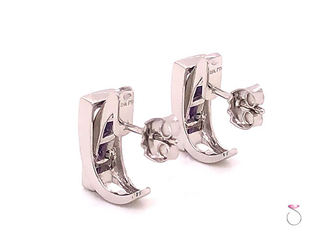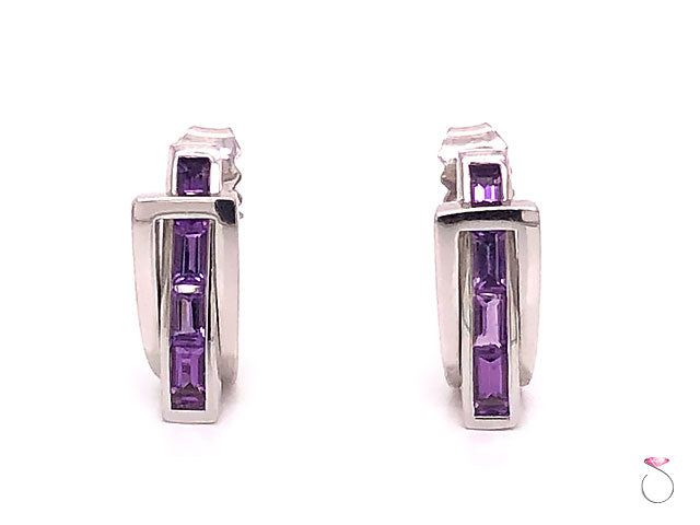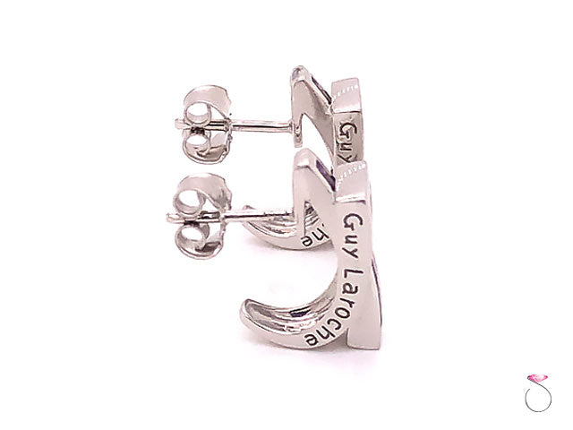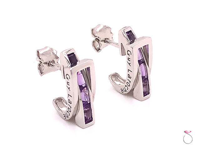 French Designer Guy Laroche Amethyst huggie earrings in 18k white gold. These earrings have a unique pass through design. The beautifully designed earrings features four (4) rectangular cut Purple Amethyst gemstones set in a channel that passes through a rectangle openning. A total of eight (8) Amethyst gems are set on these earrings, totaling approximately 1.60 carats. The Amethyst have a beautiful purple color. The earrings are masterfully crafted in 18k white gold and have a high polished finish. These earrings have post backs for pierced ears and friction push back backing. The earrings measure approximately 15.00 mm high x 5.75 mm wide. Hallmarked "Guy Laroche" and stamped "18k". Total weight 4.70 grams. These are new old stock earrings in excellent condition.