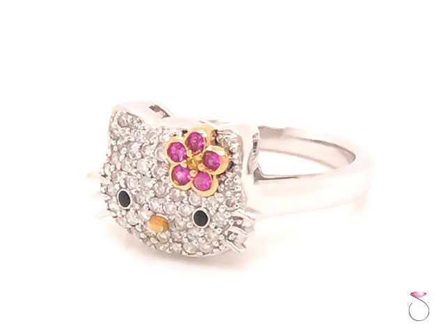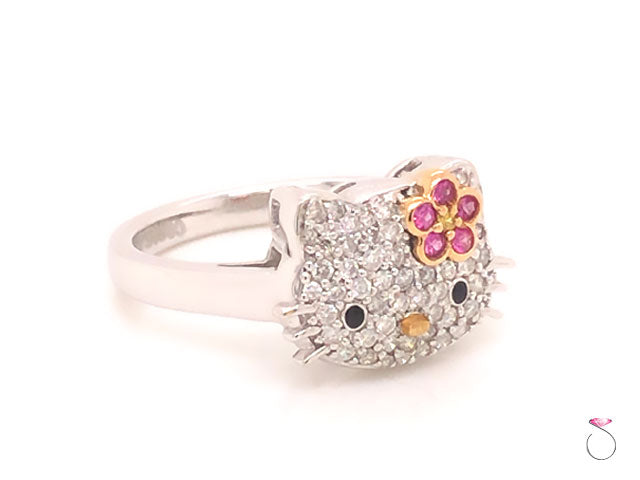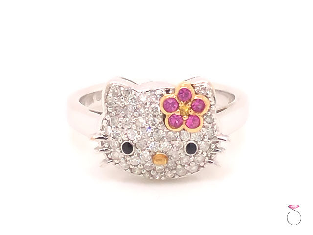 Authentic Sanrio Hello Kitty Diamonds and pink sapphire ring in 18k white gold by Kimora Lee Simmons. This gorgeous Sanrio is beatifully crafted in 18K white gold and set with over 0.50 carats of high quality diamonds and pink sapphires. The diamonds are G - H in color and VS in clarity totalling approximately 0.50 carat. Five round oink sapphires are bezel set in a flower design totaling approximately 0.15 carat. One 0.01 carat round yellow diamond is set at the center of the flower. The kitty eys are in black enamel. The ring measures approximately 15 mm x 10.50 at the top. The is hallmarked "Sanrio", engraved with Kimora Lee Simons logo and stamped 18K on the inside of the ring. This is a pre-owned authentic Sanrio ring in very good condition. The ring is size 7 and can be resized for a fee. Total weight 5.70 grams.
