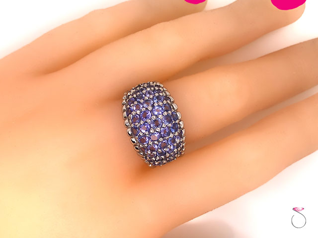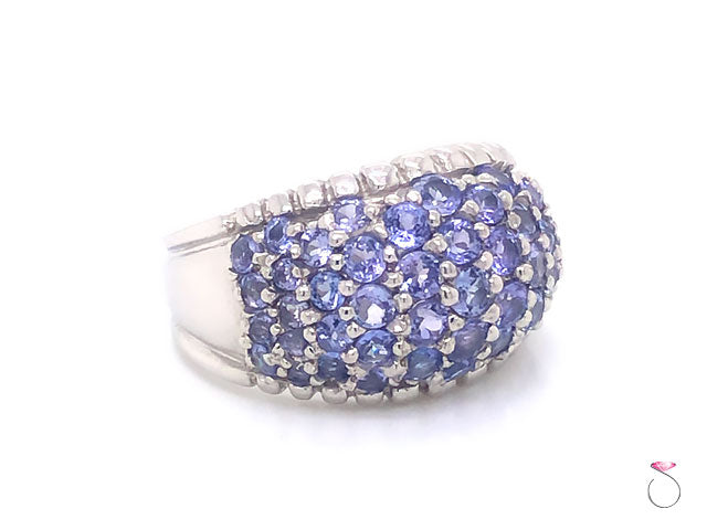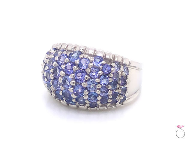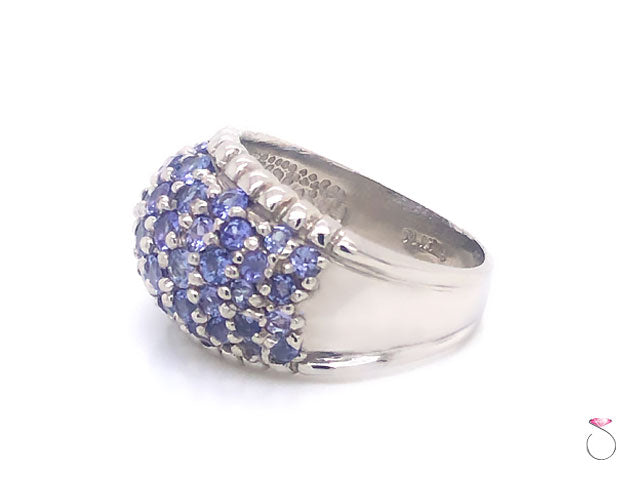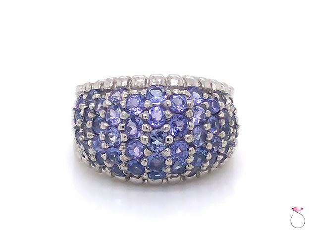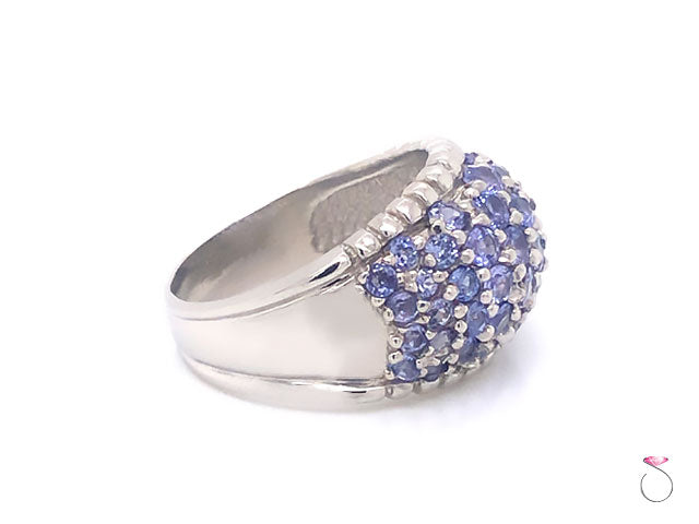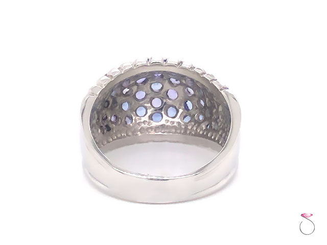 This magnificent natural Tanzanite dome ring in Platrinum is a real beauty. Featuring 49 round brilliant bluish purple Tanzanites totaling approximately 2.00 carats. The Tanzanites are Pave' set in a dome with a scalloped boarder. This gorgeous ring is 14.70 mm wide at the top and tapers down to 5.10 mm at the bottom. The ring is masterfully crafted in Platinum with a high polish finish. The ring is size 9 and can be easily re-sized. Resizing available for a fee. The ring is stamped "PLAT" on the inside. Total weight 17.20 grams.