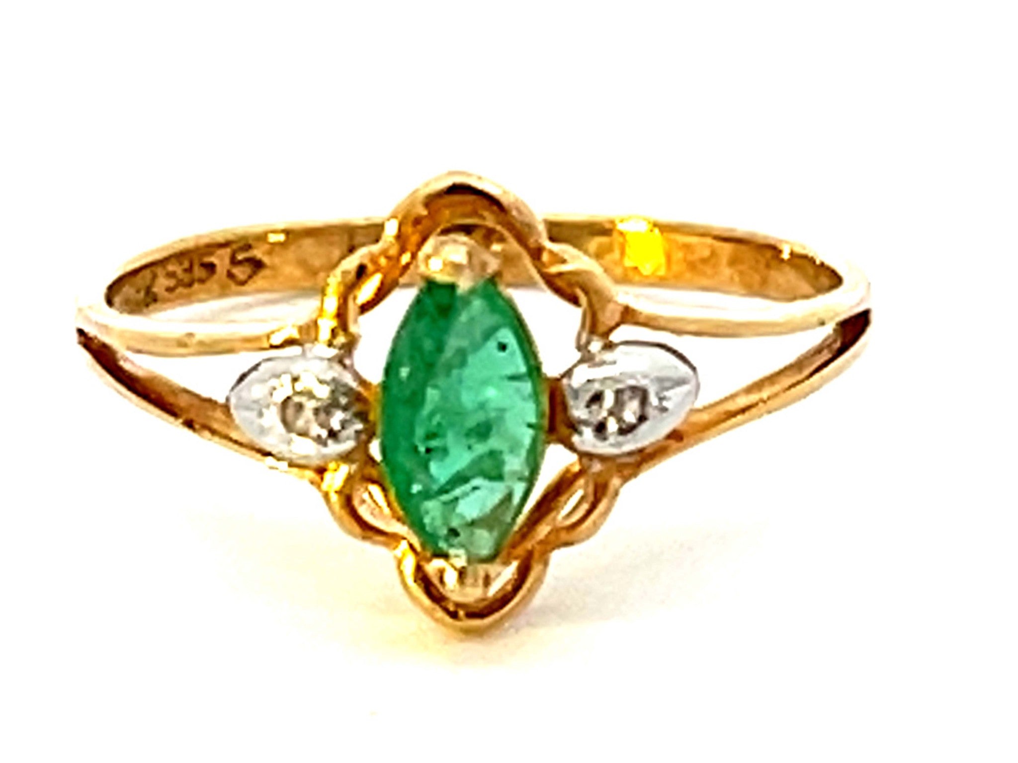 Item Specifications:Metal: 14K Yellow GoldStyle: Statement RingRing Size: 5.5 (resizing available for a fee)Total Weight: 1.3 GramsGemstone Specifications:Gemstones: 1 green emeraldShape: marquiseCondition: NewStamped: "14K" "585"