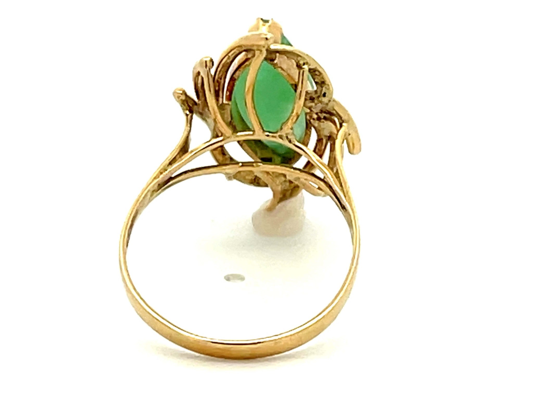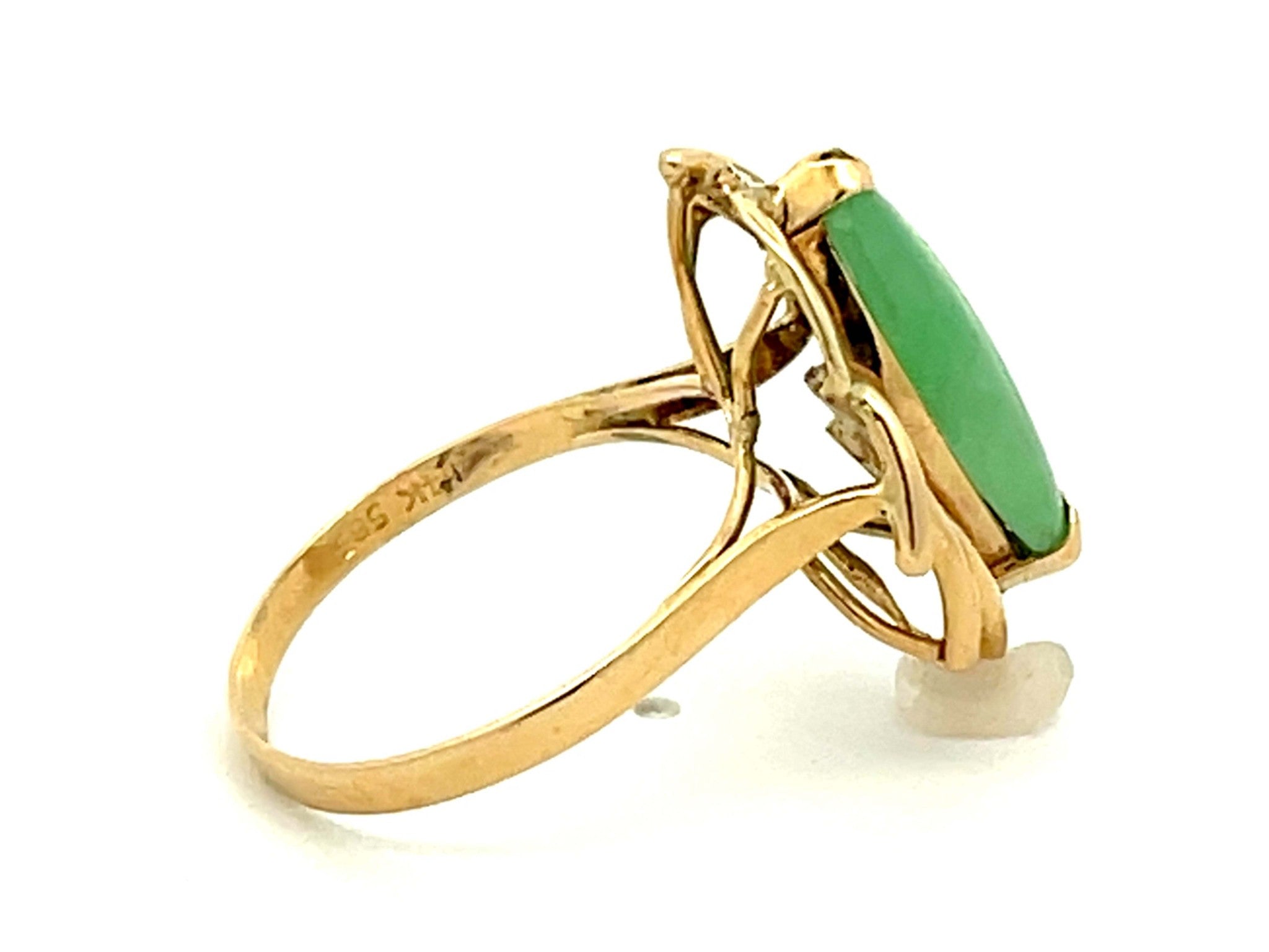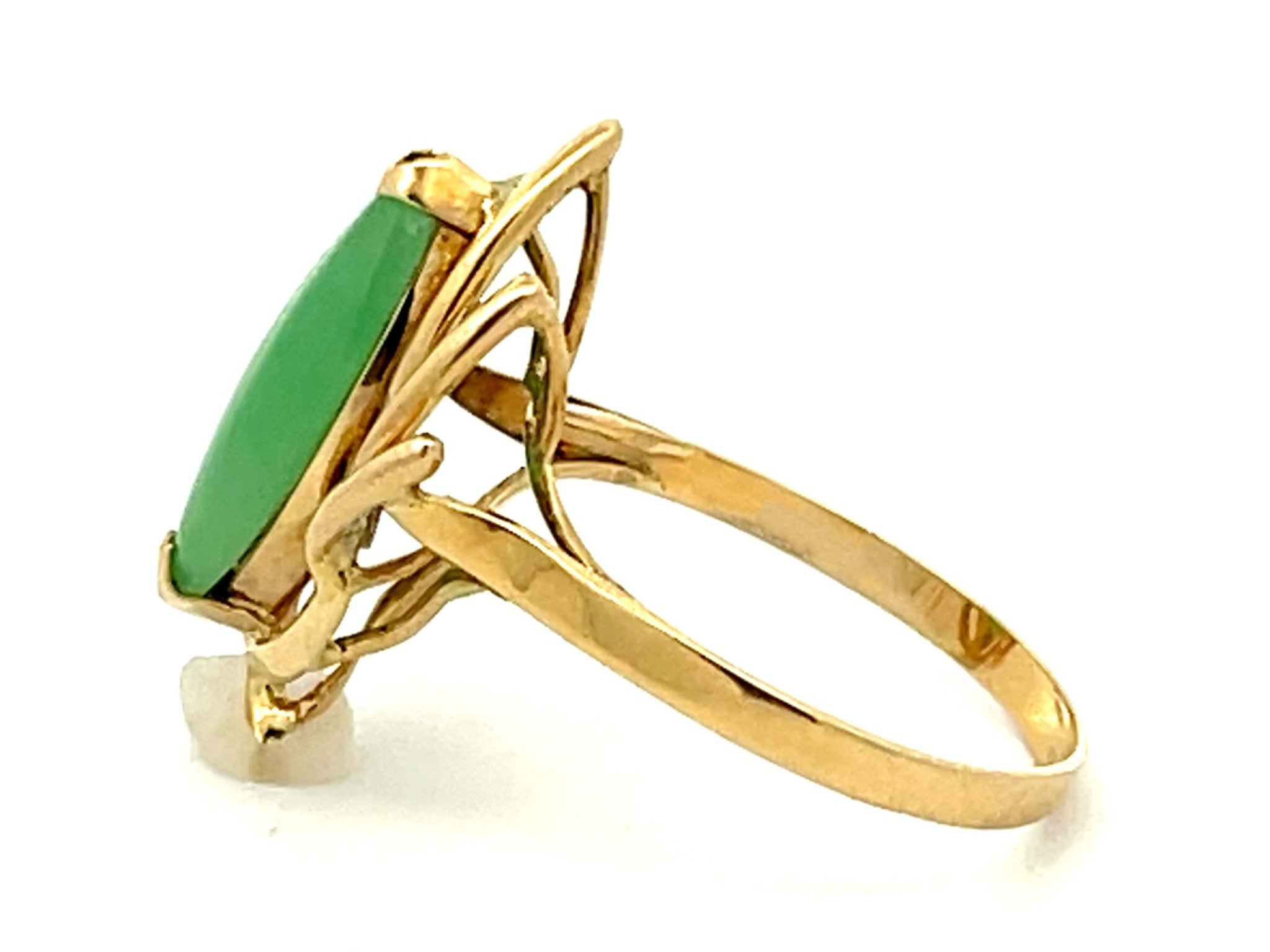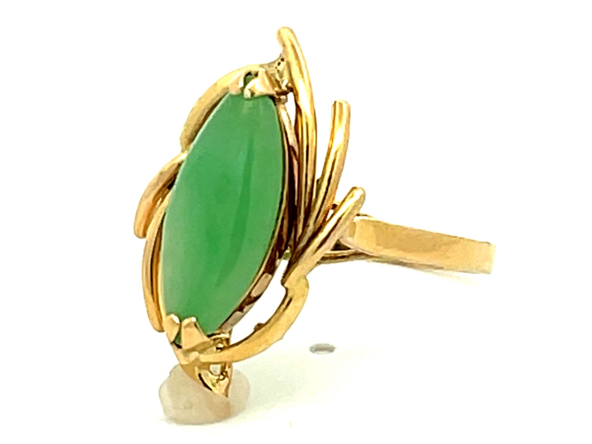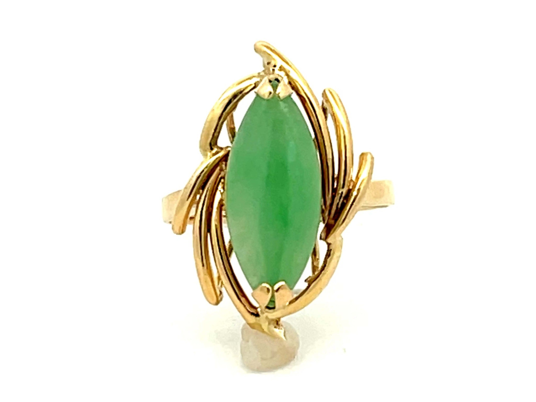 Item Specifications:Metal: 14K Yellow Gold Style: Statement RingRing Size: 7 (resizing available for a fee)Total Weight: 3.3 GramsGemstone: Jadeite JadeCondition: Vintage, ExcellentStamped: "14k" "585"