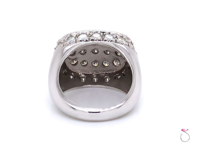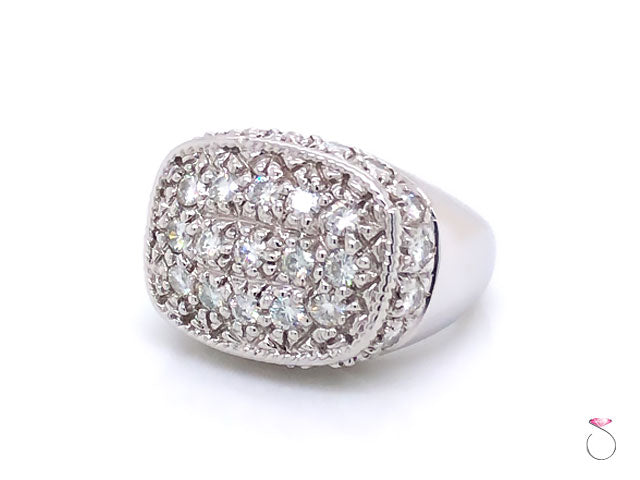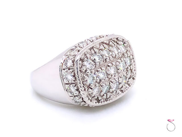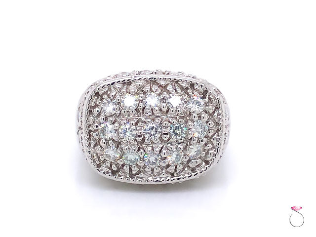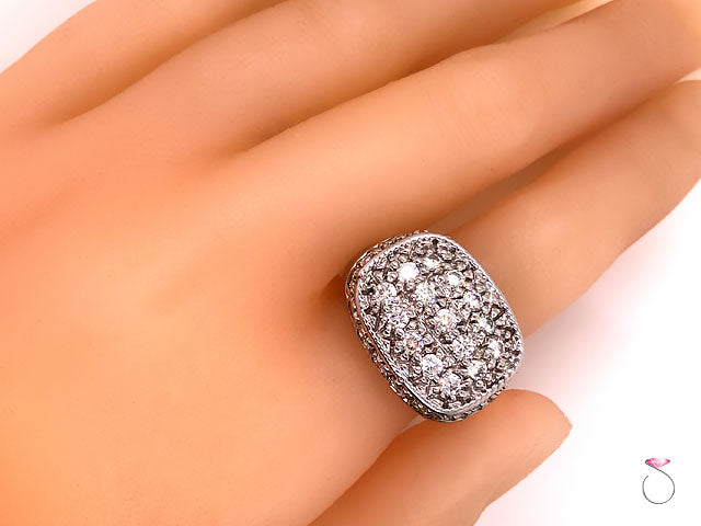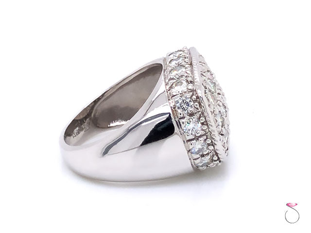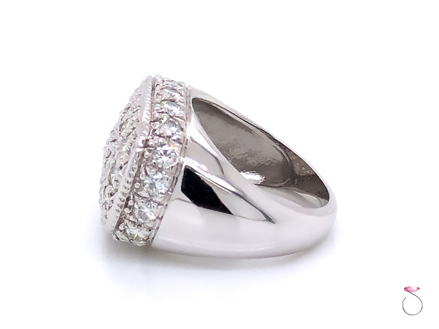Elegant Men's Moissanite Ring in 14K White Gold. The ring features 15 round brilliant Pave' flower set Moissanites at the top of the ring totaling approximately 1.50 ctw. The ring is also set with 20 round brilliant Moissanites surrounding the top and totaling approcimately 2.00 carats. The Moissanites are VS in clarity, and G in color. The total weight of Moissanites is approximately 3.00 carats. The ring has a very beautiful design and clean lines that would work well as an every day statement ring. The ring is crafted in 14K white gold with high polish finish. The ring is stamped "14K" and Hallmarked on the inside. The total weight of the ring is 13.70 grams. This ring is size 9.50 (re-sizing is available for a fee).