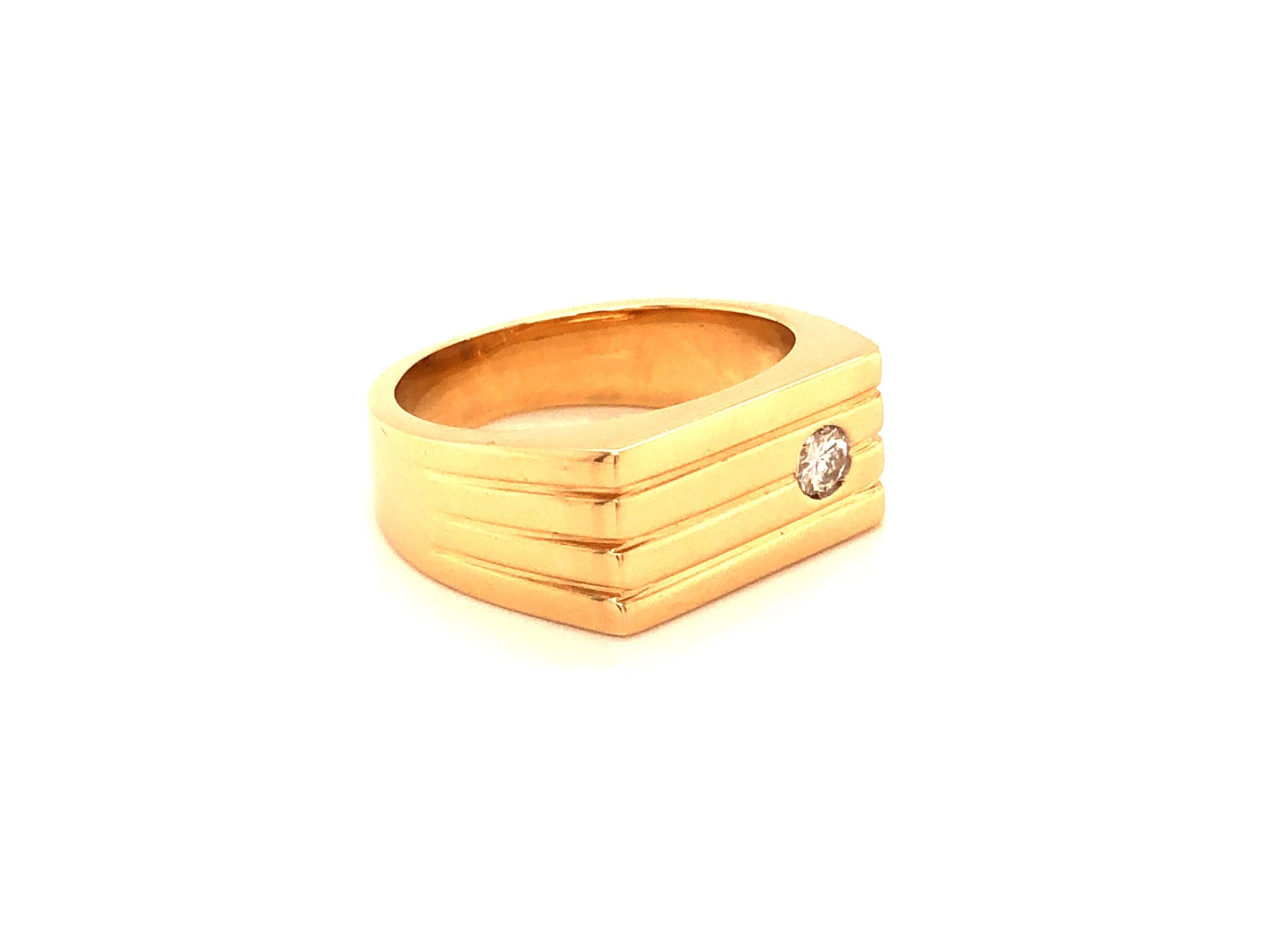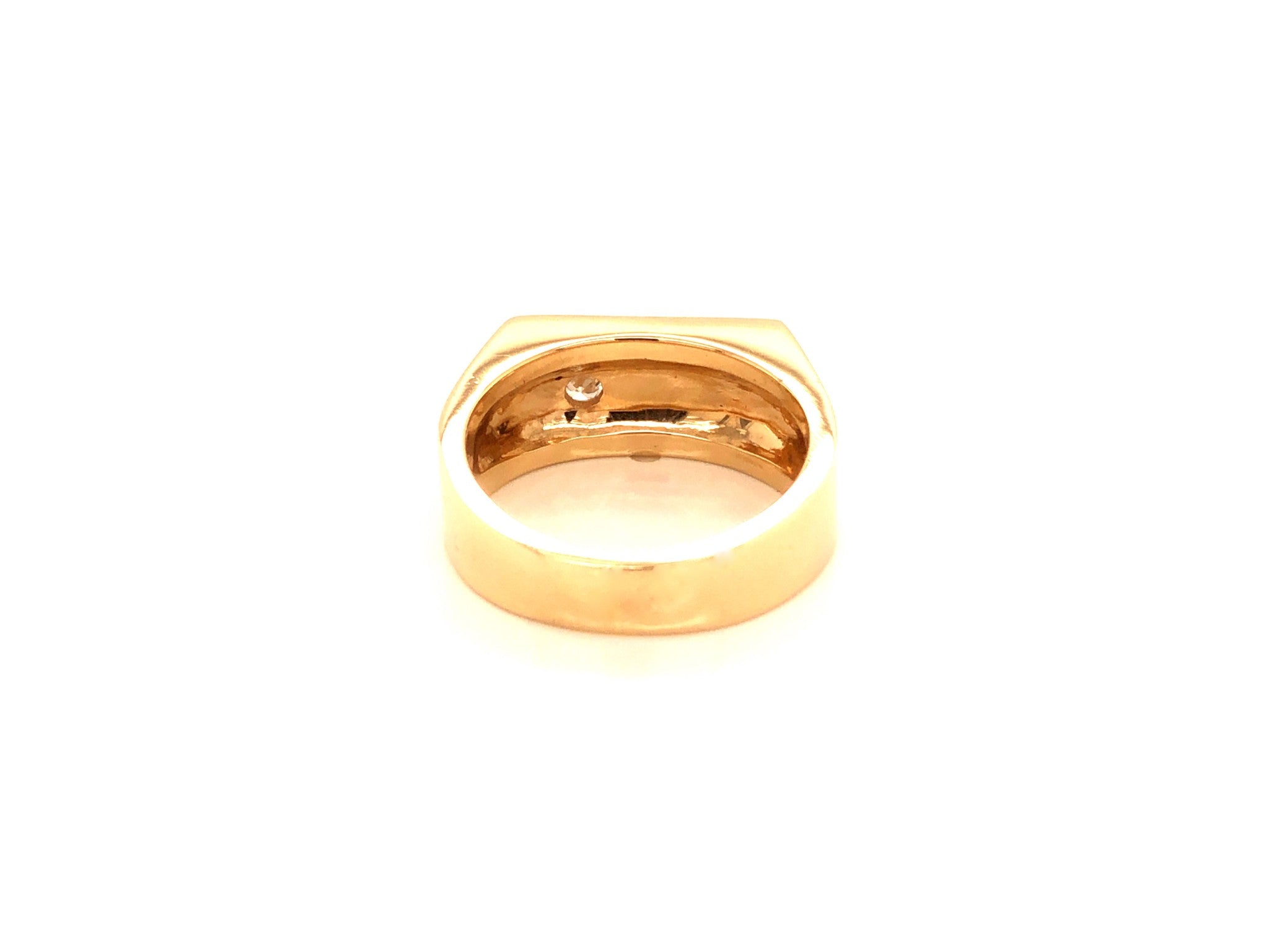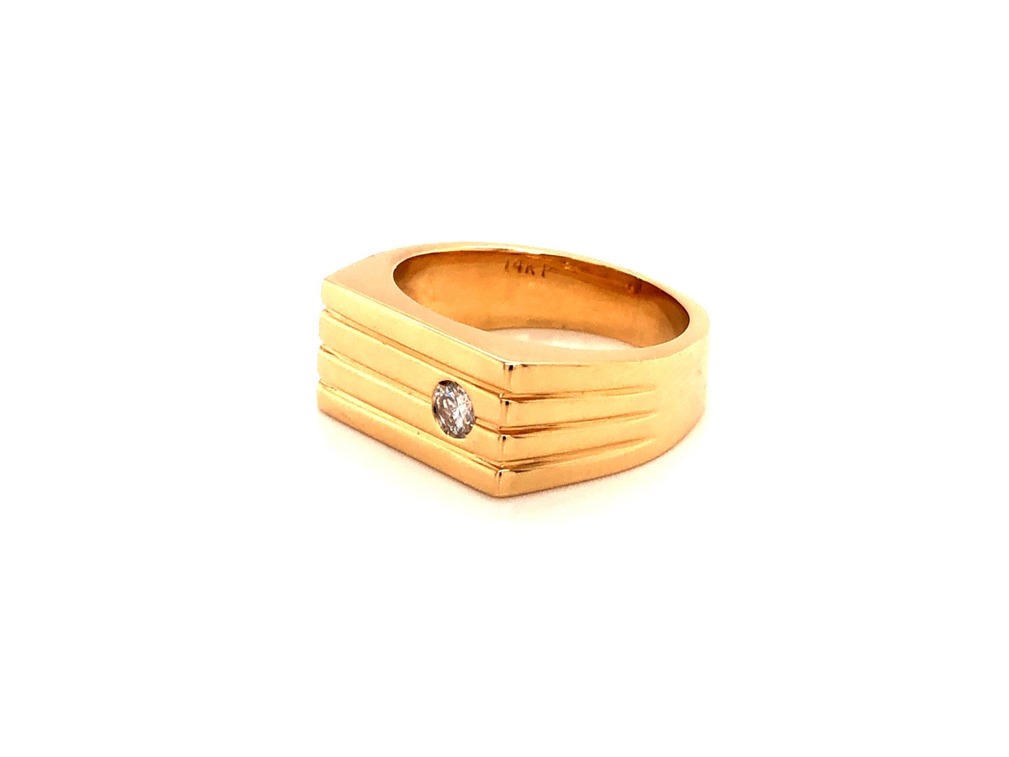 Mens diamond pinky ring in 14k yellow gold with a high polish finish. The diamond is flush set and weighs approximately 0.15 carats. The diamond is G-H in color and SI1 in clarity. The ring is 9mm wide and the total weight of the ring is 11.90 grams. The ring is stamped "14k" on the inside and is size 8.5. This is a preowned ring in very good condition.