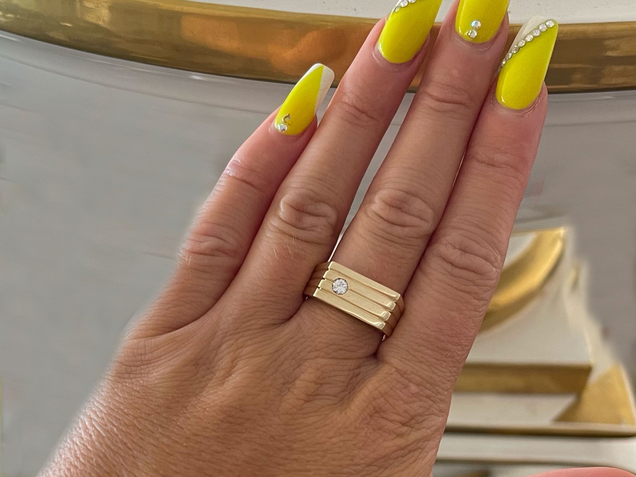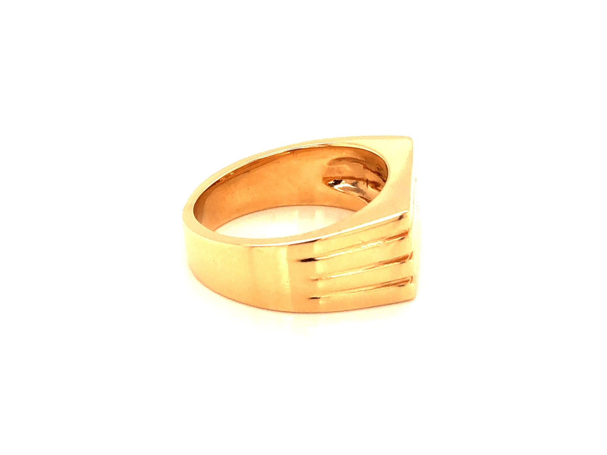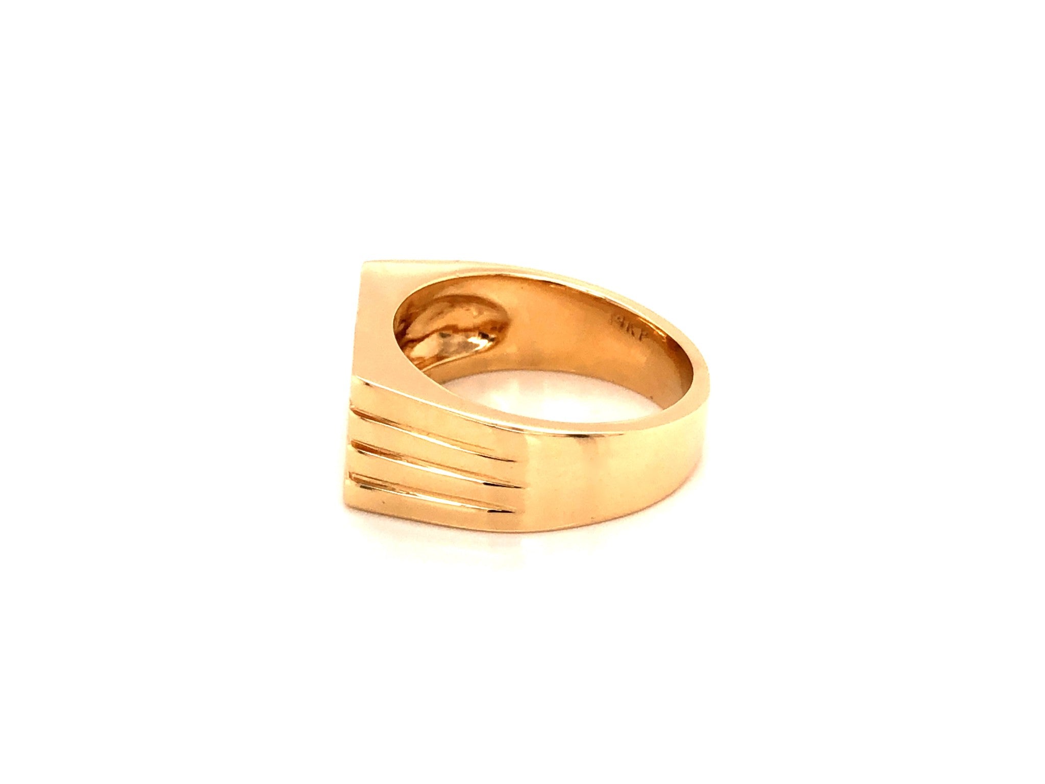 Mens diamond pinky ring in 14k yellow gold with a high polish finish. The diamond is flush set and weighs approximately 0.15 carats. The diamond is G-H in color and SI1 in clarity. The ring is 9mm wide and the total weight of the ring is 11.90 grams. The ring is stamped "14k" on the inside and is size 8.5. This is a preowned ring in very good condition.