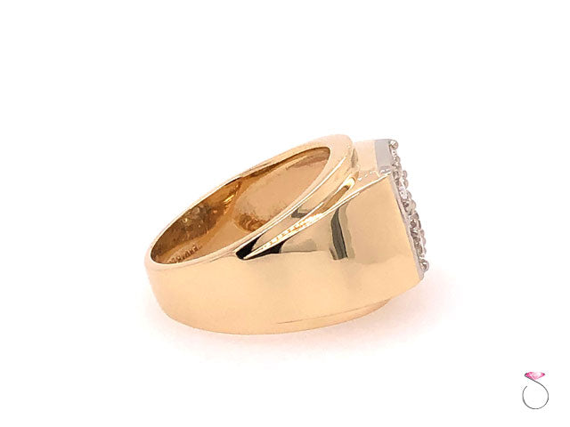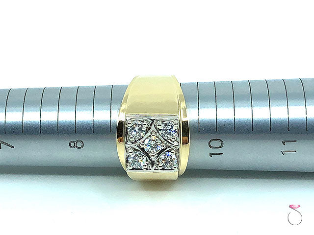 Elegant Men's Diamond Ring in 14K yellow Gold and Platinum. The ring features 5 round brilliant cut diamonds set in Platinum. Each diamond measures approximately 4.00 mm and weights approximately 0.25 carat for a total weight of 1.25 carats. The diamonds are G in color and VS to SI in clarity. The body of the ring is built in 14K yellow gold with high polish finish. The ring design features clean lines and the Platinum top ads to the diamonds natural sparkle. This ping would be ideal for a pinky ring as well as other fingers. This is a very well crafted ring, vintage in excellent condition. The ring is Hallmarked "EREV" stamped "14K" "PL" on the inside. The total weight of the ring is 13.50 grams. This ring is size 9.50 (re-sizing is available for a fee).