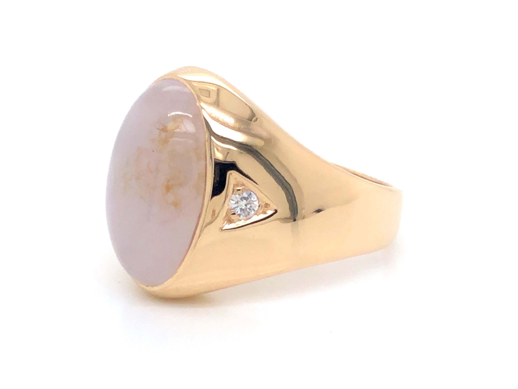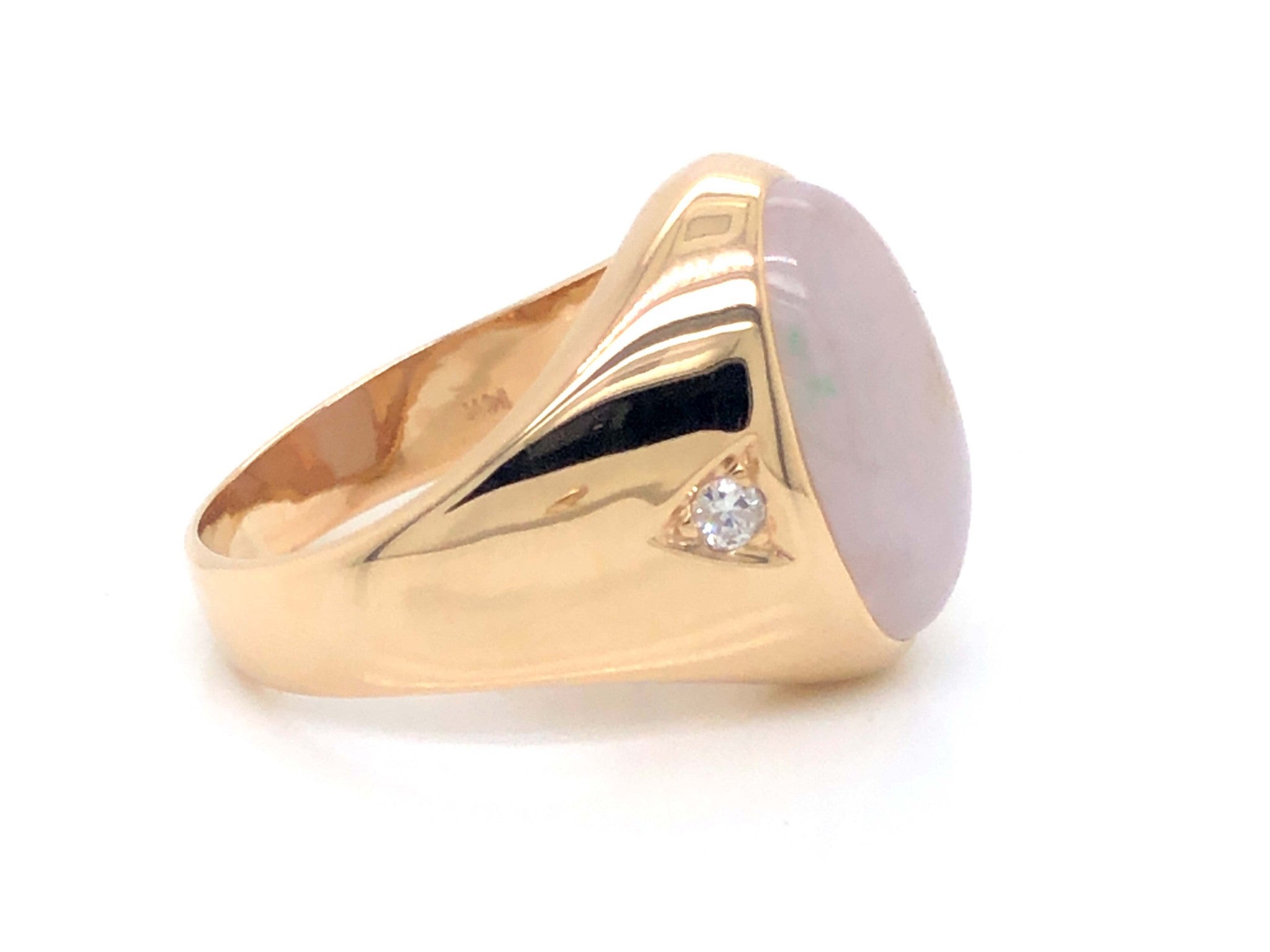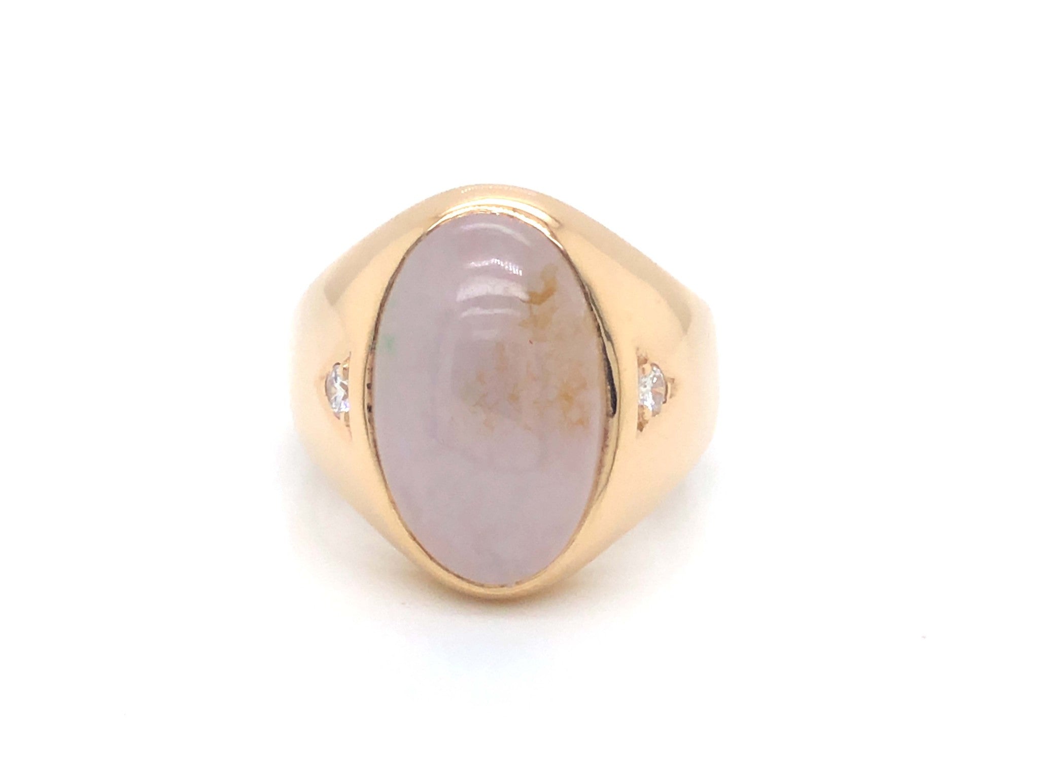 Men's Oval White Jade Diamond Ring - 14k Yellow Gold. This gorgeous white jade feature a transluscent white color with a brown zone, giving the beautiful gem charachter and style. The jade measures approximately 17.20 mm x 11.12 mm x 6.47 mm. The ring has a total of 2 round brilliant diamonds, bead set. The diamonds total ~0.10 carats, G in color and SI1 in clarity. The ring has a tapered shank with a high polish finish. The ring is size 8.75 and can be easily re-sized for a small fee. Stamped "14k" on the inside. Total weight is 10 grams. Preowned in very good condition.