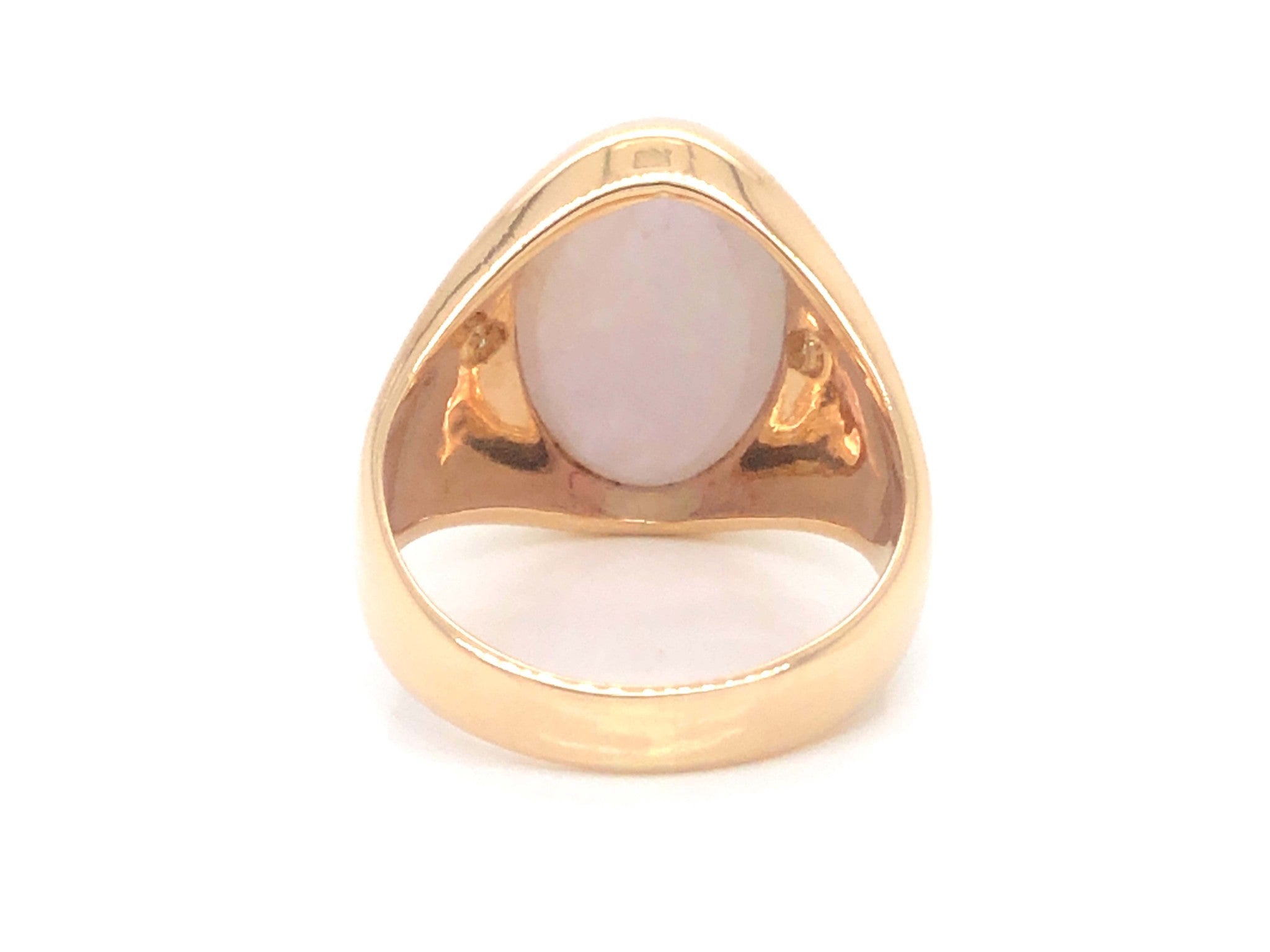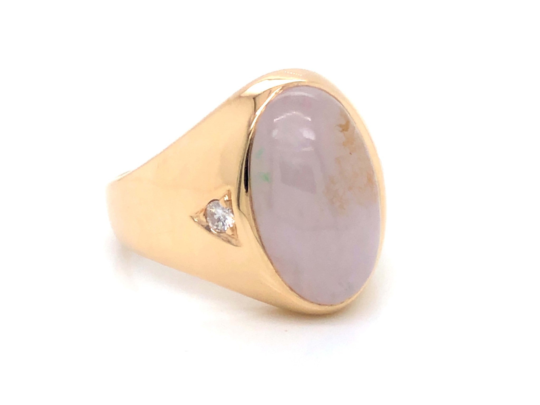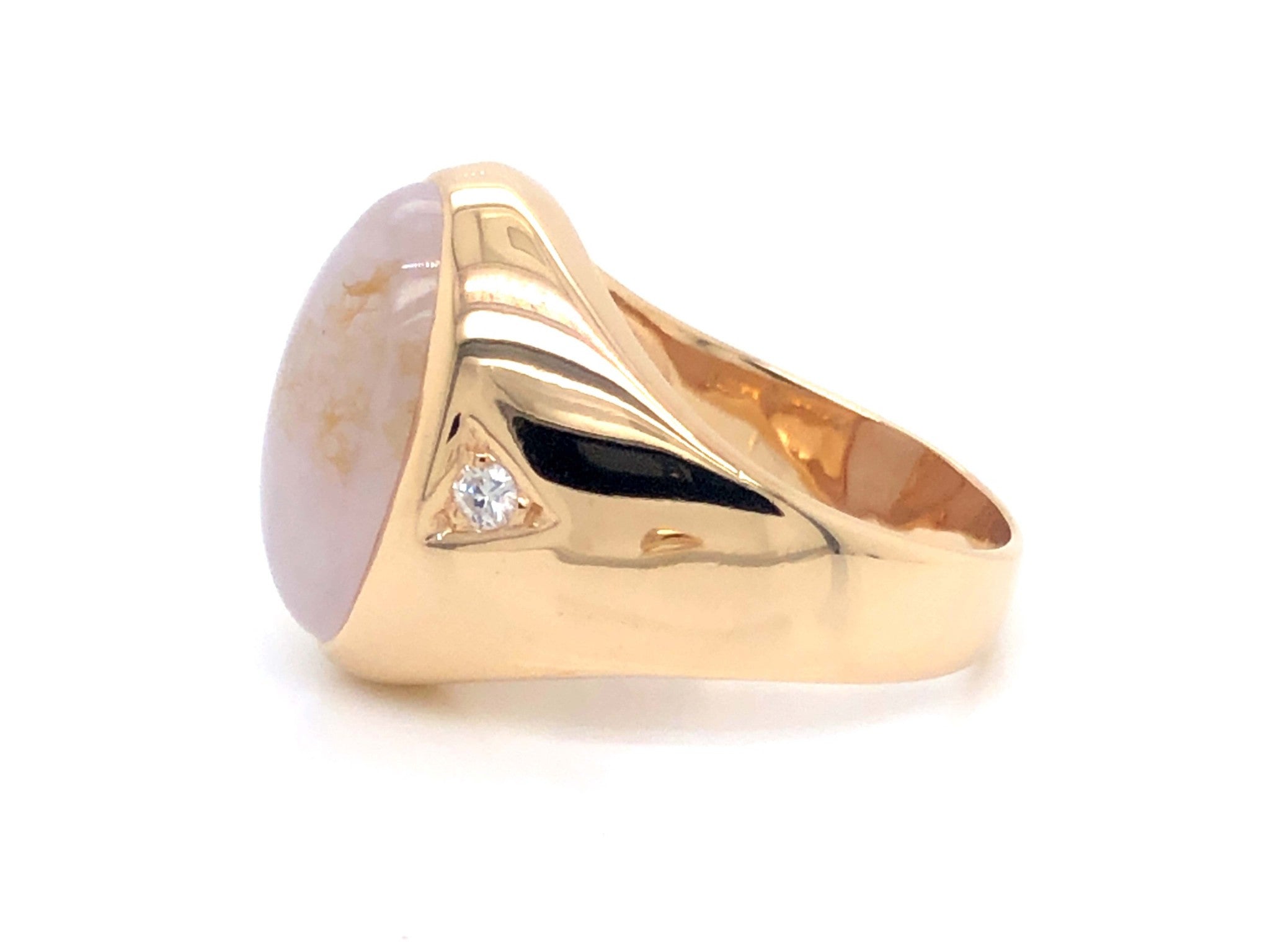Men's Oval White Jade Diamond Ring - 14k Yellow Gold. This gorgeous white jade feature a transluscent white color with a brown zone, giving the beautiful gem charachter and style. The jade measures approximately 17.20 mm x 11.12 mm x 6.47 mm. The ring has a total of 2 round brilliant diamonds, bead set. The diamonds total ~0.10 carats, G in color and SI1 in clarity. The ring has a tapered shank with a high polish finish. The ring is size 8.75 and can be easily re-sized for a small fee. Stamped "14k" on the inside. Total weight is 10 grams. Preowned in very good condition.