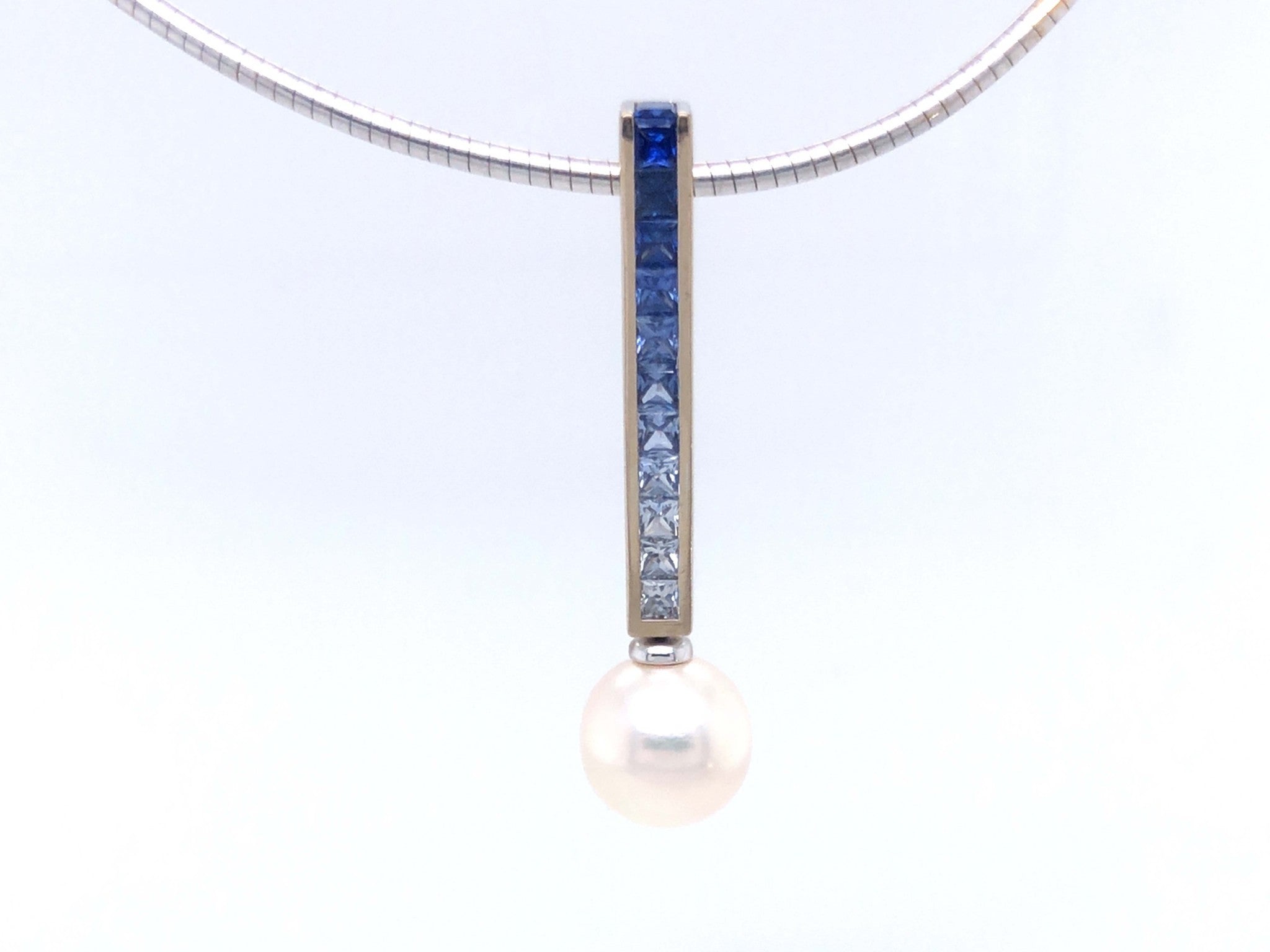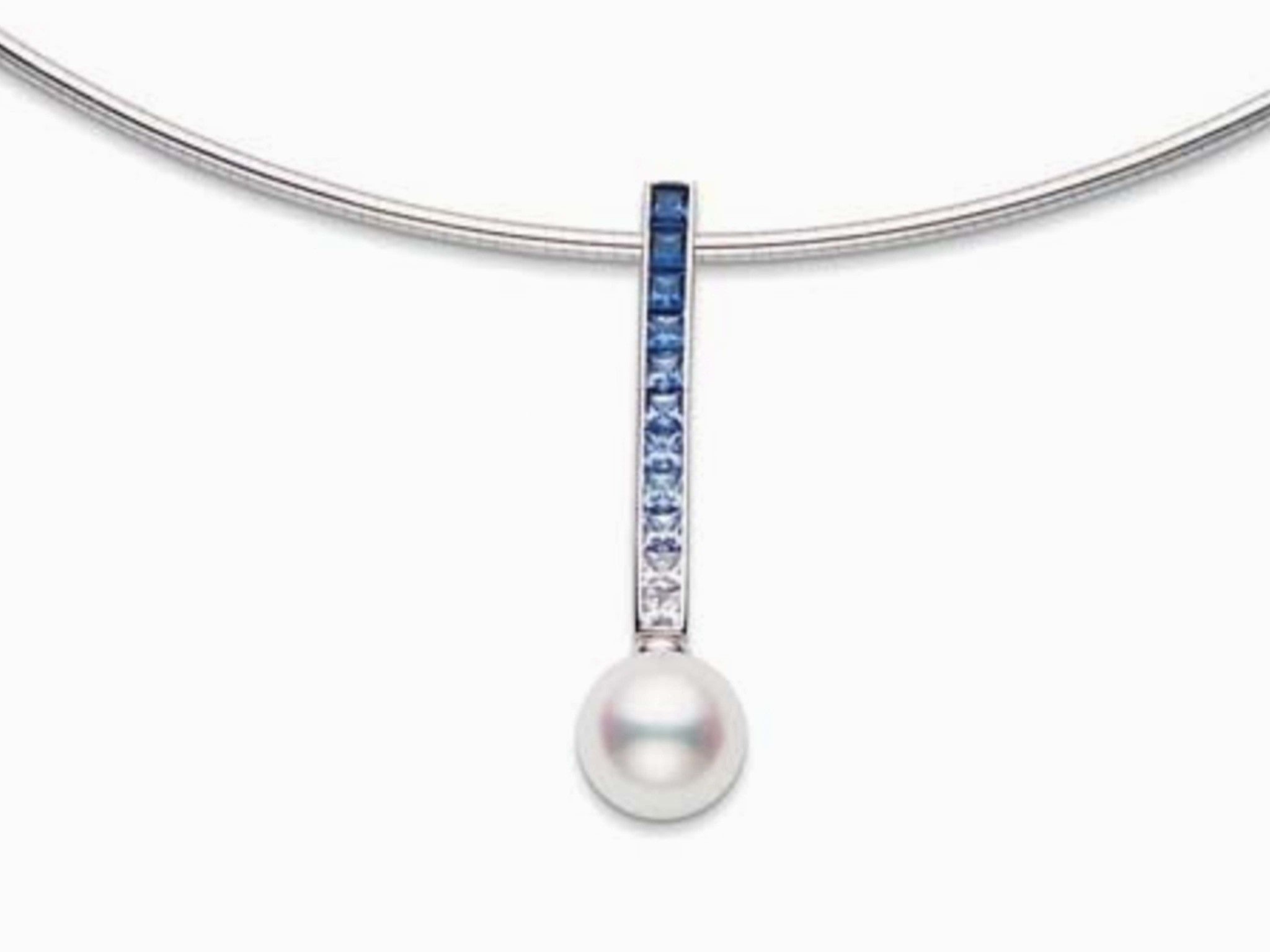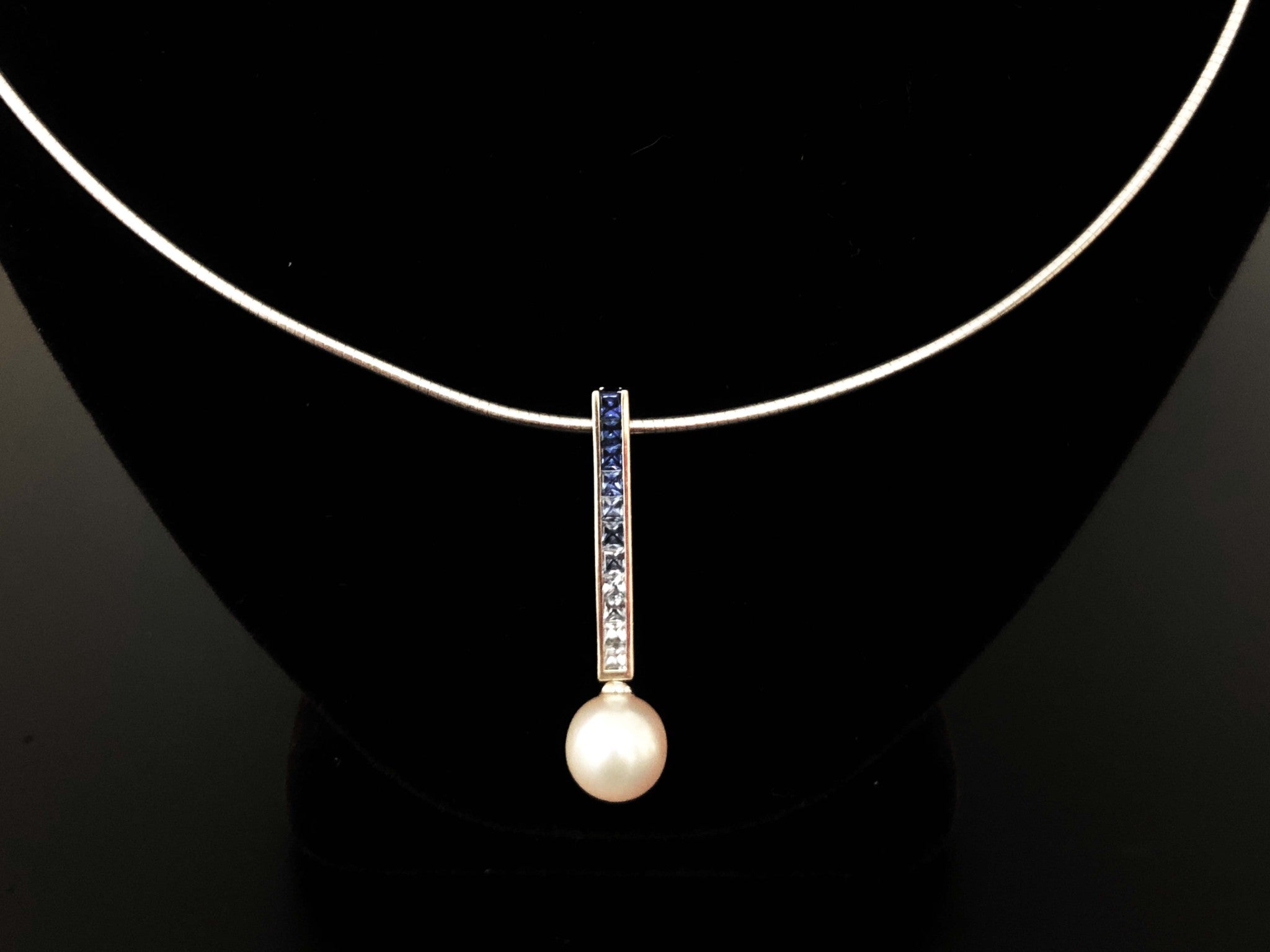 For those inspired by the ocean, this Mikimoto necklace is just exhilarating. Deep blue sapphires gradually fade into a stunning 8mm Akoya crafted in 18kt white gold. The piece floats on an 16" snake chain. The pendant and chain is crafted in 18k white gold. The pendant measures 3 mm wide and drops 30 mm down from the chain. Altogether the pendant and chain weigh 12.5 grams. The pendant is hallmarked "M" and stamped "750". The bail is also stamped "750." The necklace is vintage in very good condition. (The back of the pearl has a slight orange discoloration).