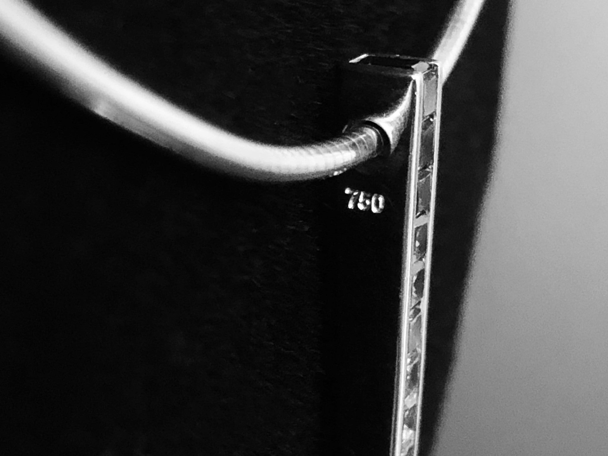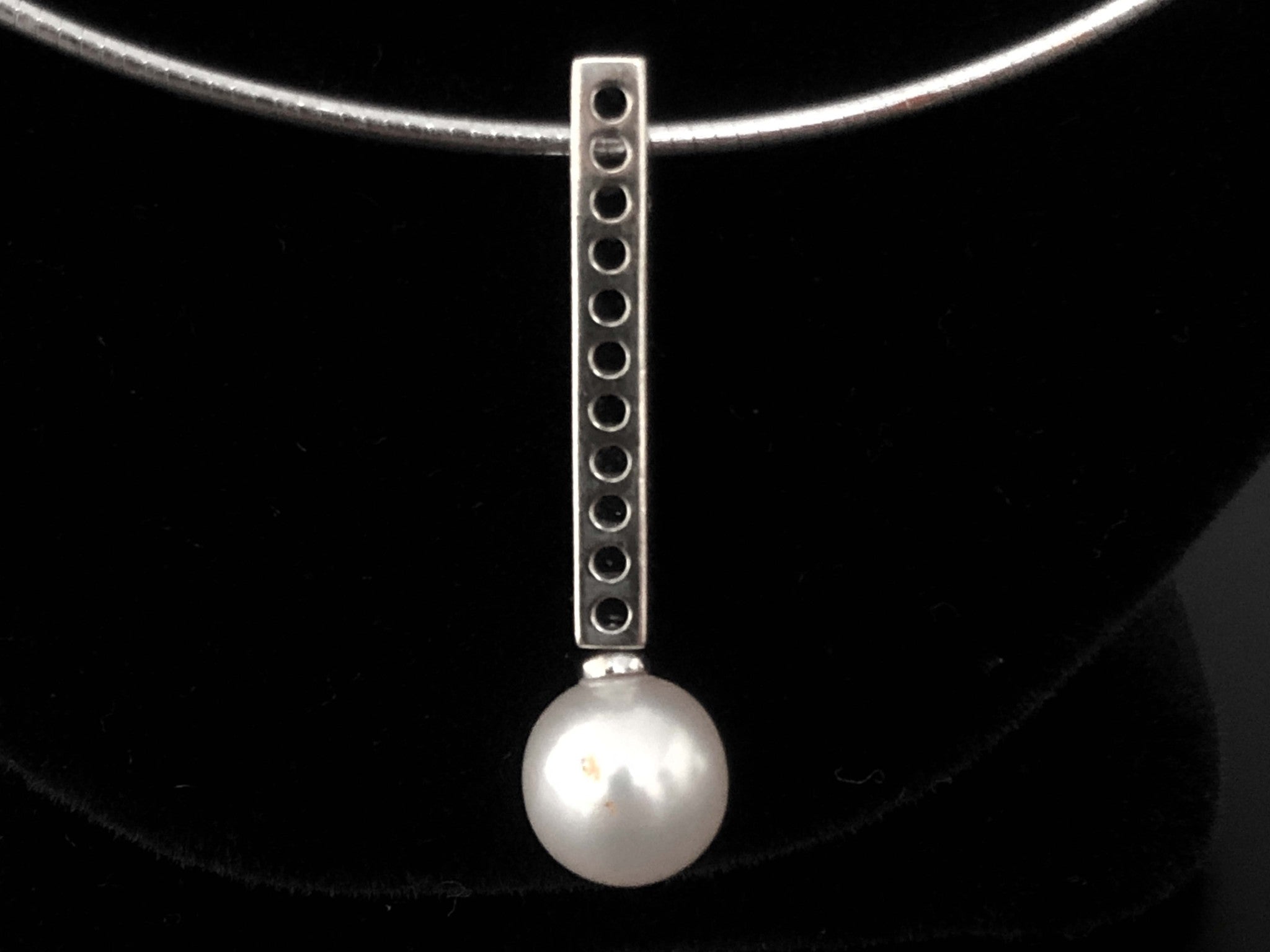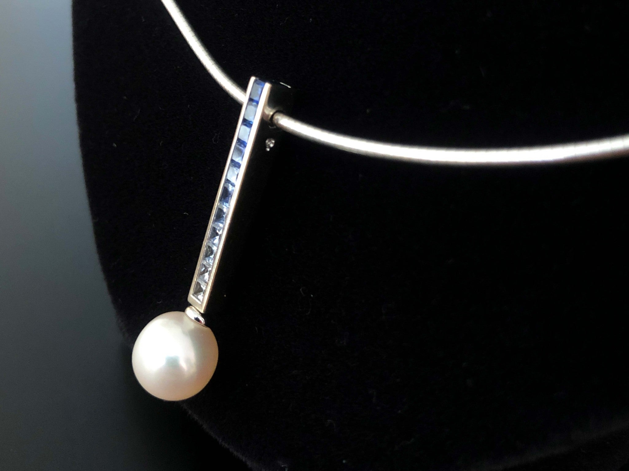 For those inspired by the ocean, this Mikimoto necklace is just exhilarating. Deep blue sapphires gradually fade into a stunning 8mm Akoya crafted in 18kt white gold. The piece floats on an 16" snake chain. The pendant and chain is crafted in 18k white gold. The pendant measures 3 mm wide and drops 30 mm down from the chain. Altogether the pendant and chain weigh 12.5 grams. The pendant is hallmarked "M" and stamped "750". The bail is also stamped "750." The necklace is vintage in very good condition. (The back of the pearl has a slight orange discoloration).