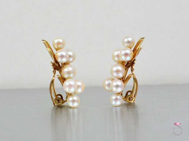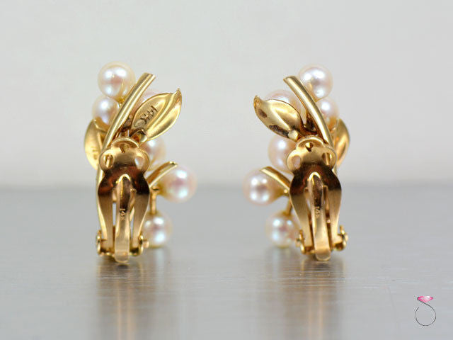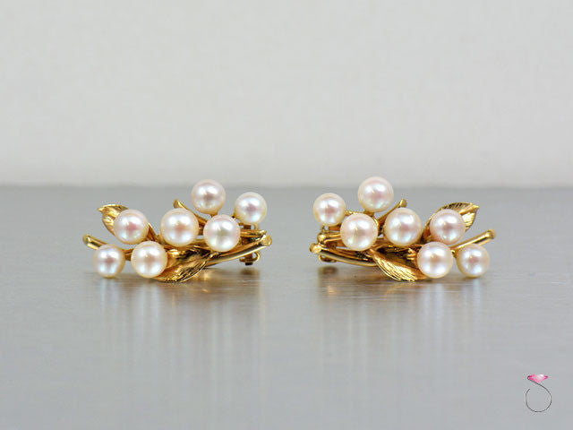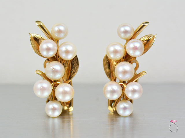 A gorgeous MING'S HAWAII earrings. This beautifully designed earrings features 7 white Akoya pearls on each side in a botanical "branch and leaf" design. Made in 14k yellow gold with very intricate work. The Ming's earrings are one inch long with clip backs. The back of the earrings is hallmarked Ming's and 14k.