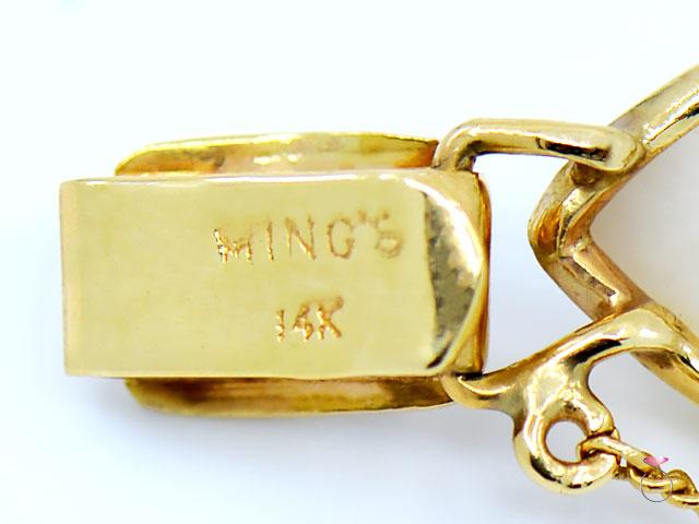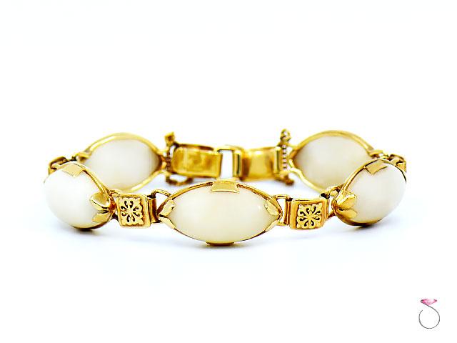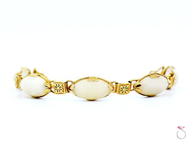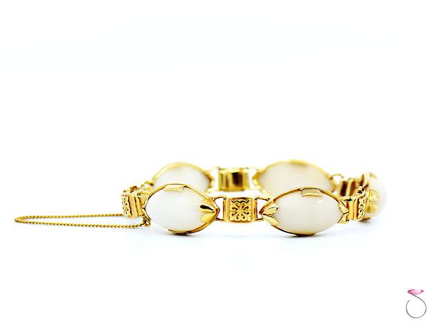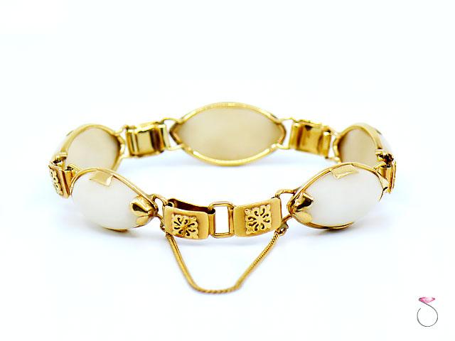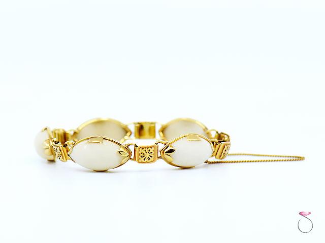 Beautiful vintage Ming's Hawaii white jade sectional bracelet in 14k yellow gold. The Bracelet features 5 cabochon navette shape white jade pieces seperated by a square link with a raised hawaiian quilt design. This bracelet is hinged for flexibility between sections. Each piece of jade measures approximately 20mm x 12mm x 5.80mm. The bracelet has a latch clasp and a security chain for added security. This is a beautifully crafted vintage Ming's bracelet in very good condition. The Bracelet is 12 mm wide, 6.50 inches long and the total weight 22.30 grams. The bracelet is Hallmarked "Ming's" & stamped "14K".