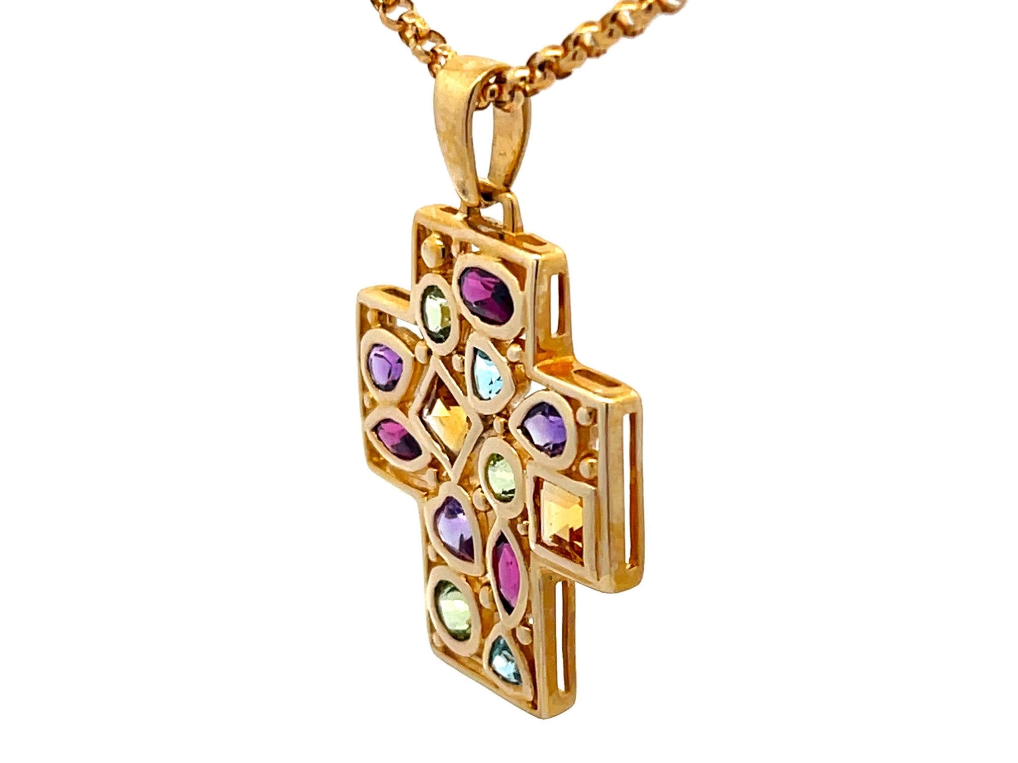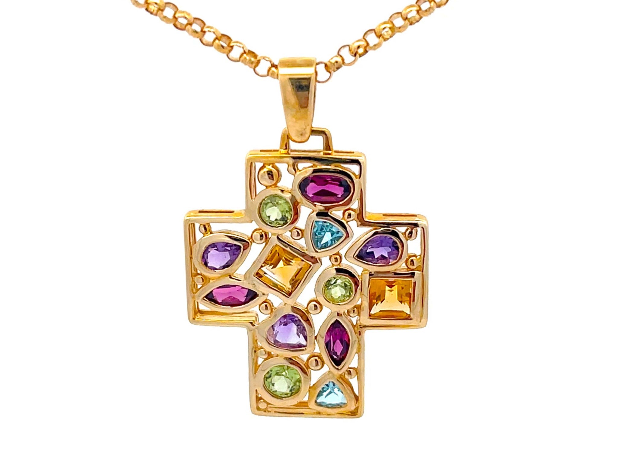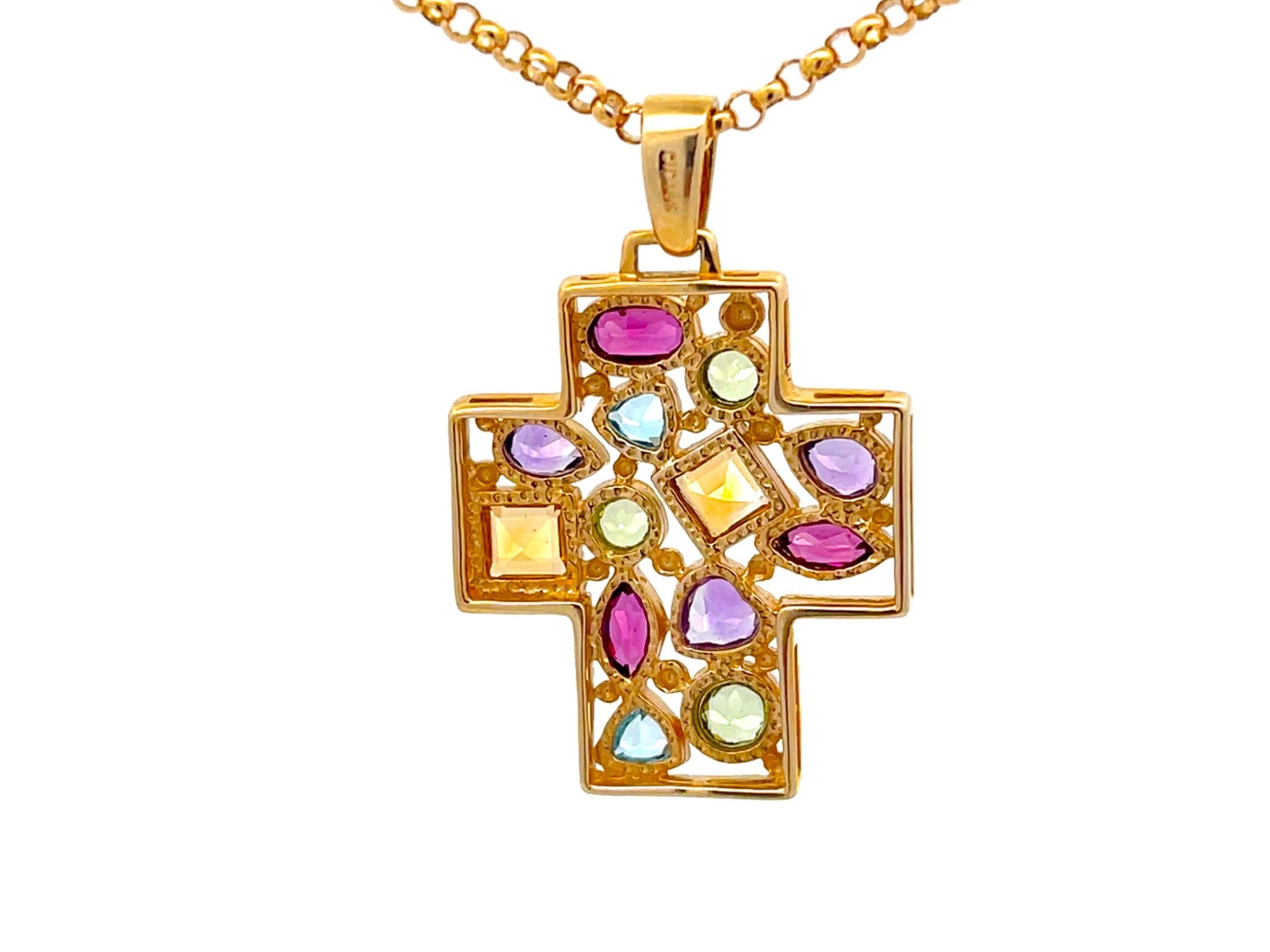 Gemstones: 3 green peridot, 3 purple amethyst, 3 burgundy garnet, 2 blue topaz, 2 yellow citrine
