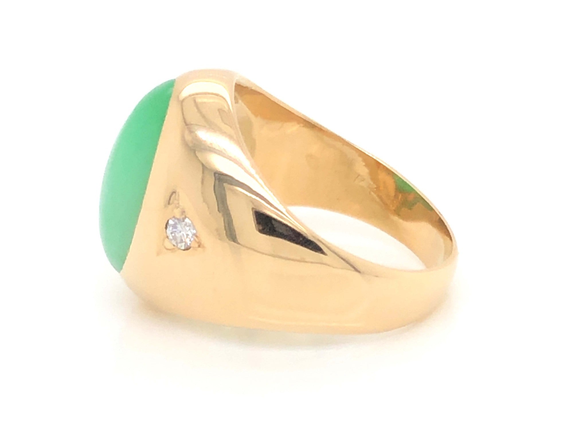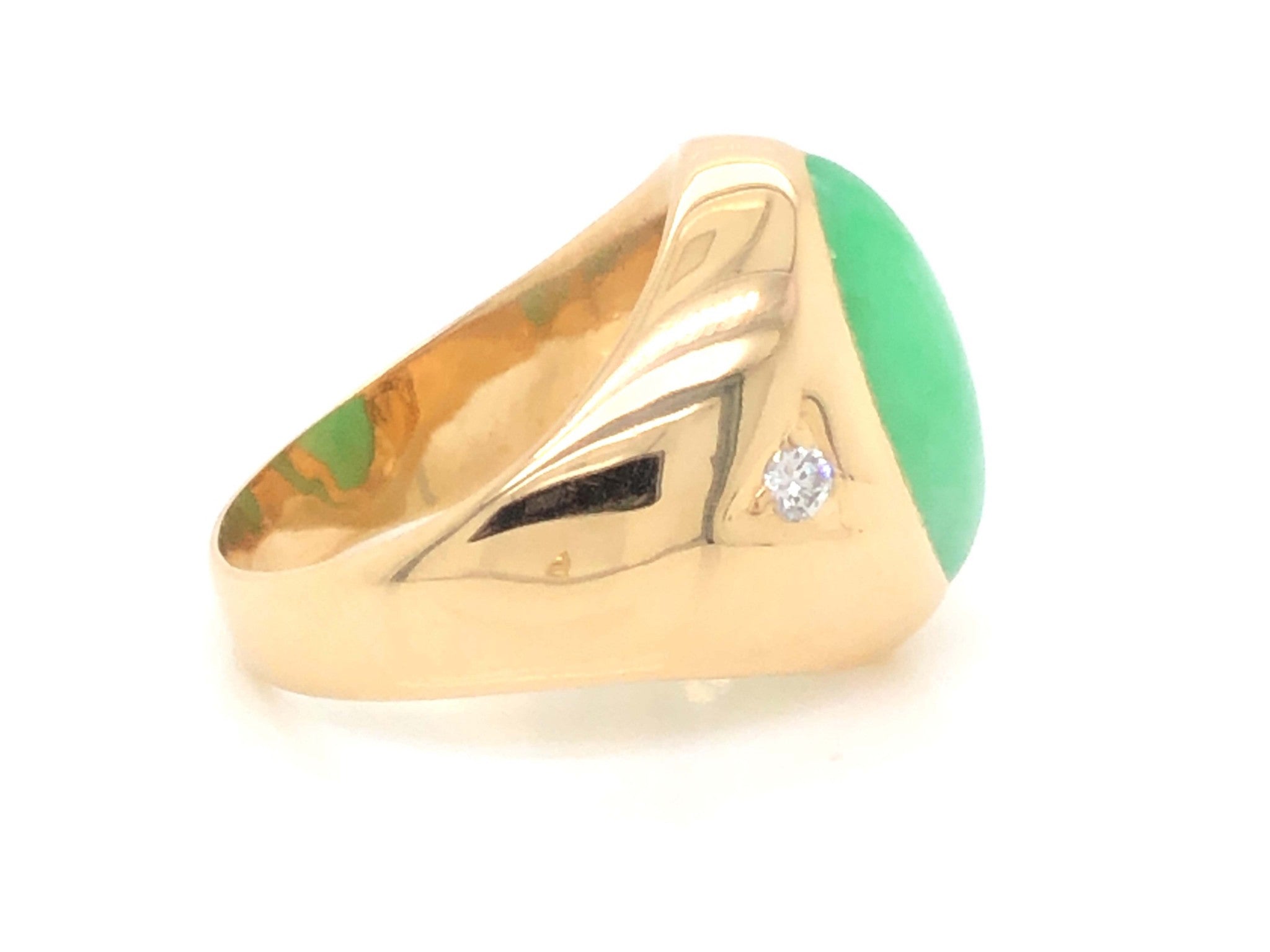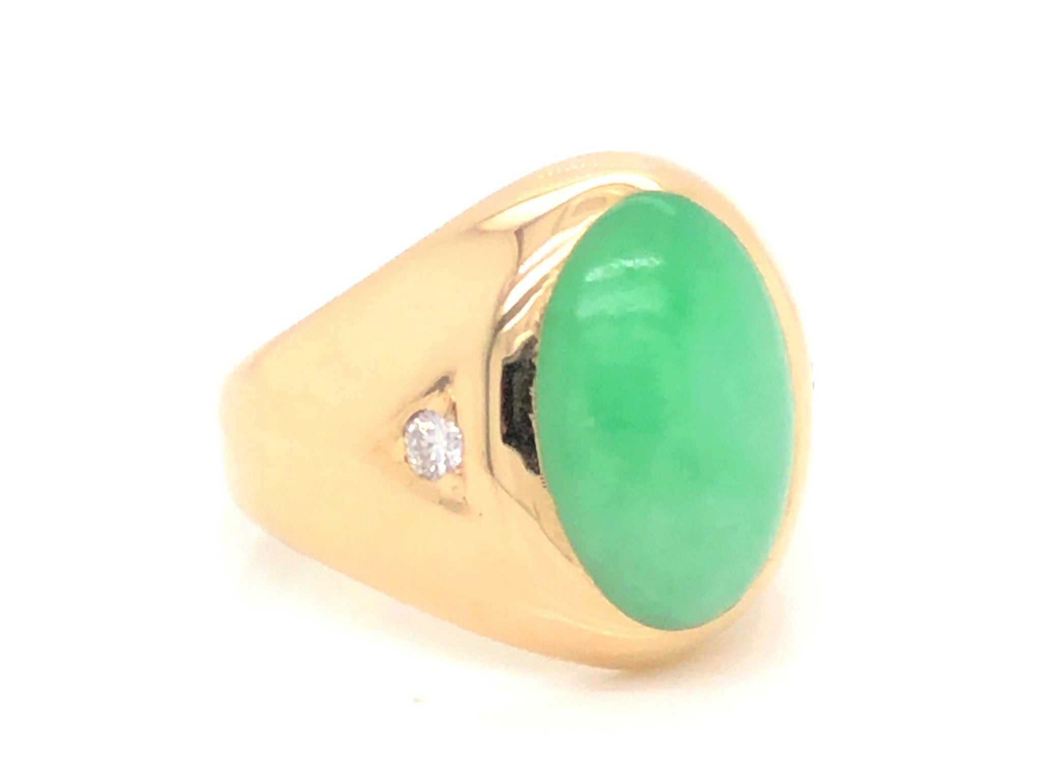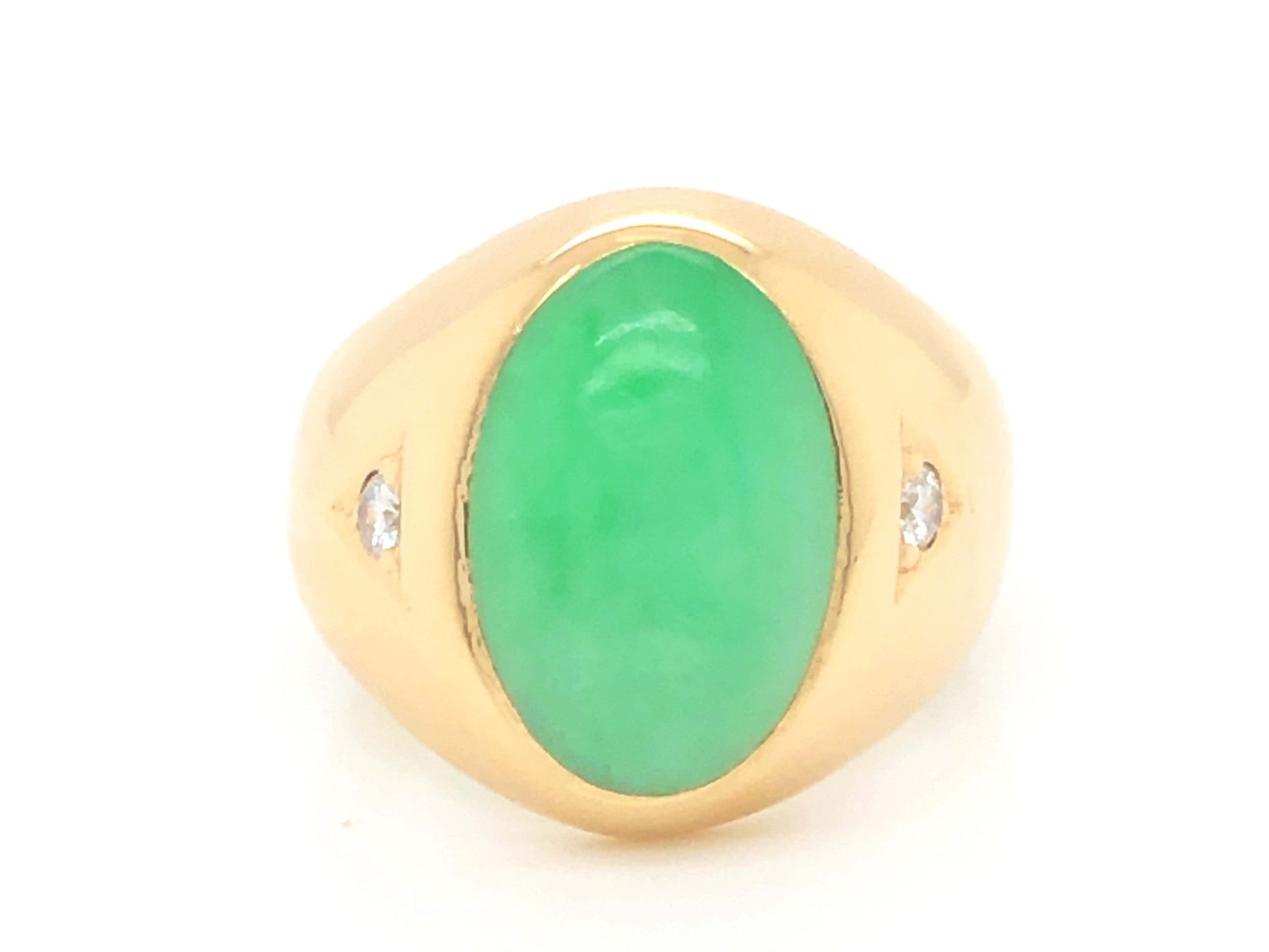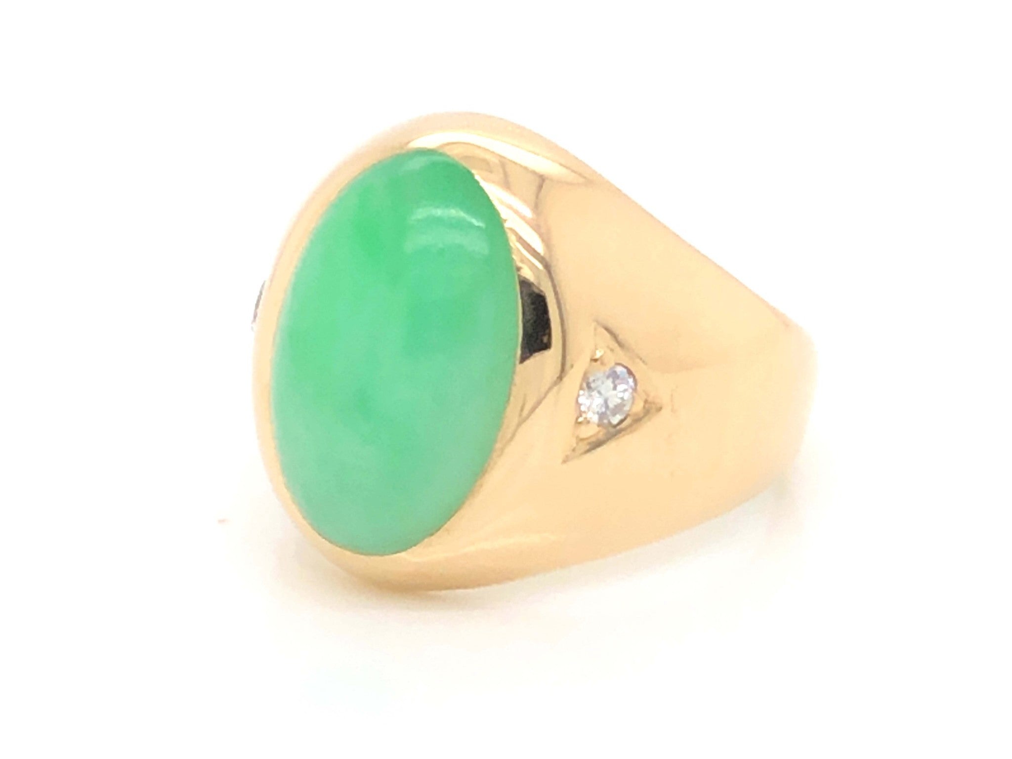 Oval Green Jade and Diamond Ring in 14k Yellow Gold. This stunning jade has a one-of-a-kind green color with beautiful translucency. The Jade measures approximately 14.99 mm x 9.76 mm x 4.22 mm. The ring has a total of 2 diamonds. The diamonds total weight is ~0.10 carats, G in color and VS2 in clarity. The ring has a tapered shank with a high polish finish. The ring is size 8 and can be easily re-sized for a small fee. Stamped "14k" on the inside. Total weight is 10 grams. Preowned in very good condition.