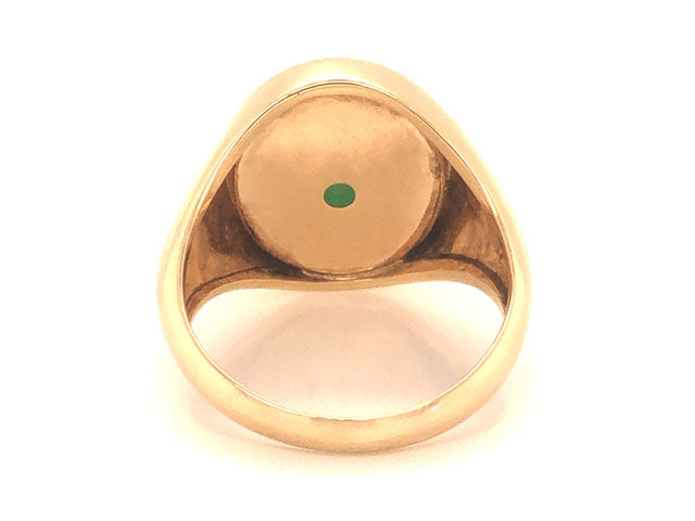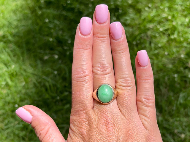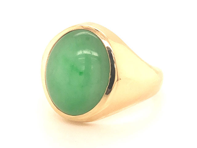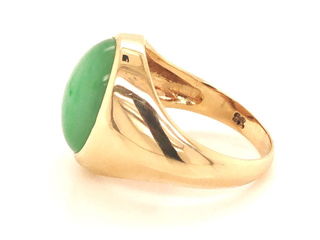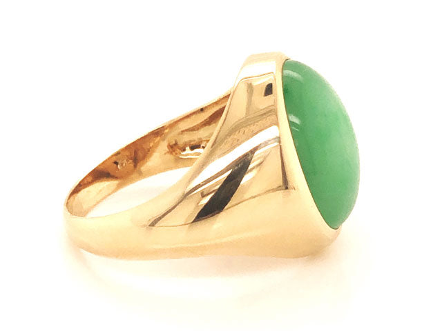 Oval shape cabochon green jade ring, bezel set in 14k yellow gold. The Jade measures approximately 17.06 mm x 12 mm x 6.02 mm with an estimated weight of 9.01 carats. The ring has a rounded tapered shank with a high polish finish. The ring is size 8.25 and can be easily re-sized for a small fee. Stamped "14k" on the inside. Total weight is 7.1 grams. Preowned in very good condition.