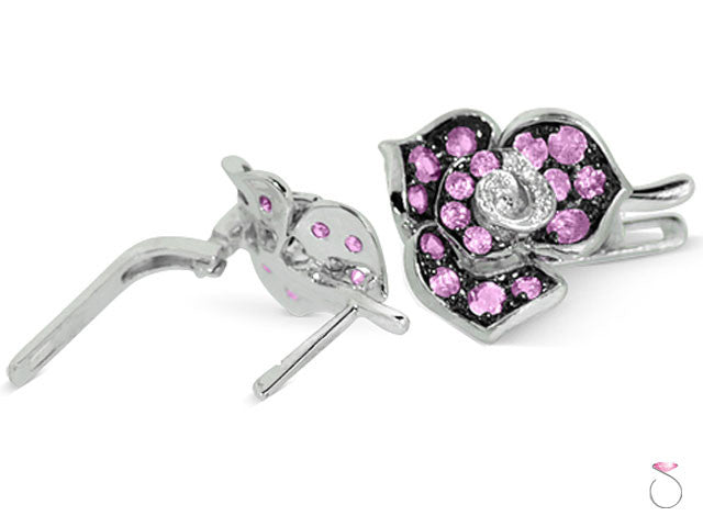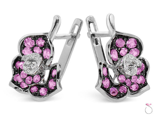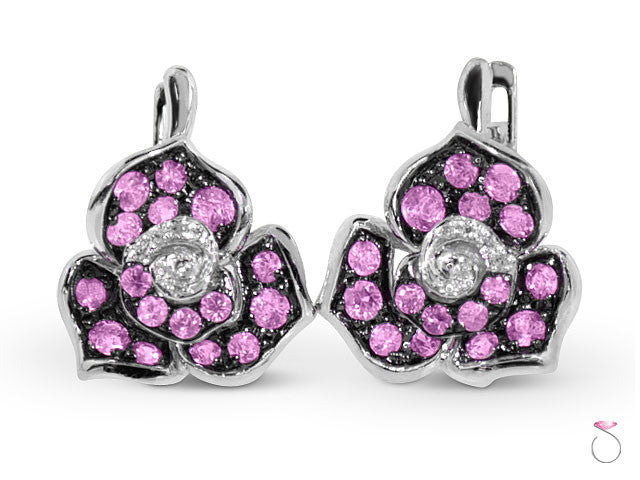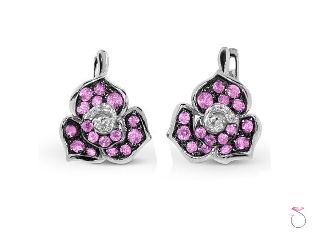 Charming pink sapphire and diamonds flower earrings in 14K white gold. The pink sapphires and diamonds are Bead set on white gold with black rhodium finish. The vibrant pink Sapphires atr contrasted by the black rhodium and the brilliant diamonds creating a fascinating look of sparkle, shadow and color.| ITEM DETAILS | EARRINGS |