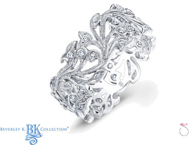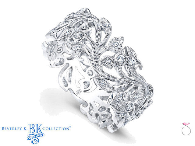 This stunning floral Beverley K diamond band, known as the "Tree of Life" of 18K white gold is stylishly finished with 0.38ct round diamonds and hand milgrain.