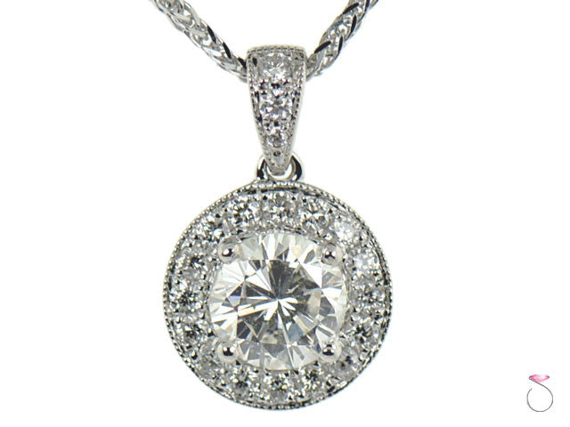 This magnificent diamond pendant, features a 1.03ct I, SI round brilliant diamond in the center and a .32ctw G, VS diamonds on the Halo & Bail with milgrain edges; The pendant comes with a matching 14K white fox tail chain measuring 17 inch.Item Details