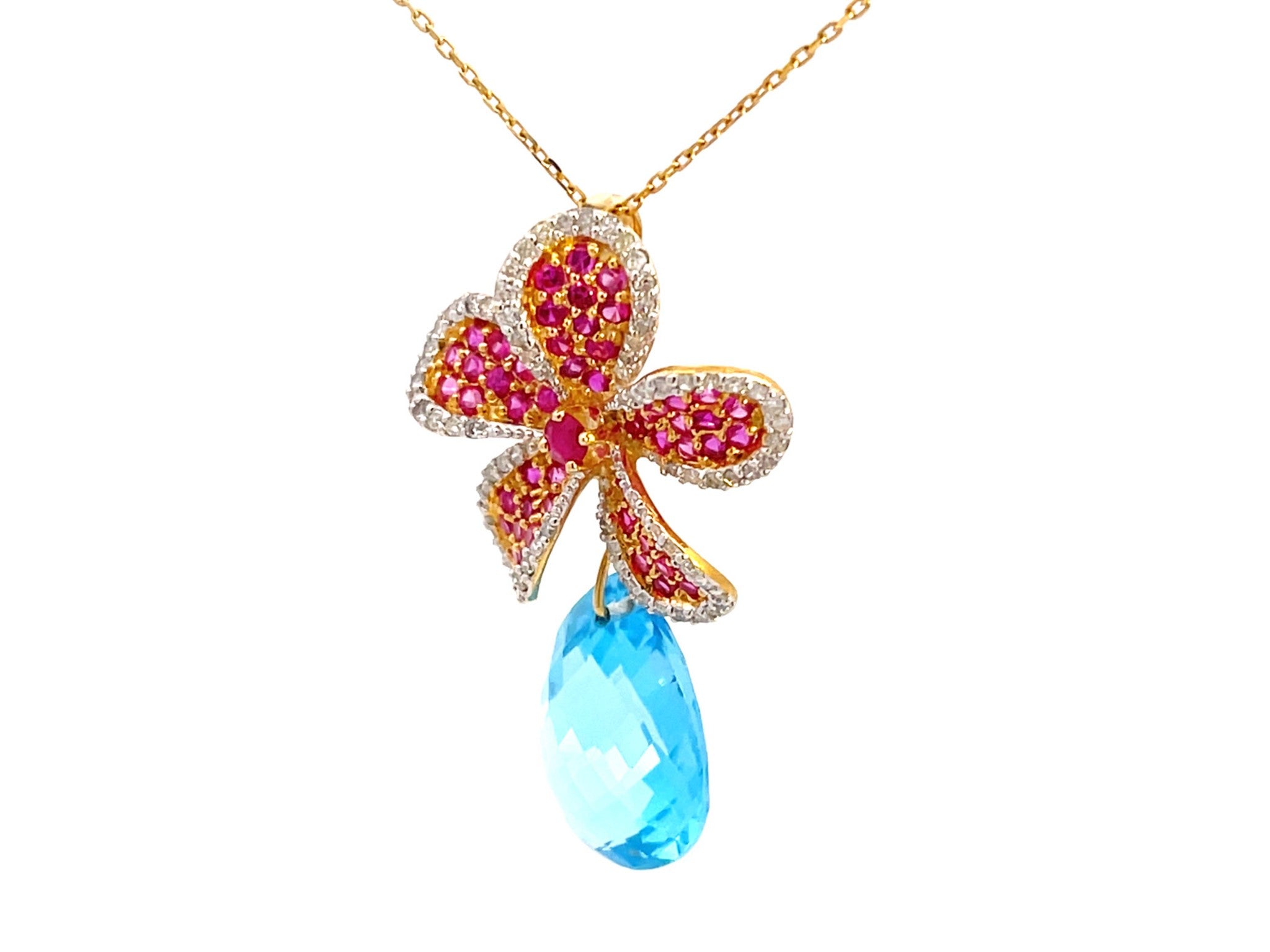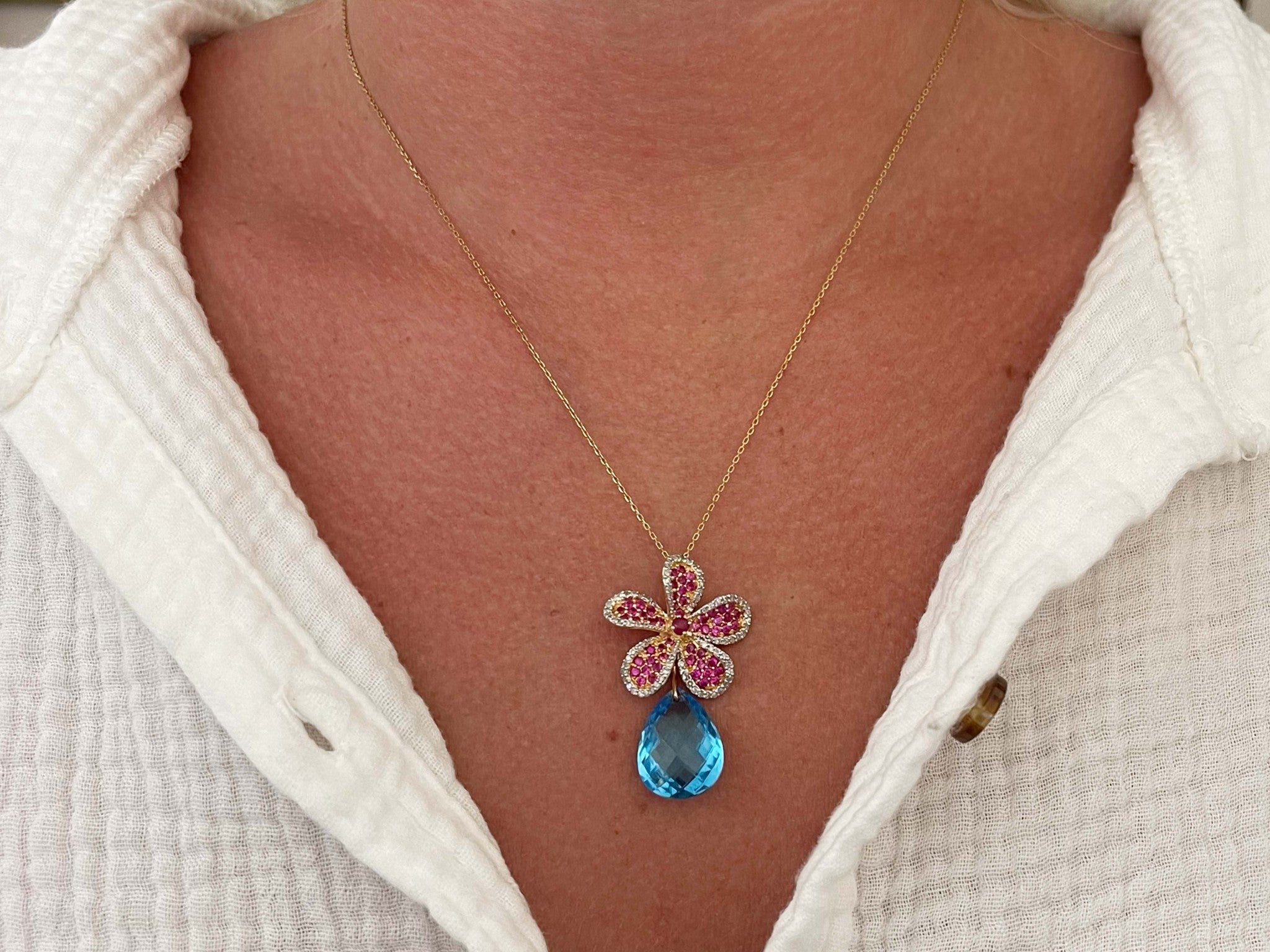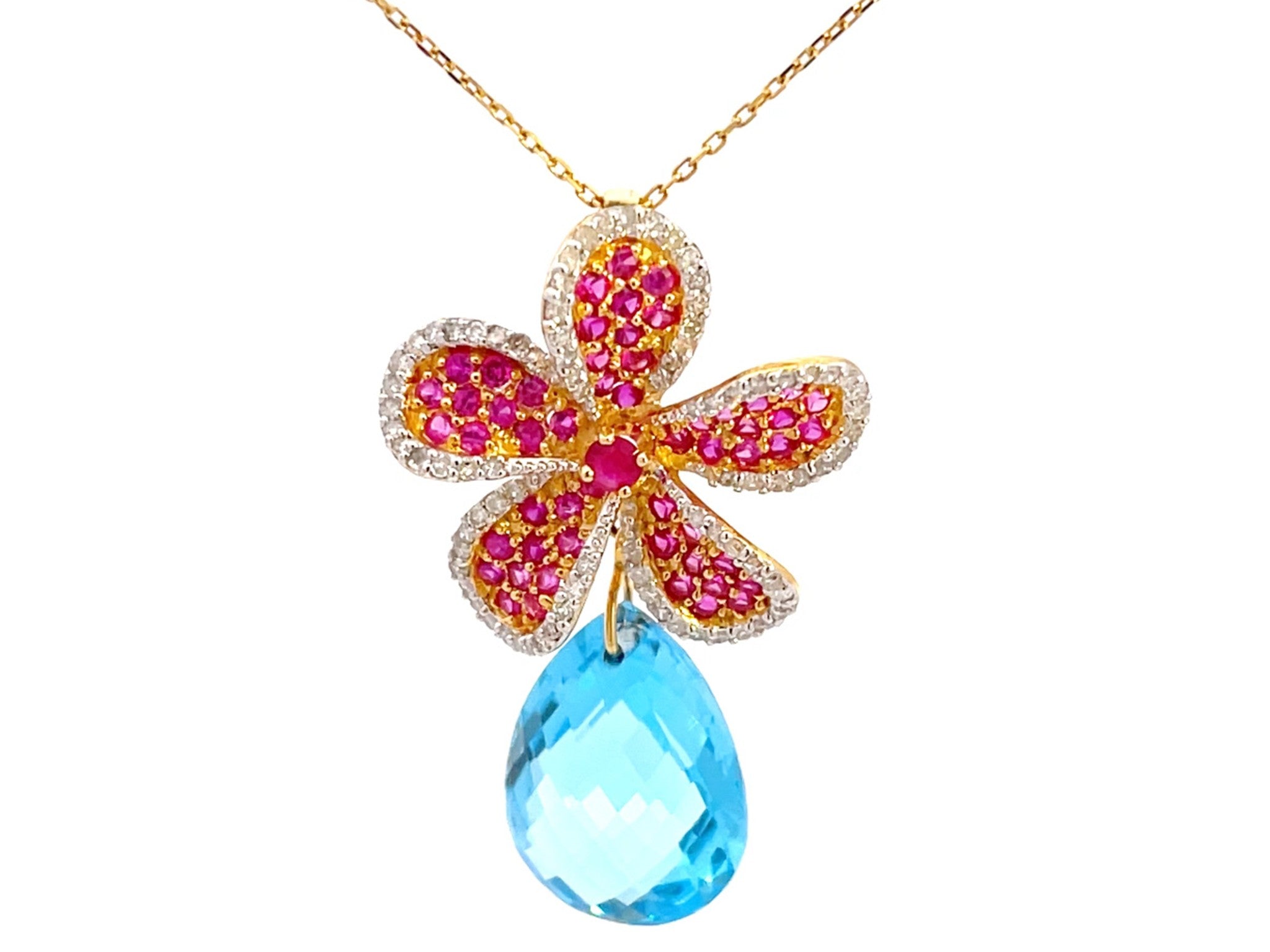 Style: Ruby Diamond Flower Necklace with Topaz Drop