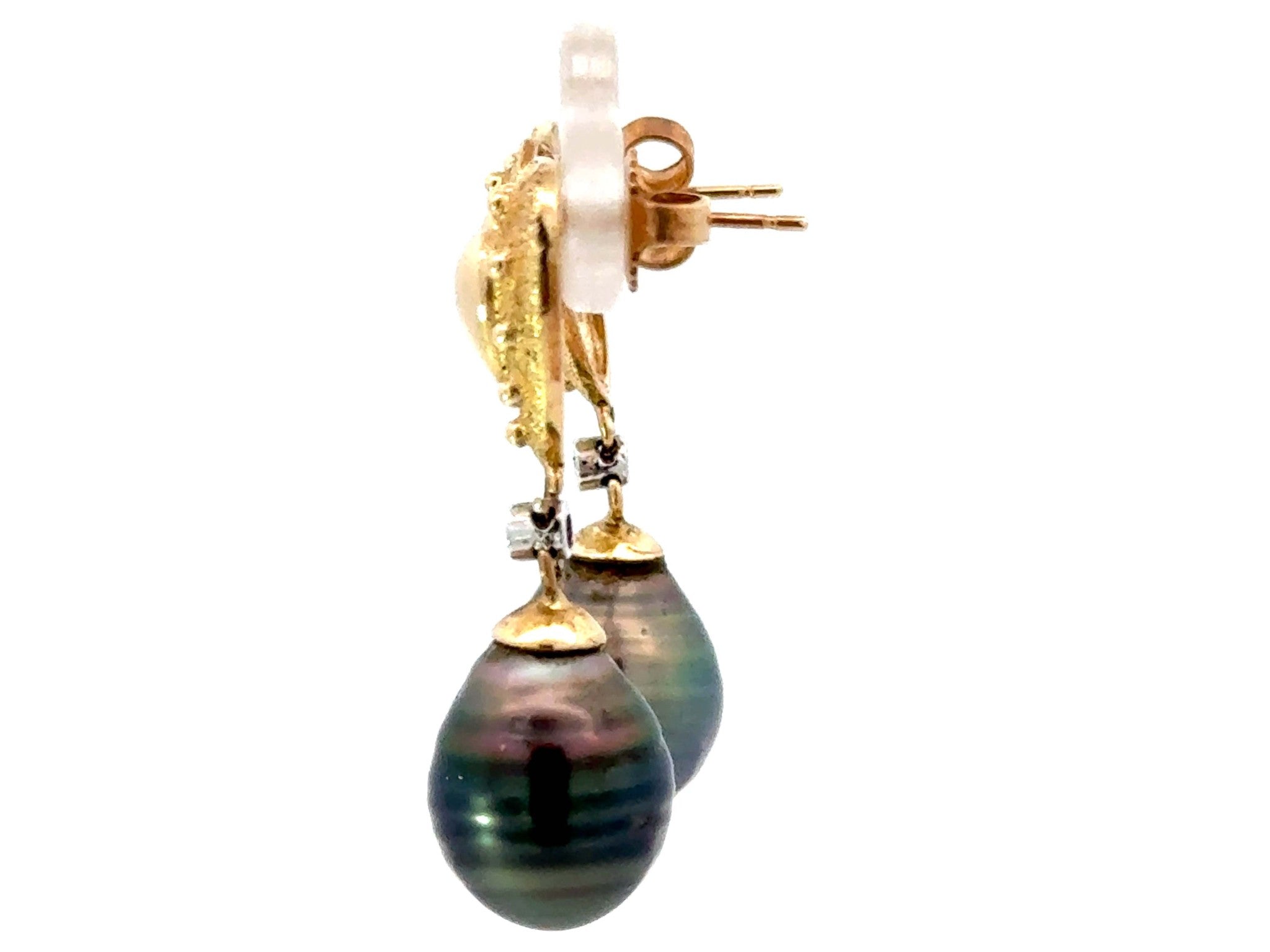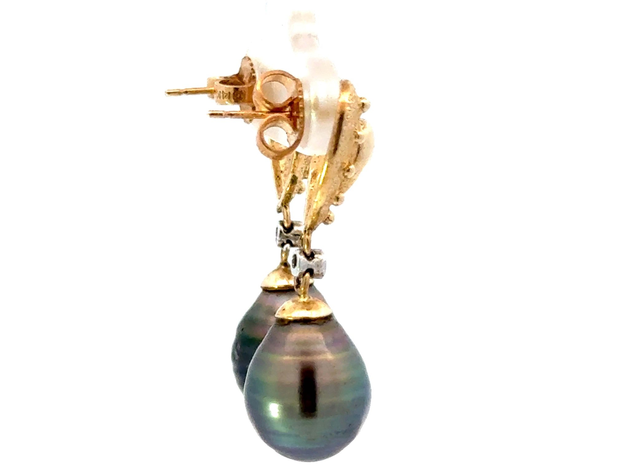These stunning Tahitian pearls feature yellow, green and blue hues.Earrings Specifications:Metal: 14k Yellow GoldEarring Length: 1.2" longTotal Weight: 6.6 GramsPearl Type: Tahitian pearlsPearl Diameter: 10 mm x 13 mmTotal Diamond Count: 2Total Carat...