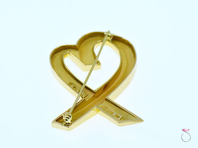 Elegant authentic Tiffany & Co. 18K yellow gold Loving Heart brooch by Paloma Picasso. This elegant brooch measures H 1.75 x W 1.25 inch. The brooch has a beautiful high polish finish. This is a beautifully designed brooch, pre-owned in excellent condition. Hallmarked "Tiffany &Co.", Signed " Paloma Picasso" & Stamped "750". Total Weight 19.90 Grams.